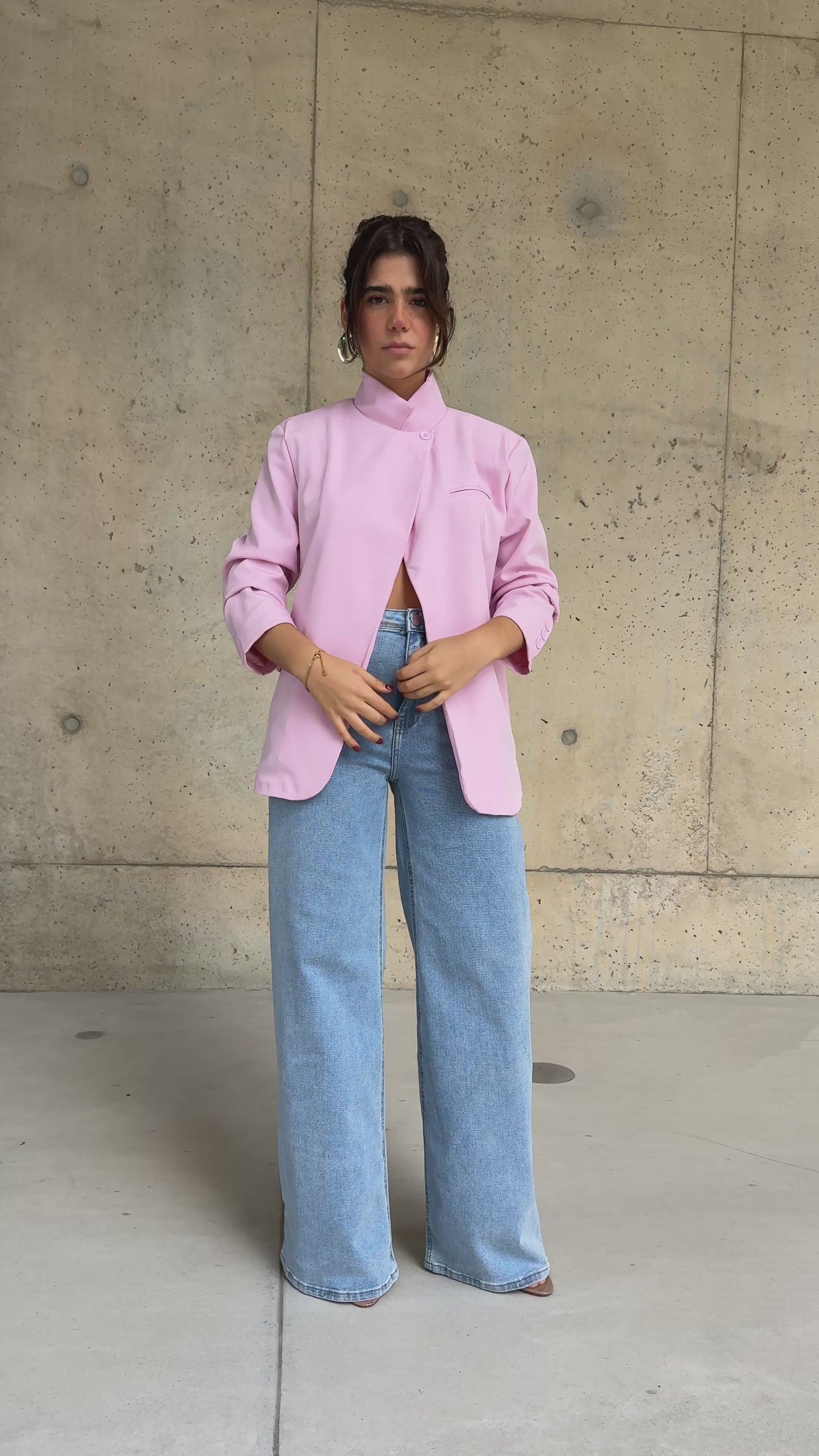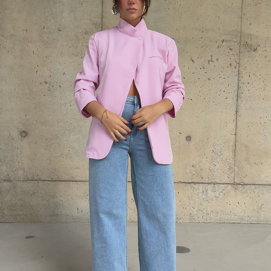 Blazer forrado, assimétrico, em rosa. Tem detalhe efeito lapela e bolsos. Aperta com botão na zona do pescoço. Veste do S ao L.