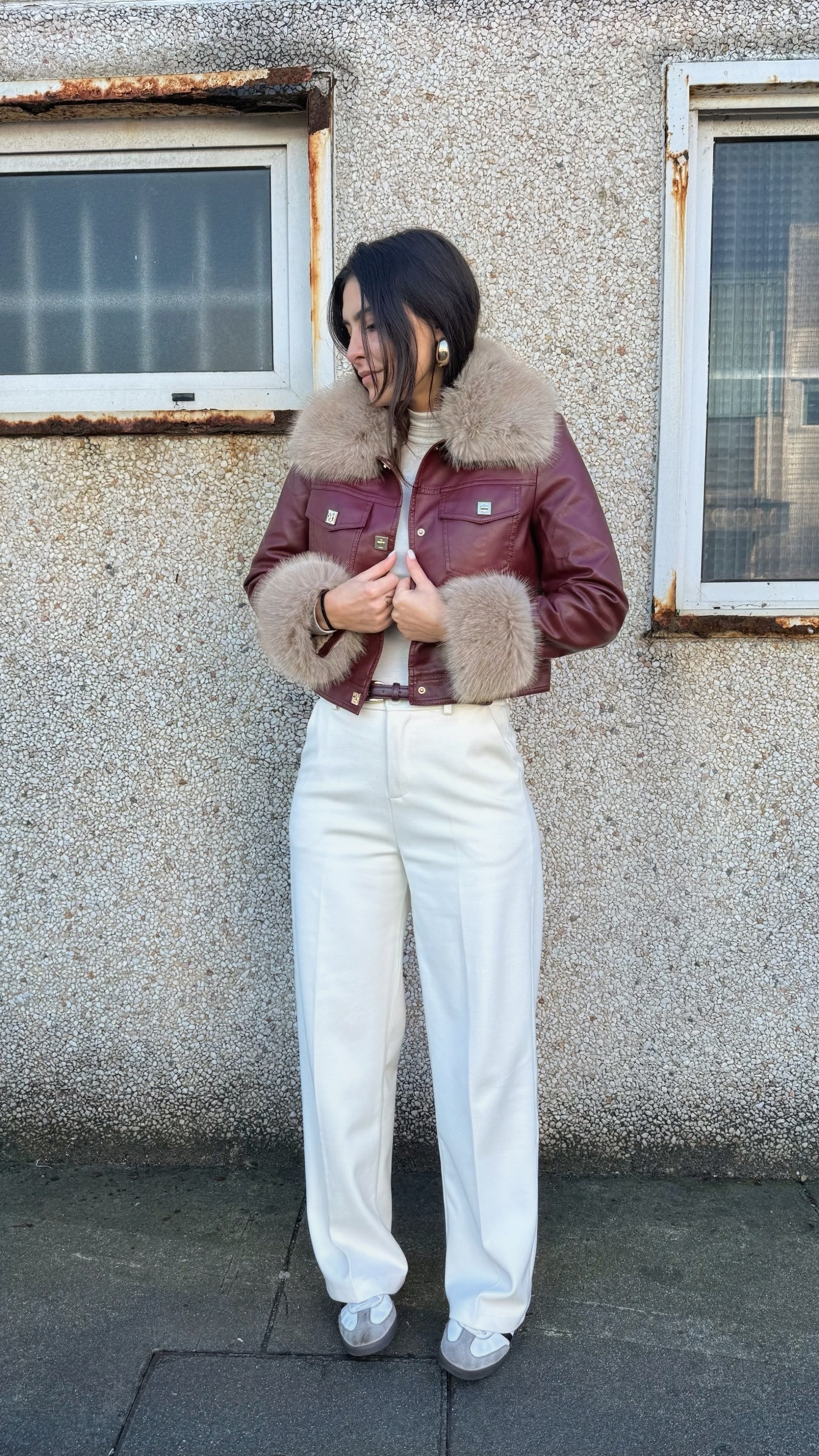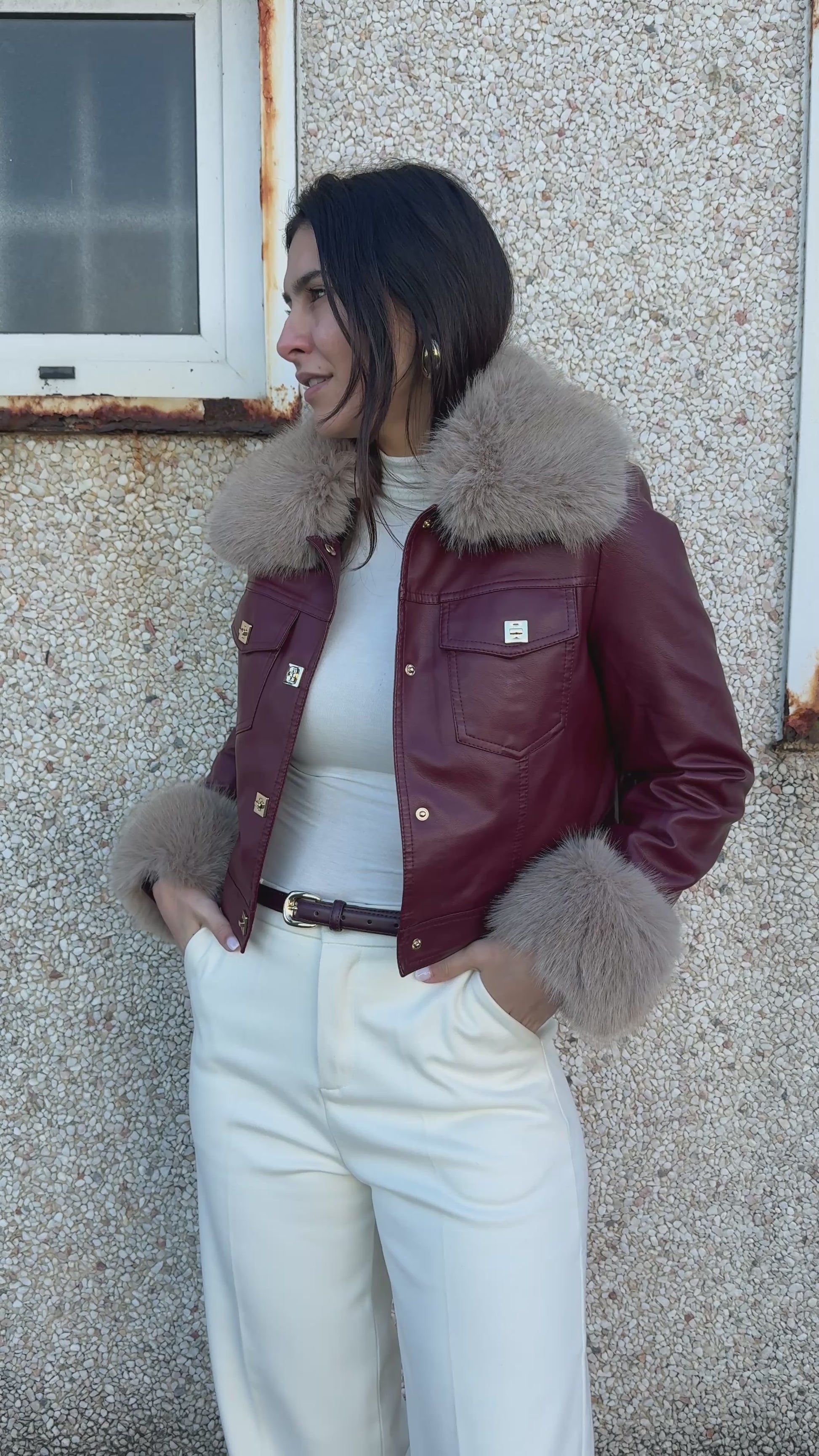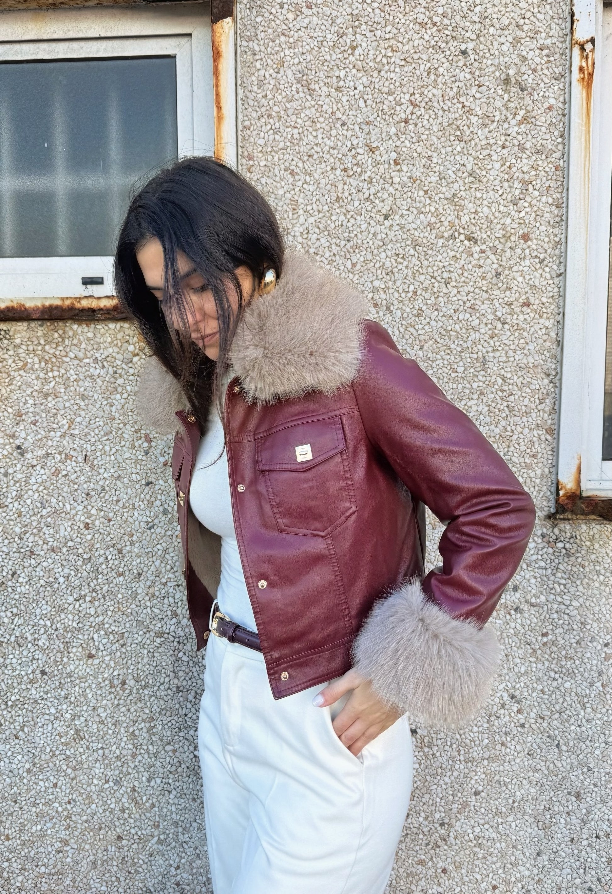 معطف من الجلد البيئي والفراء الصناعي. يتم تثبيته بأزرار زنبركية ذات تأثير جوهرة، ويحتوي على جيوب ومبطن. الفراء قابل للإزالة. يلبس صغيرًا.