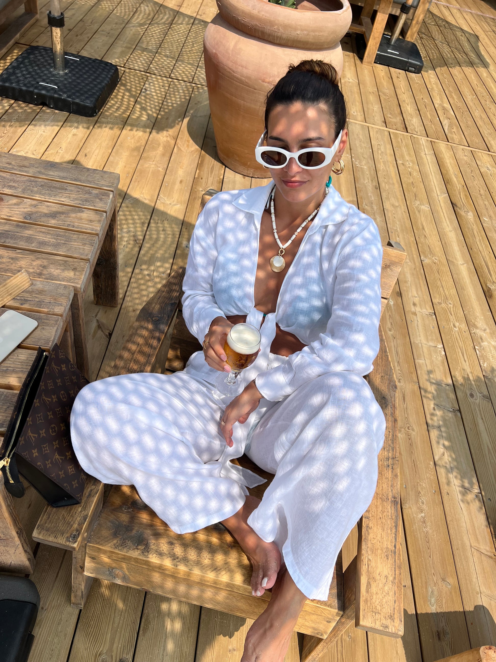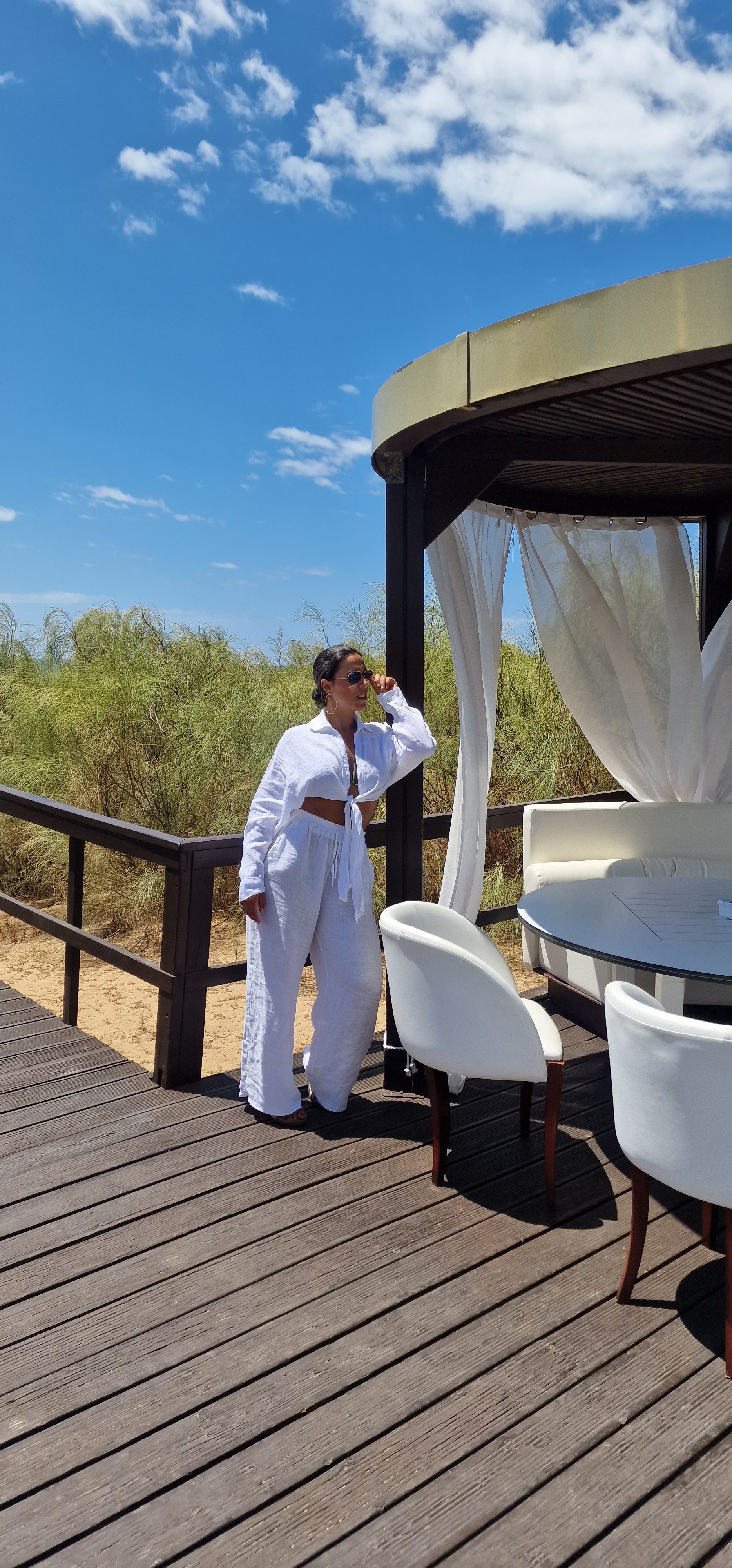 بنطلون كتان بقصة ساق واسعة. خصر مطاطي. بلوزة كتان قصيرة برباط.