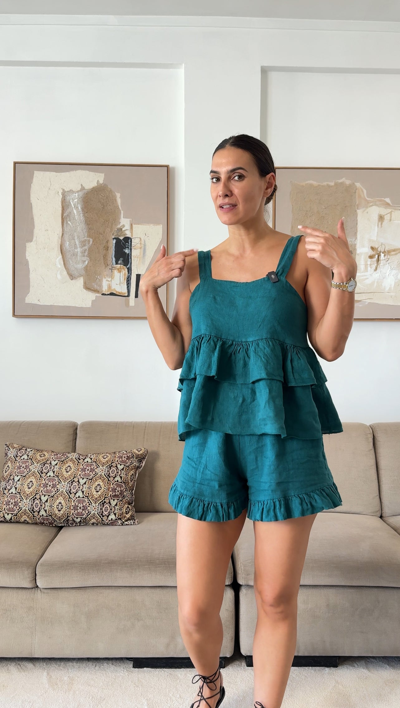 طقم بلوزة وشورت من الكتان ١٠٠٪. يُباع أيضًا بشكل منفصل. شورت بخصر مطاطي. توب بظهر مطاطي وحمالات قابلة للتعديل، بتصميم على شكل حرف A.