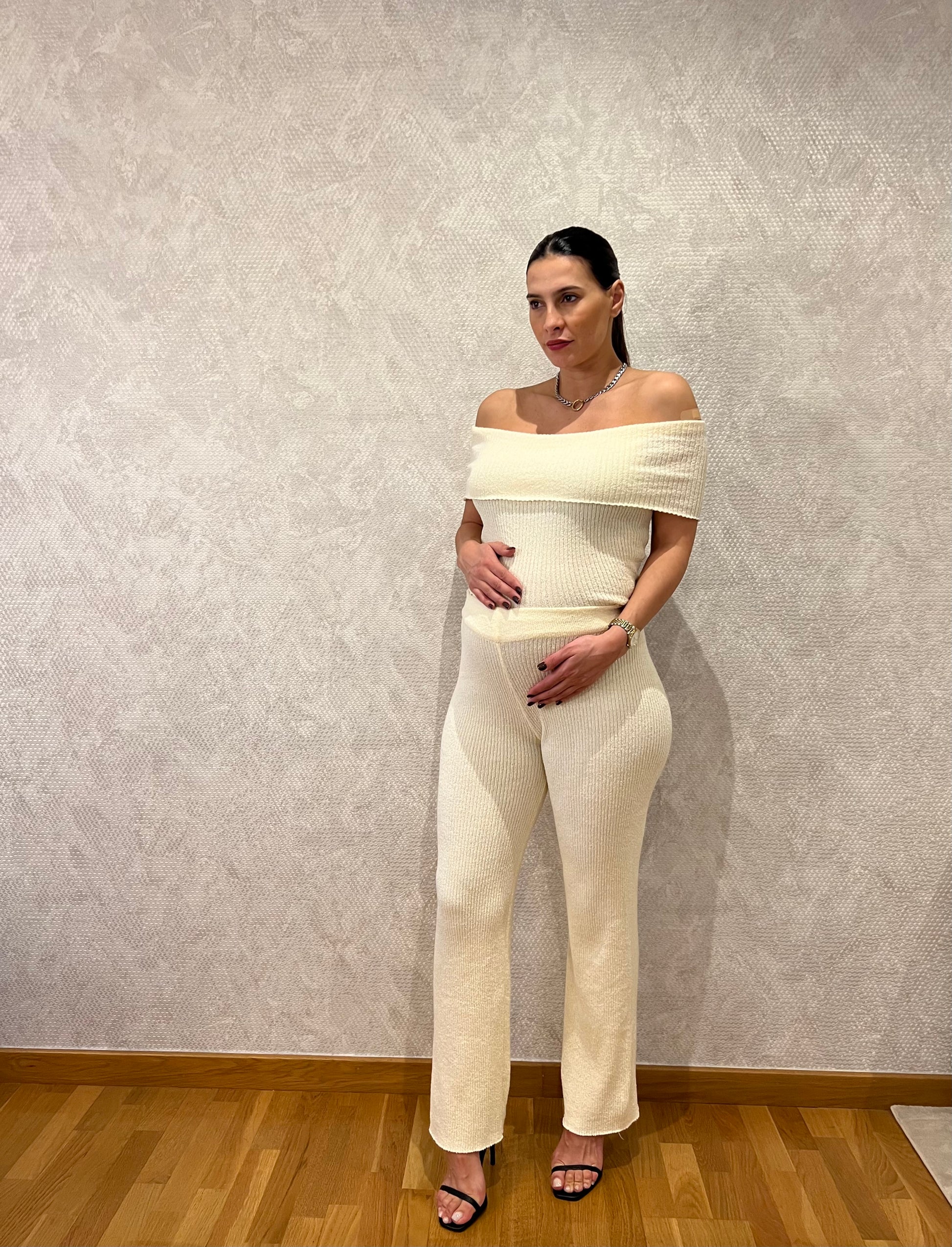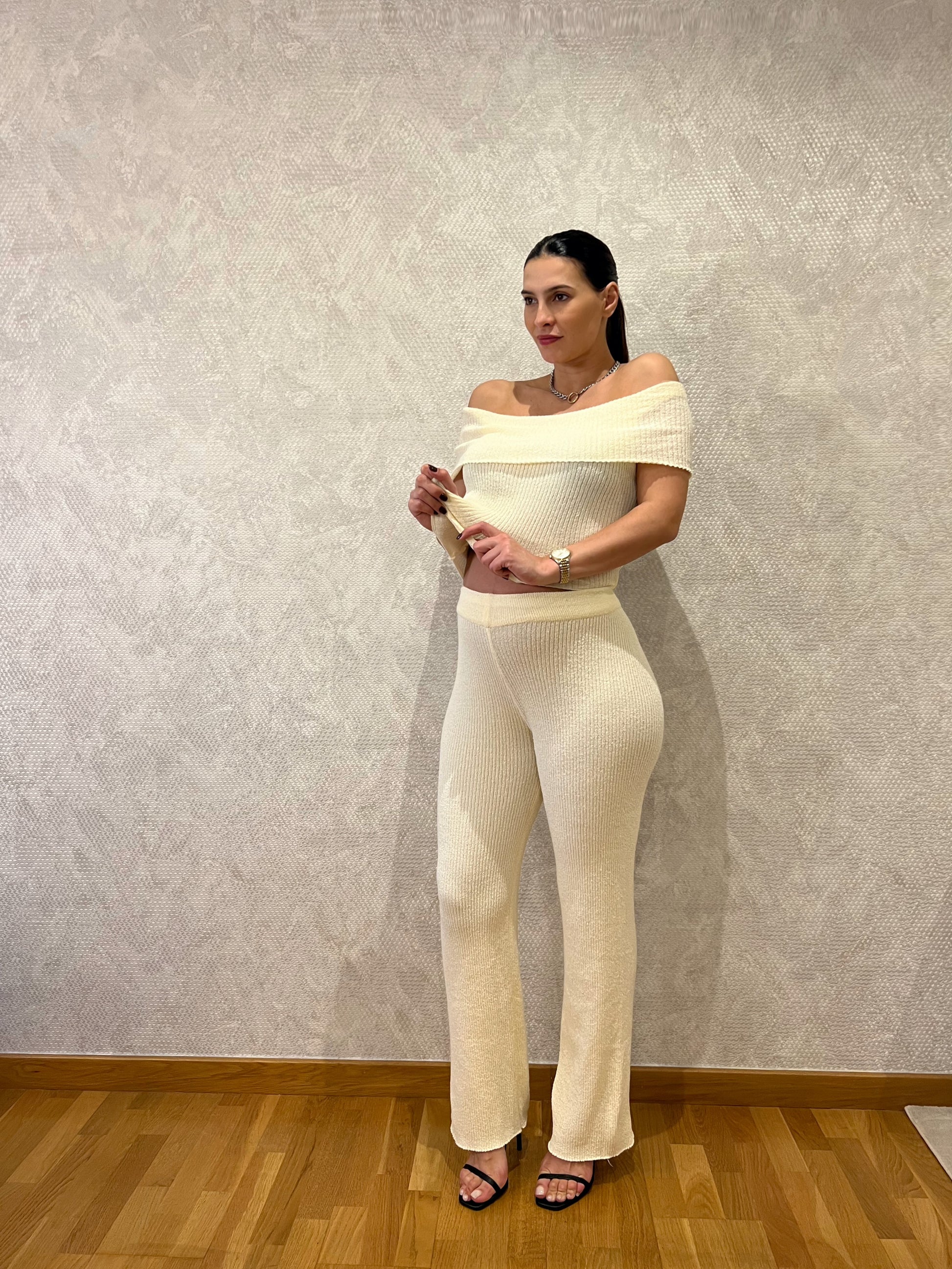 مجموعة مكونة من بنطلون وقميص بفتحة رقبة على شكل قارب. بنطلون بحزام خصر مطاطي، مع الكثير من المرونة