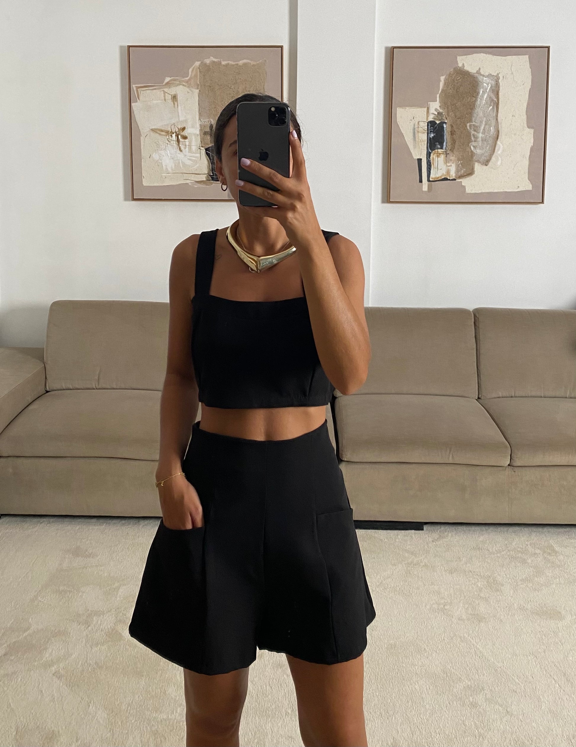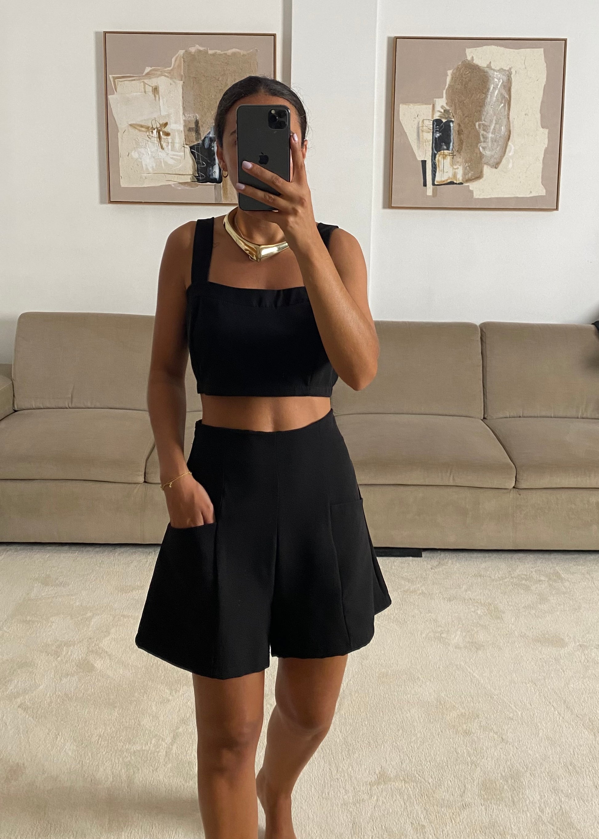 طقم بلوزة وشورت. يُغلق الشورت بسحاب جانبي مخفي وجيوب. الجزء العلوي مُرن من الخلف.
