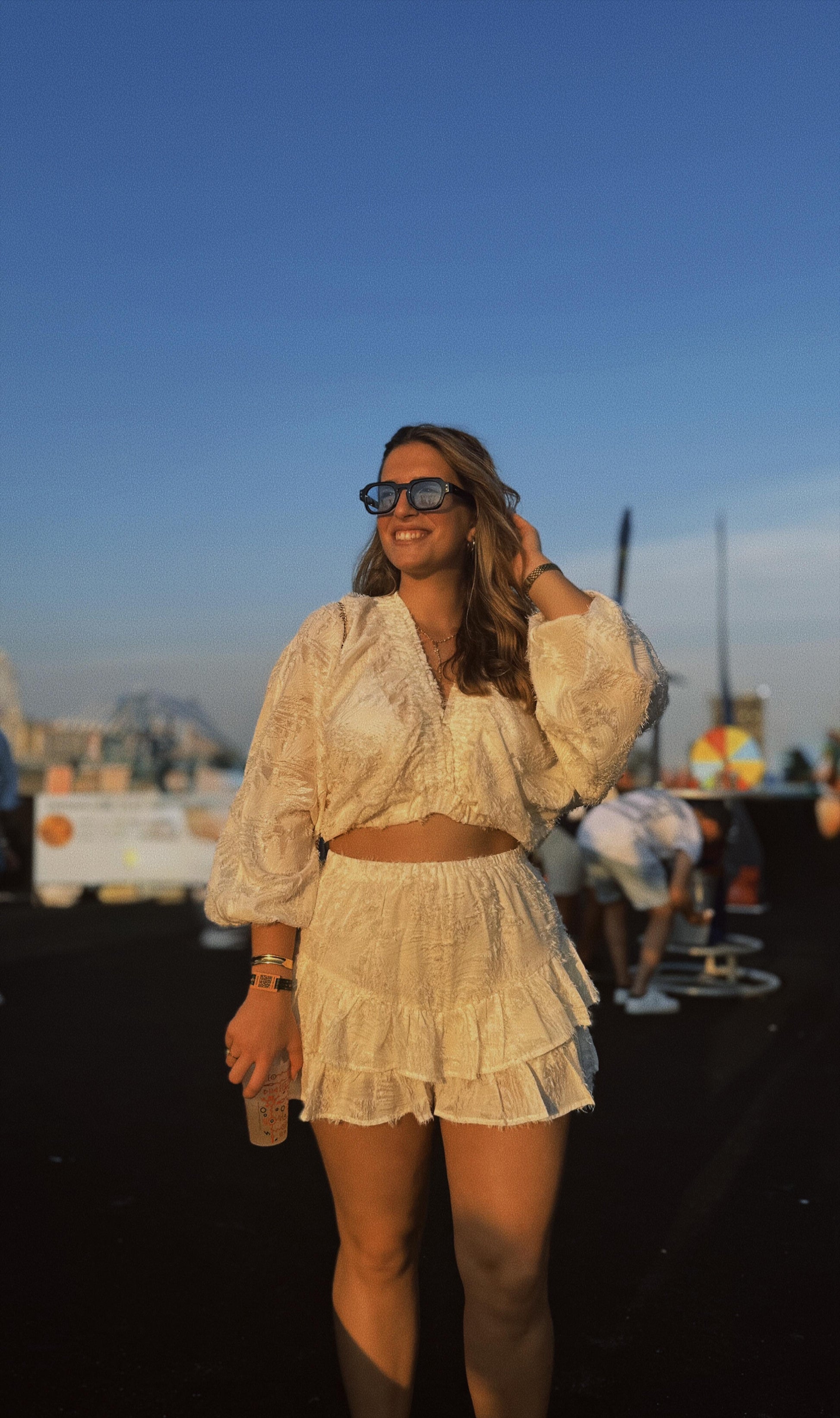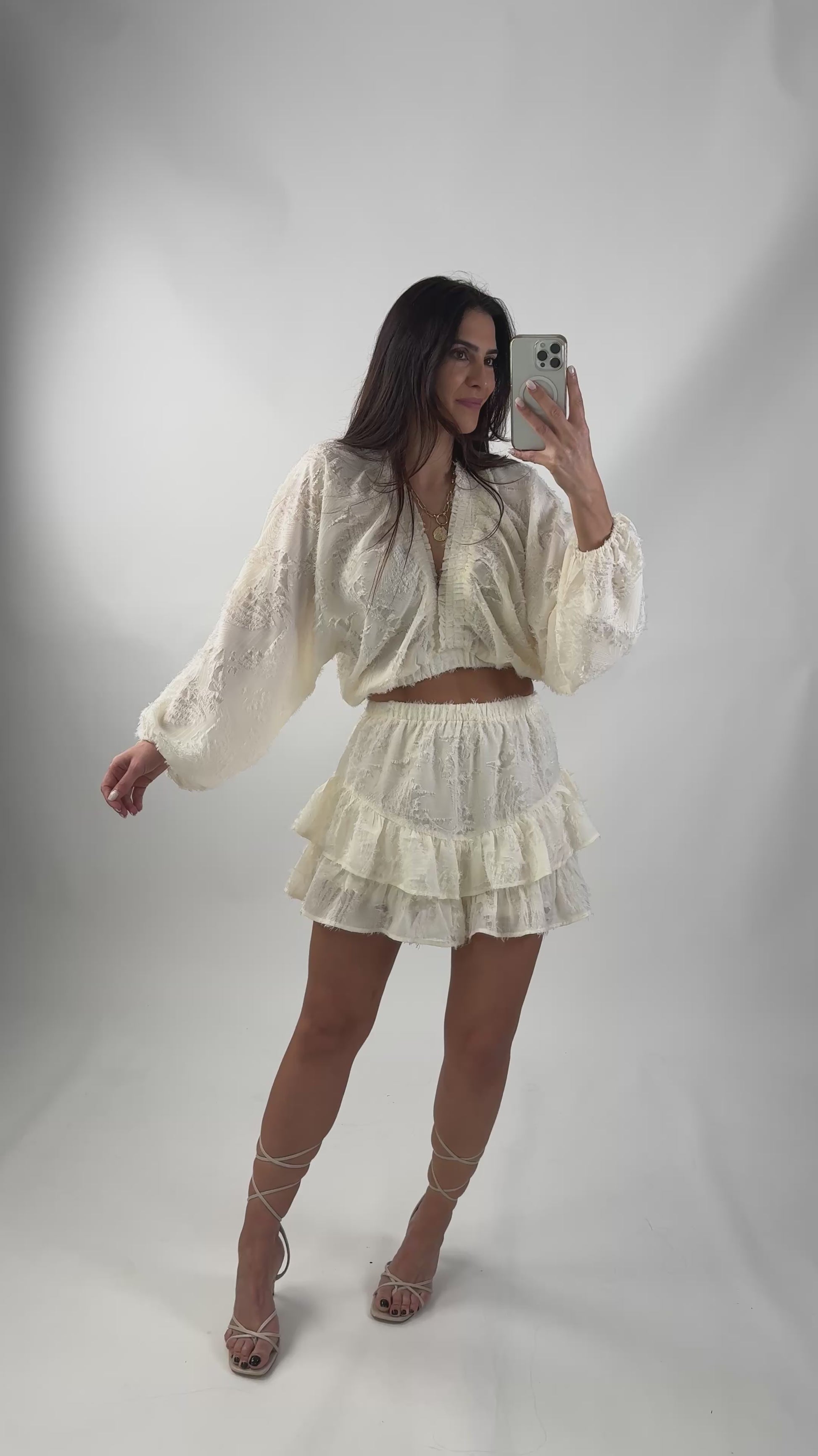 طقم من قماش يشبه الأورجانزا، يتكون من تنورة/شورت وقميص قصير. التنورة/الشورت مبطنة، وحزام خصر مطاطي، وقماش متعدد الطبقات بكشكشة، وحزام خصر مرتفع. يتميز القميص القصير بفتحة رقبة عميقة على شكل حرف V، وأكمام منفوخة بأصفاد مرنة، وحزام خصر وياقة مطاطيين.