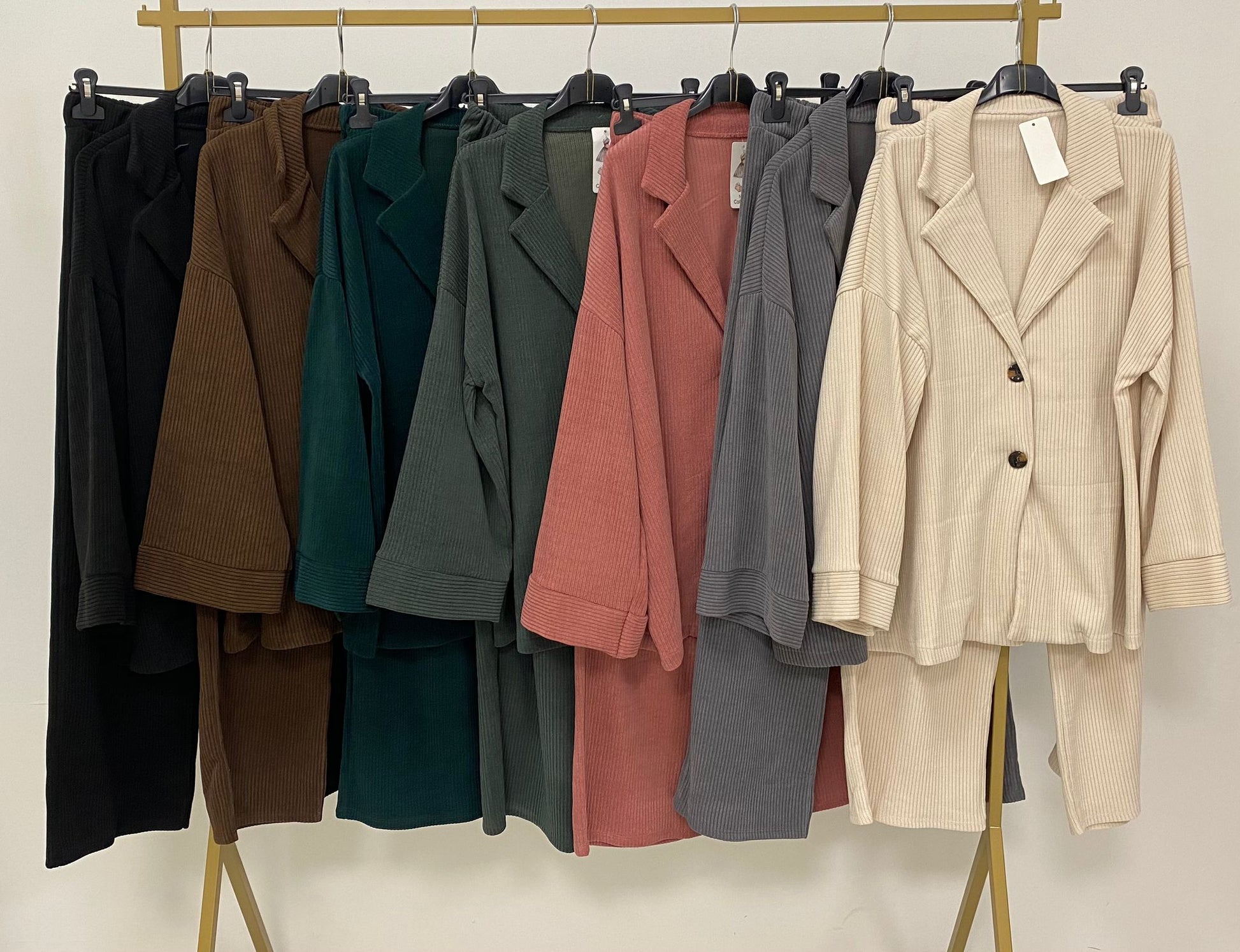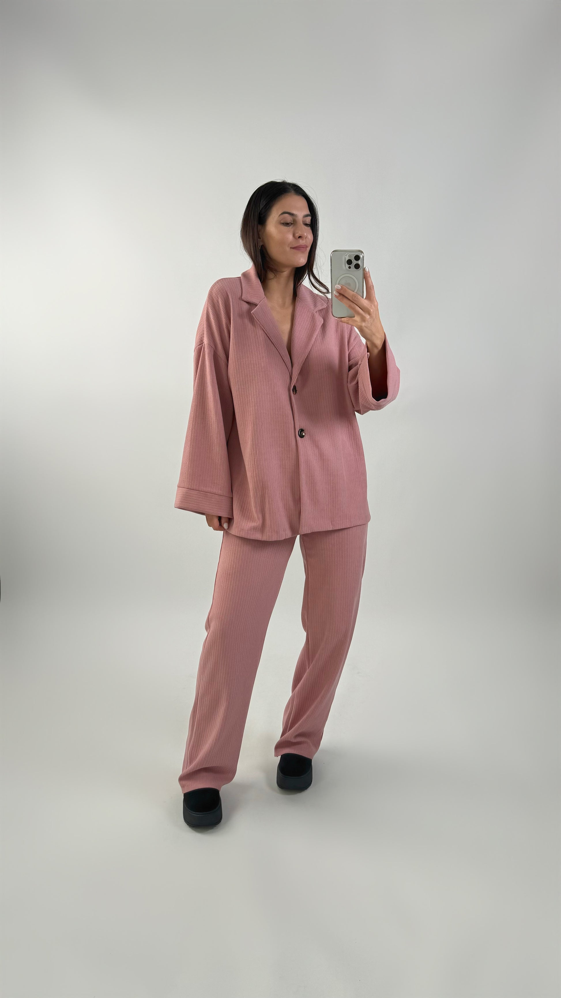 ال مجموعة صالة يجمع بين الراحة والأناقة مع لمسة عصرية ومريحة. مصنوع من قماش مخملي مضلع، يتكون هذا الطقم من قميص بفتحة رقبة على شكل حرف V، يتميز بأزراره السوداء مع تفاصيل بنية اللون وأكمامه الواسعة، مما يمنحه مظهرًا متطورًا وخفيفًا. توفر البناطيل ذات الساق الواسعة الكثير من التمدد عند الخصر، مما يضمن ملاءمة مثالية ومريحة طوال اليوم. مثالية للمظهر غير الرسمي.