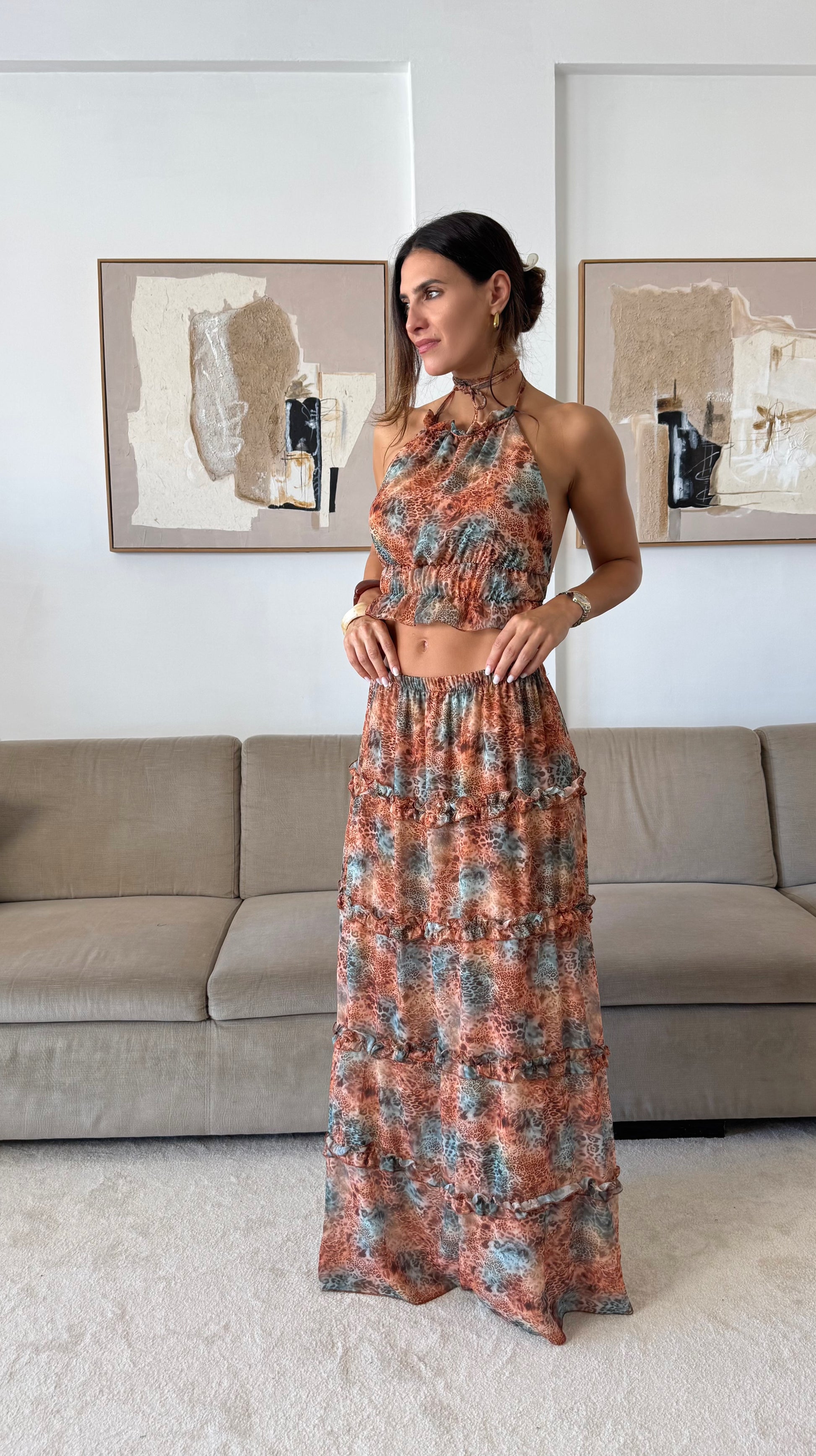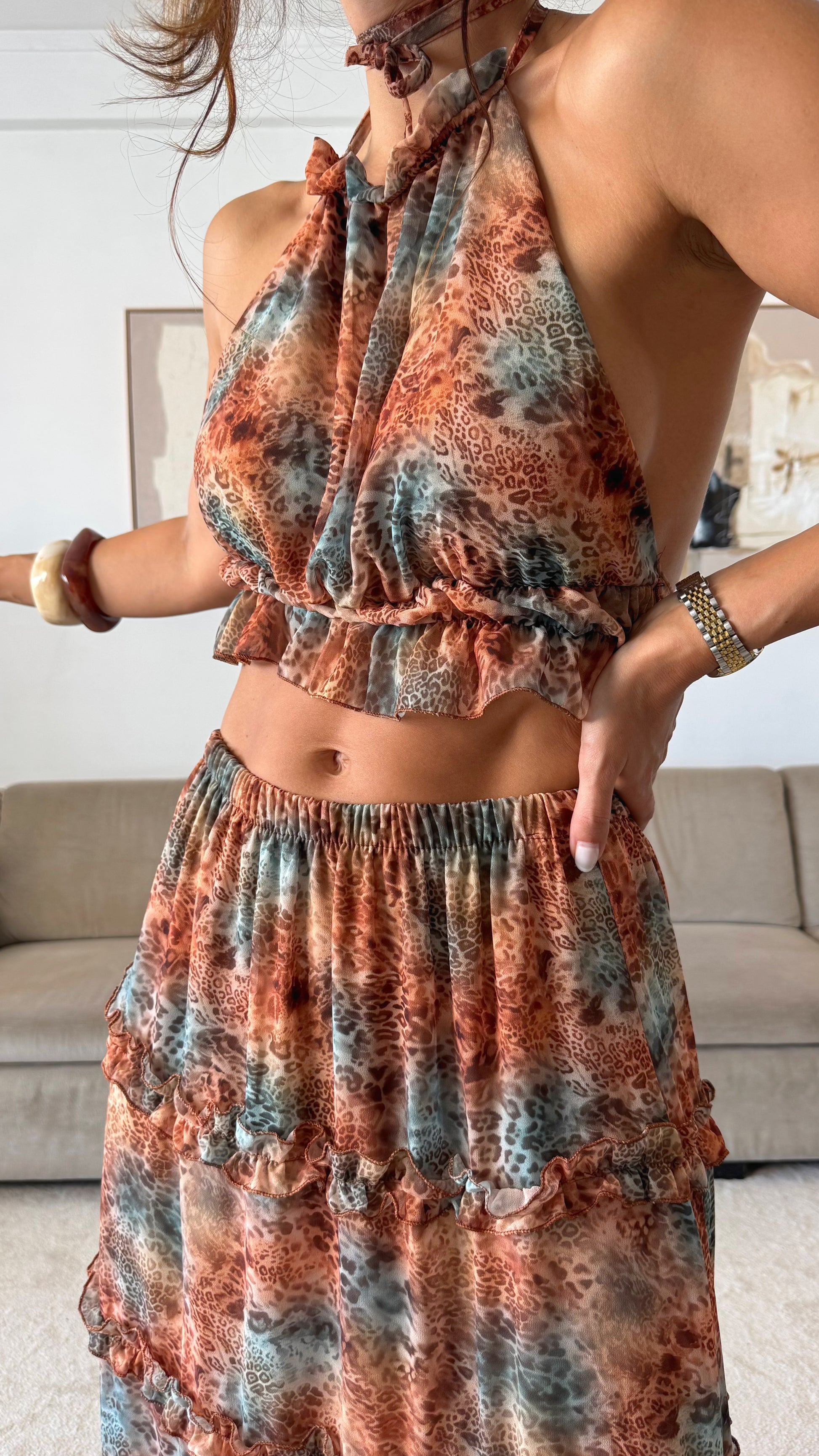 طقم تنورة وقميص. الجزء العلوي مُصمم على شكل أكواب ومطاط من الأسفل، مع رباط عند الرقبة والظهر. تنورة بكشكشة أفقية، وبطانة قصيرة، ومطاط عند الخصر. S الى L.