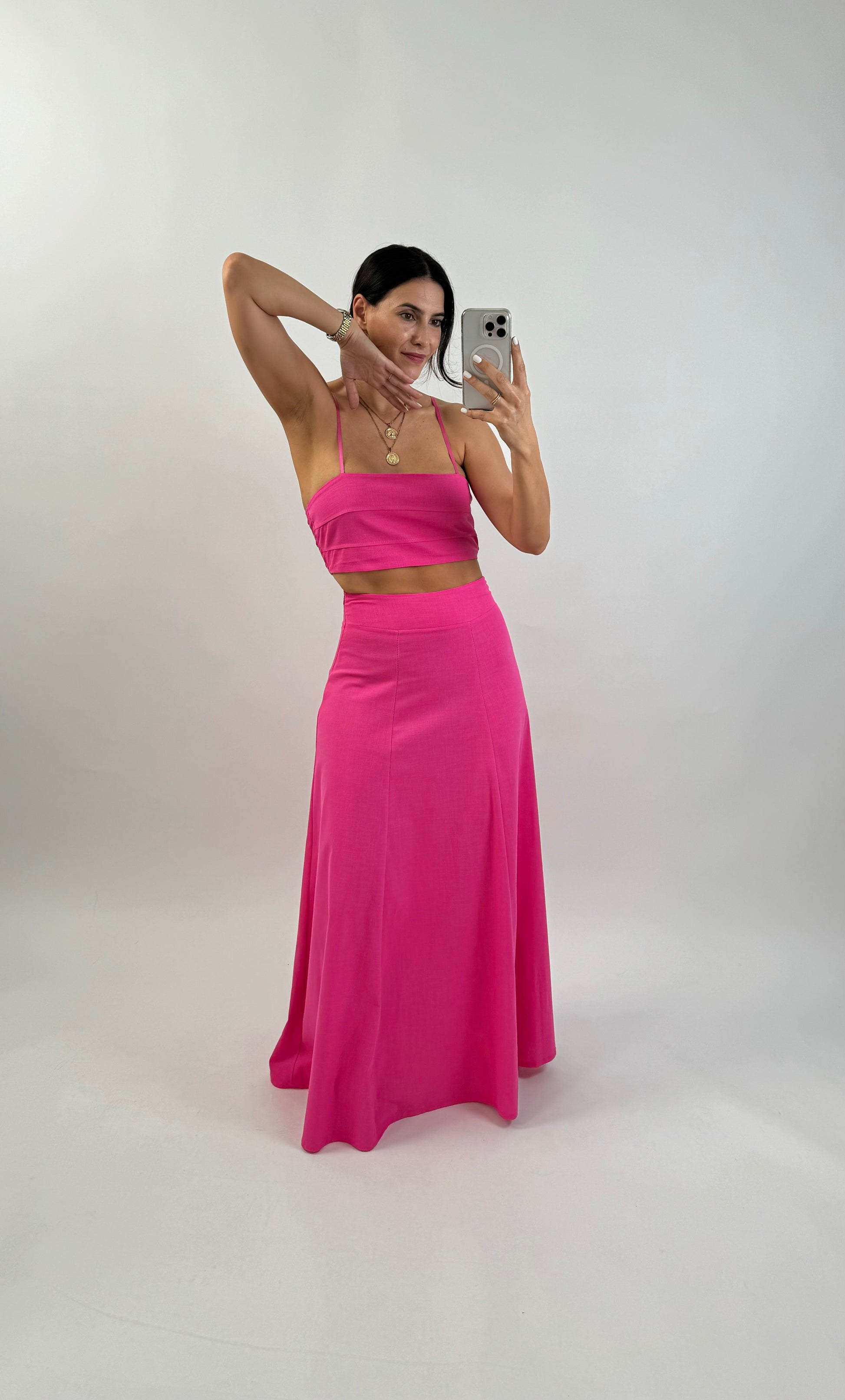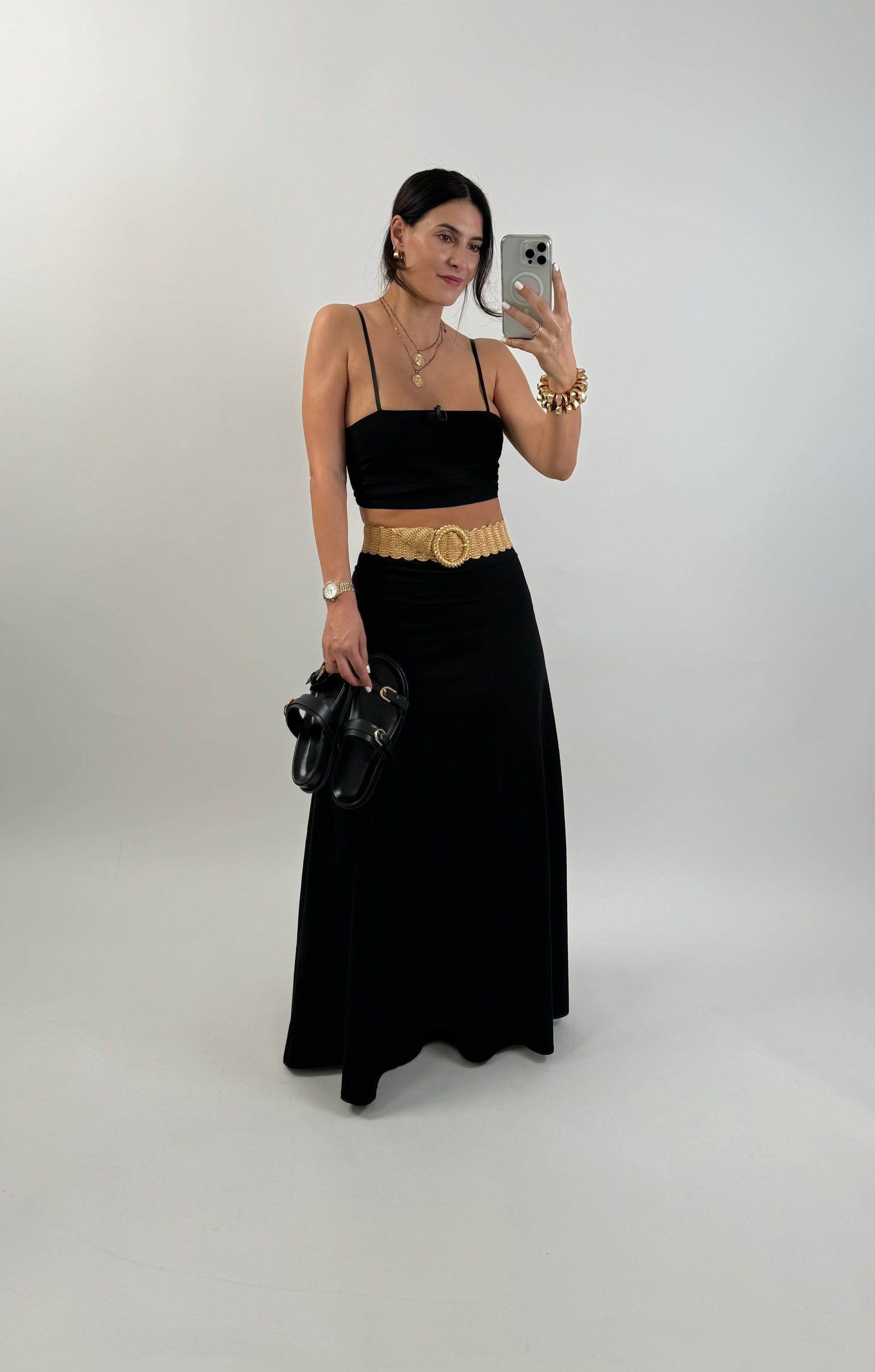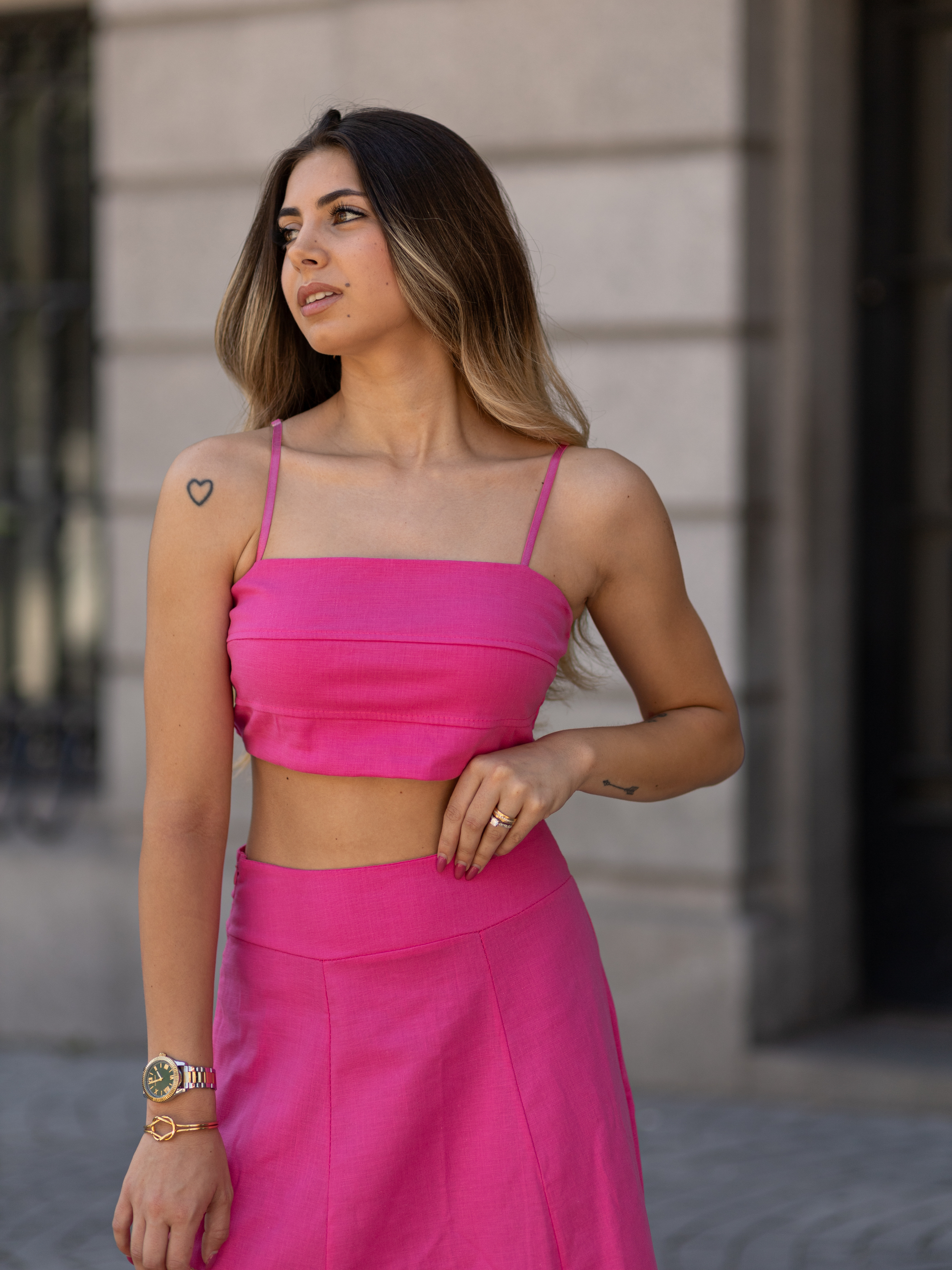 طقم مكون من تنورة وبلوزة. تصميم مبطن. تنورة واسعة بخصر عالٍ، تُغلق بسحاب جانبي وحزام خصر مطاطي لملاءمة مثالية. الجزء العلوي مزود بظهر مطاطي لملاءمة محكمة وحمالات قابلة للتعديل.