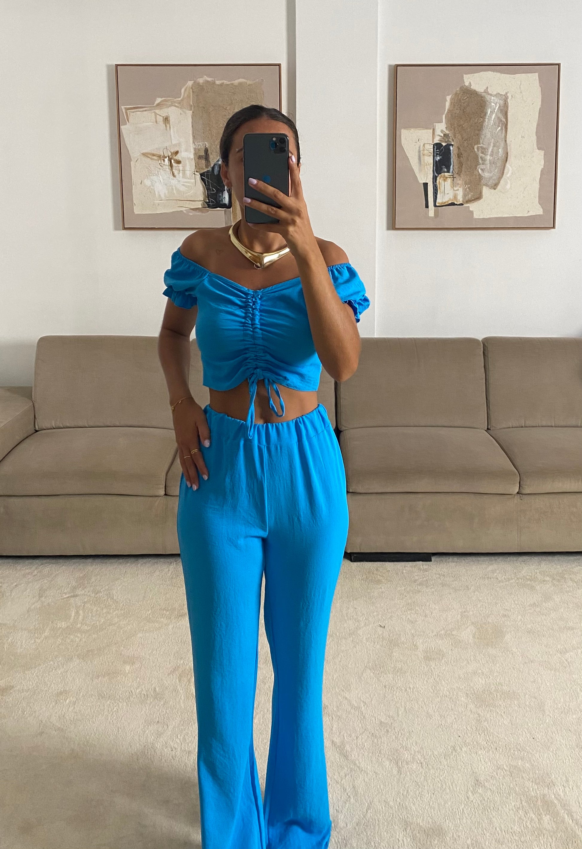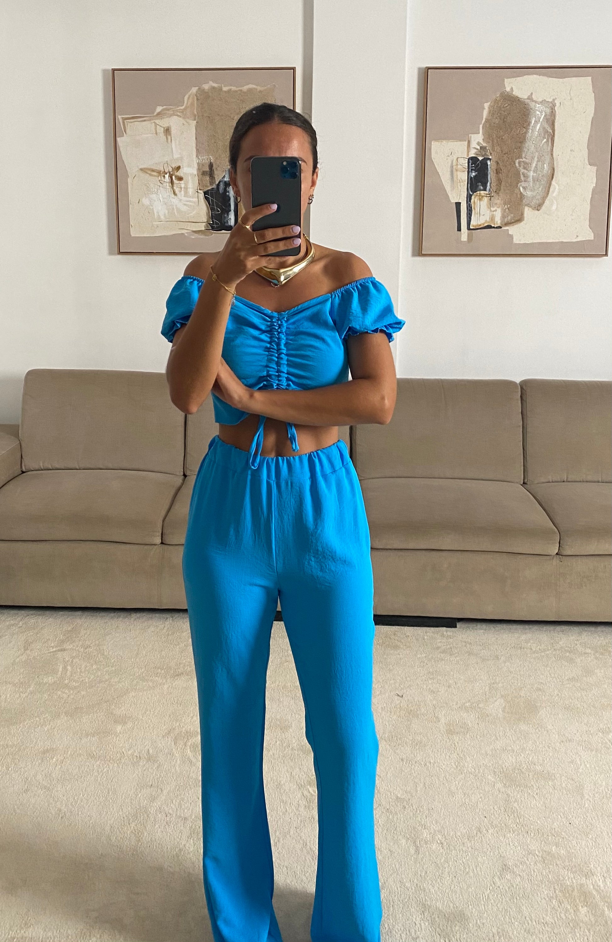 مجموعة مكونة من بلوزة قابلة للتعديل وبنطلون واسع بحزام خصر مطاطي. إنه مقاس واحد يناسب الجميع S الى M