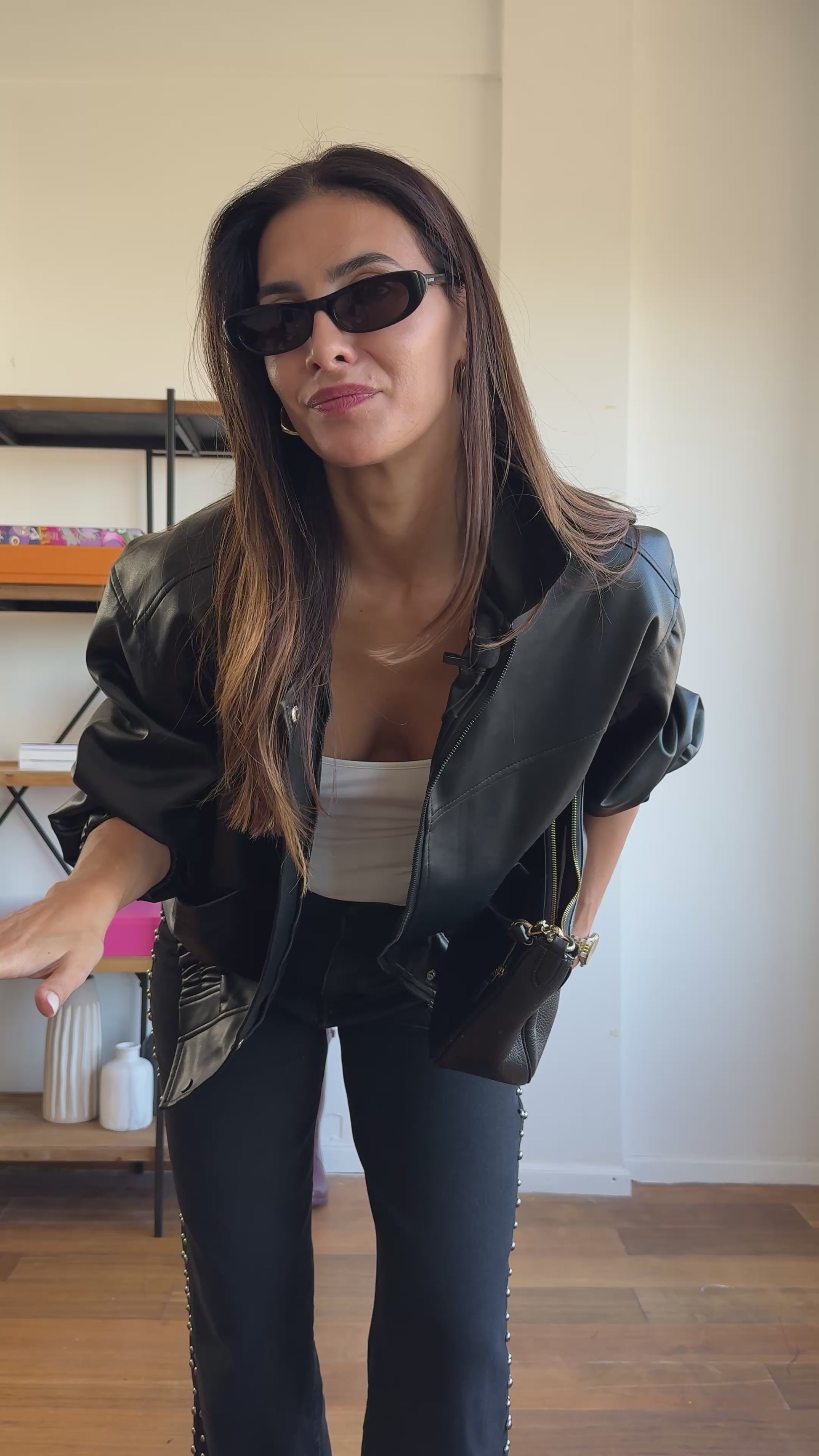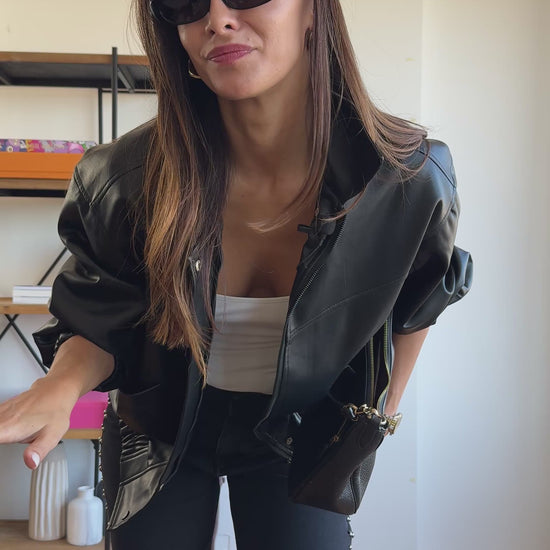 سترة قاذفة على طراز راكبي الدراجات النارية مصنوعة من نسيج جلدي صديق للبيئة، ذات تأثير كبير الحجم. يتم تثبيته بسحاب وزر زنبركي ملون. يحتوي على جيوب ومطاط عند الخصر والأصفاد، ومبطن. إنه مقاس واحد يناسب الجميع S الى L. نحن نجمع بين القاذفة وسراويل المزرعة لدينا.