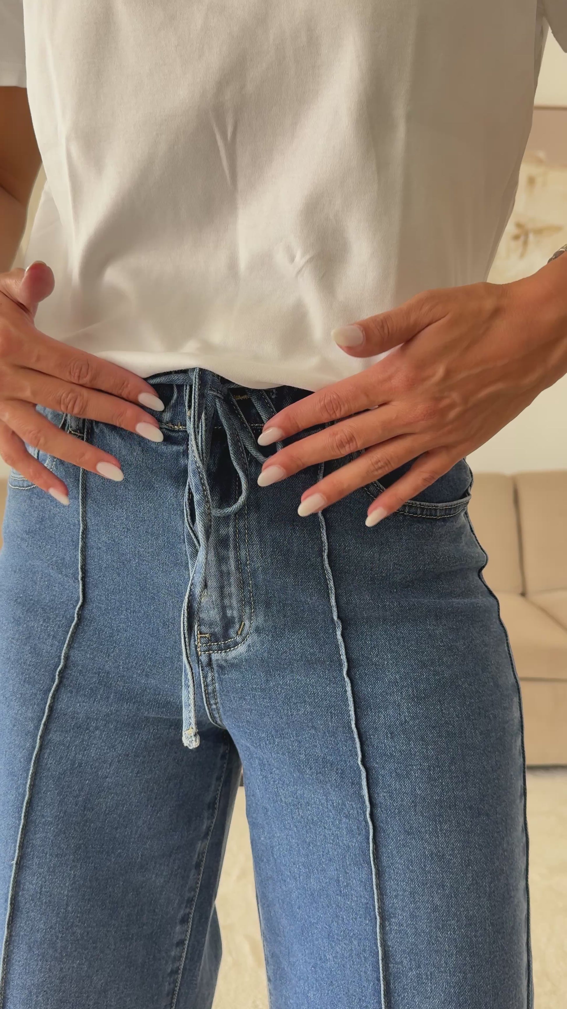 Calças de Ganga Femininas Wide Leg com Cintura Elástica e Laço Frontal. Modelo largo com costura central e bolsos funcionais. Perfeitas para um look moderno e descontraído.