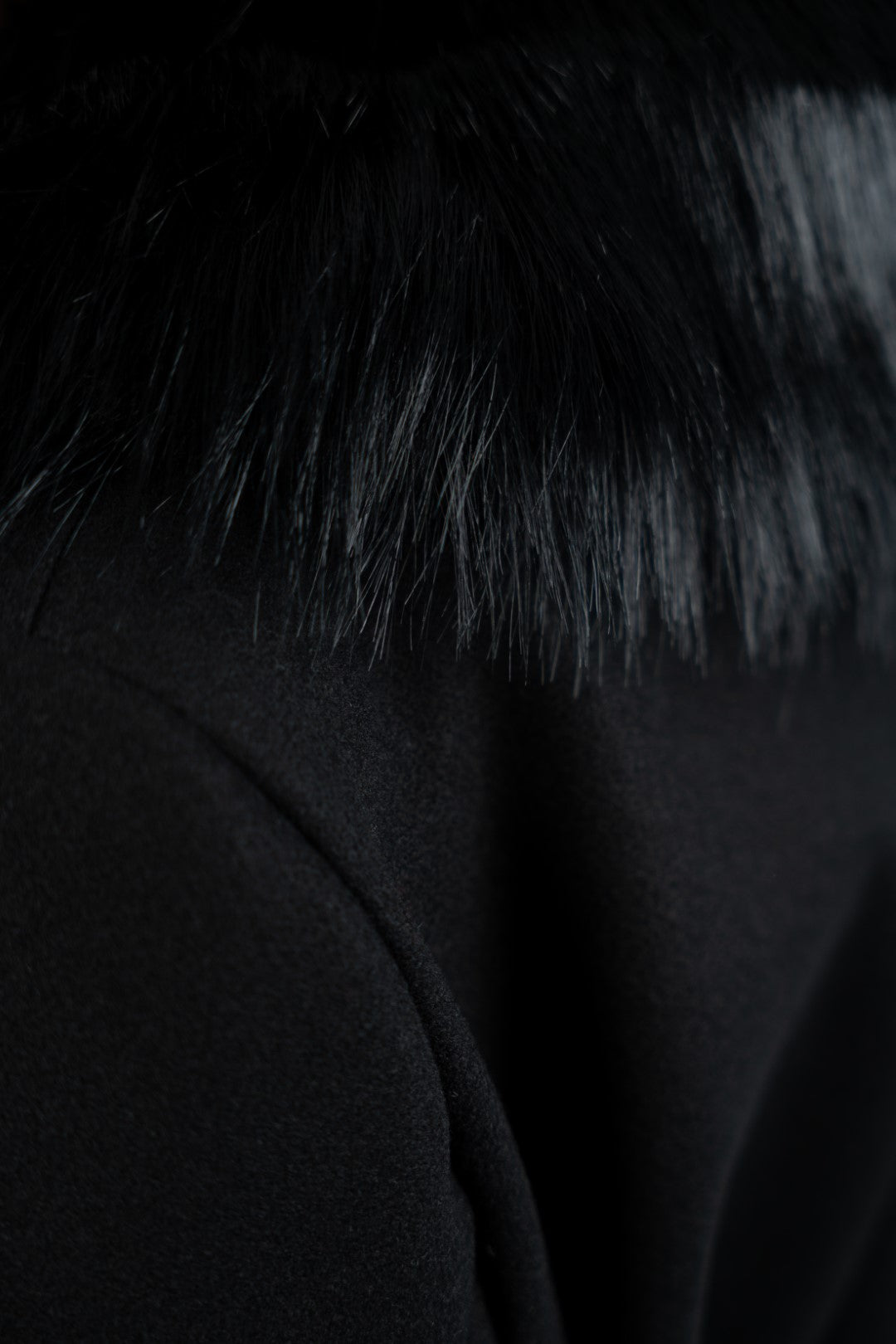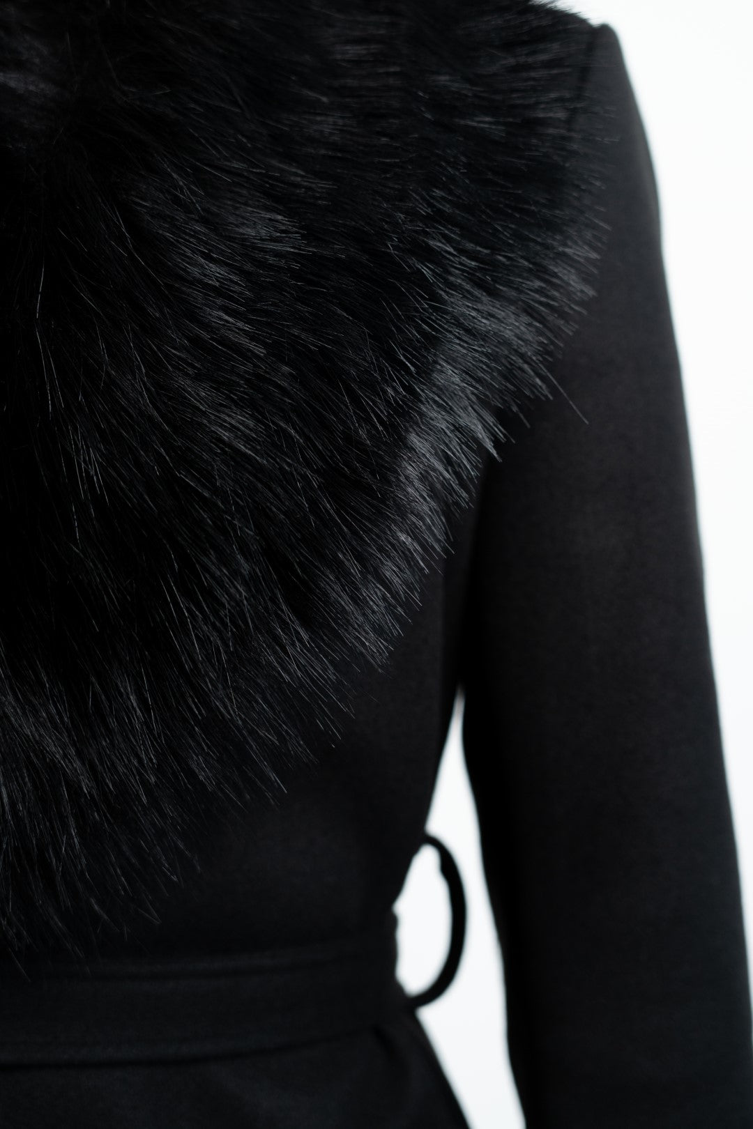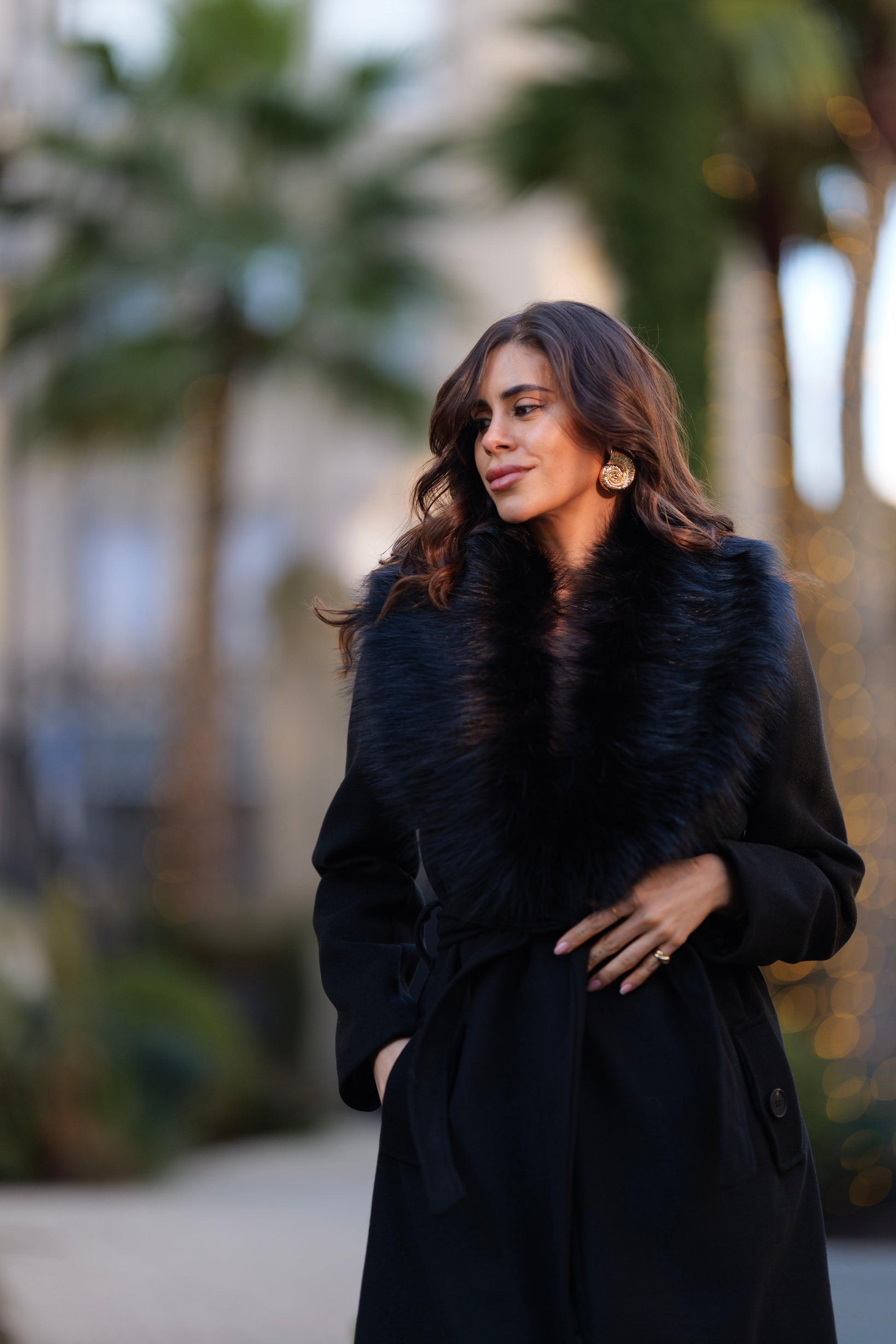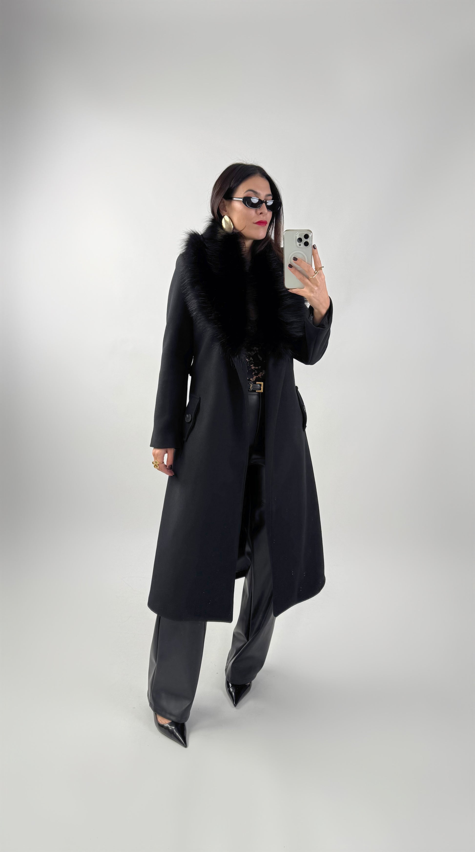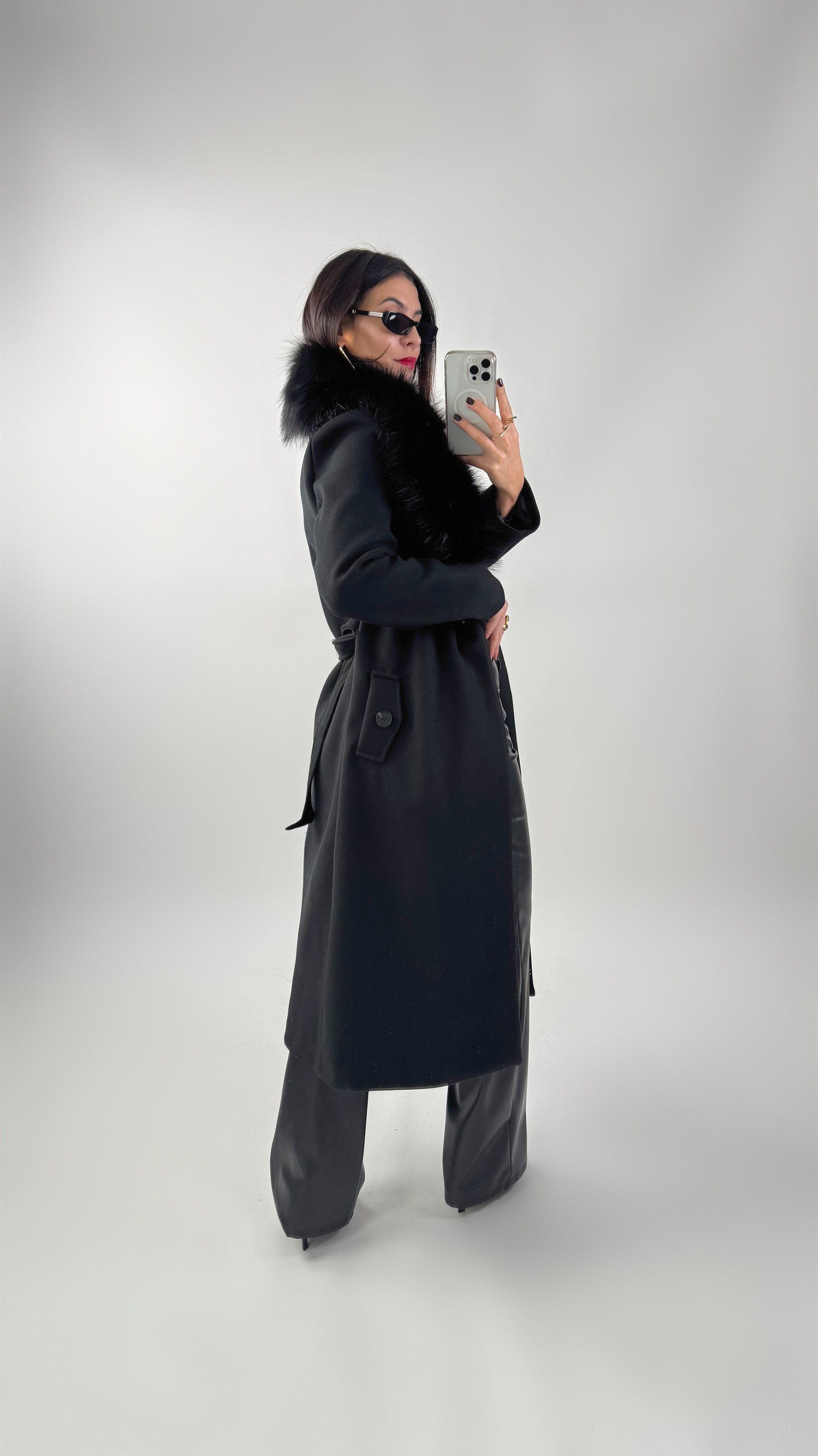 Sobretudo midi em fazenda com forro, com efeito segunda gola em pêlo removível. Tem bolsos laterais, aperta com botões e cinto no mesmo tecido. Veste do S ao L.