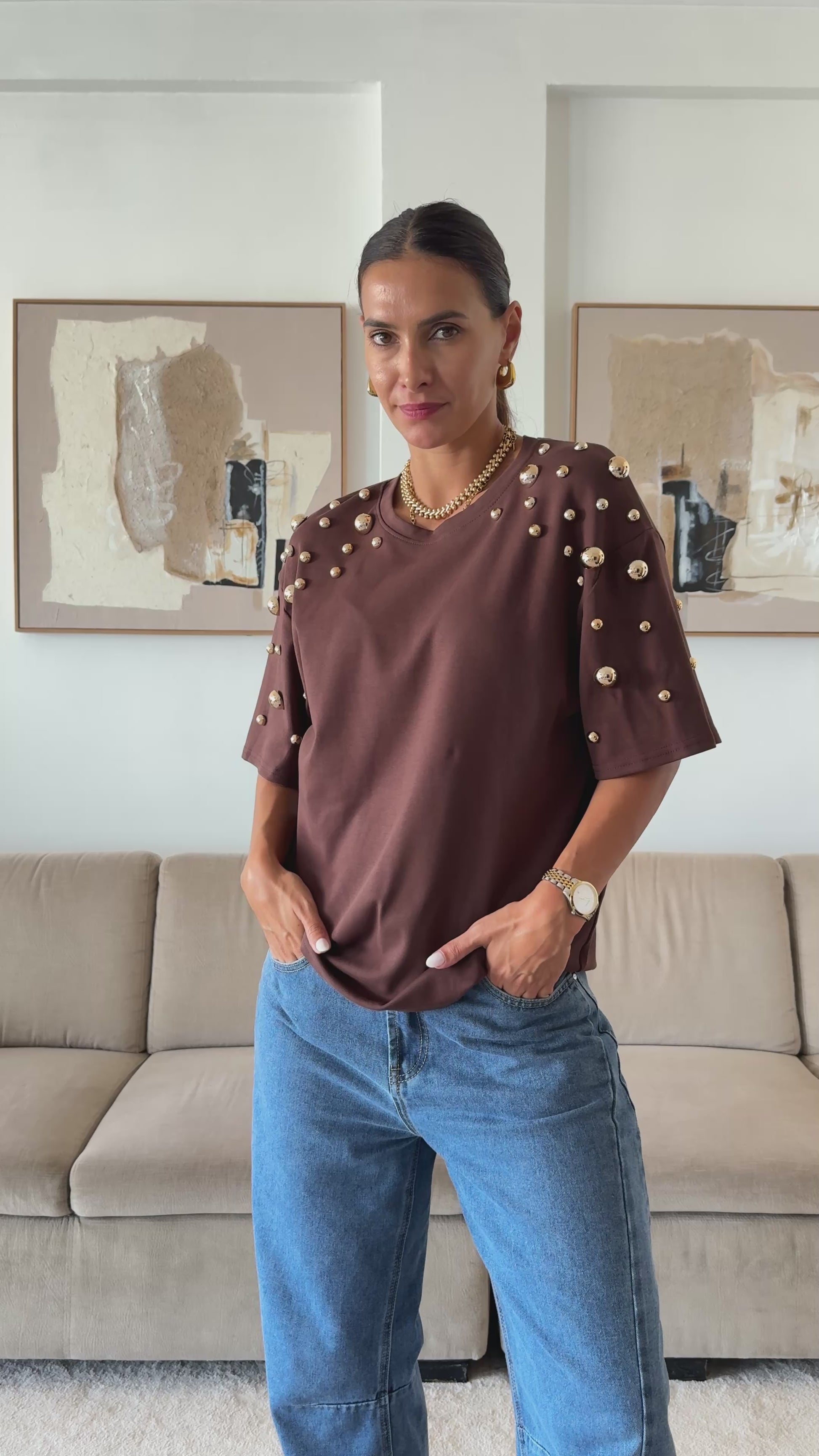 قميص بني اللون مصنوع من قماش يشبه الليكرا، مع كرات ذهبية مدمجة على الكتفين والأكمام.
