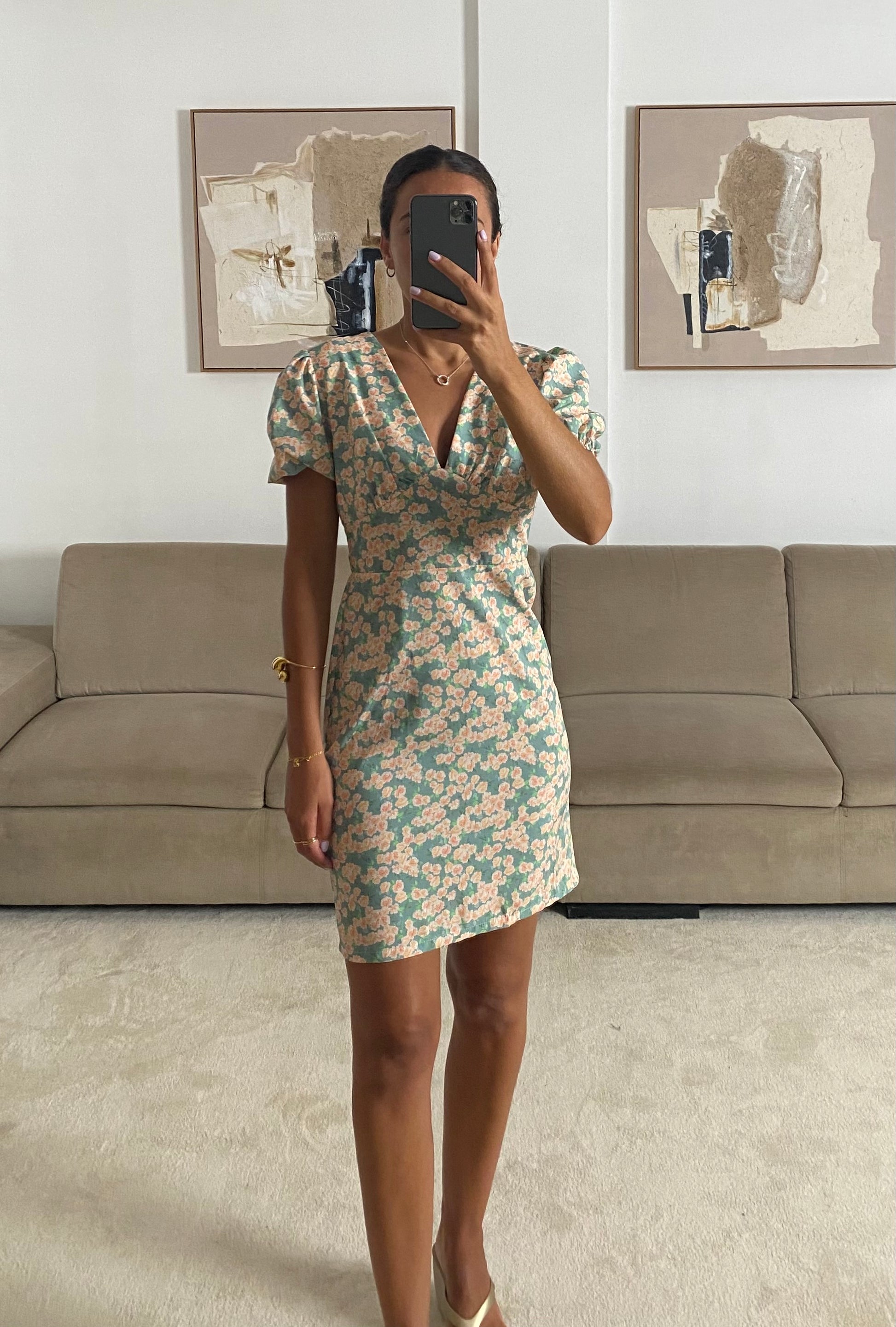فستان قصير بظهر مطاطي وفتحة رقبة على شكل حرف V وأكمام منتفخة. S الى L.