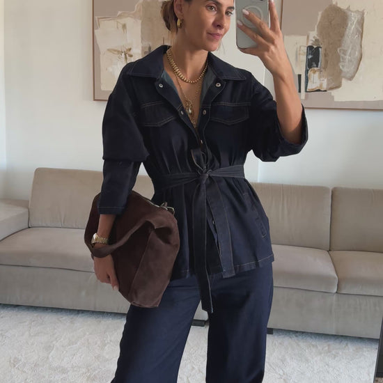 Modernes Damen-Set mit dunkel gewaschener Jeansjacke und weit geschnittener Hose mit elastischem Bund für mehr Komfort