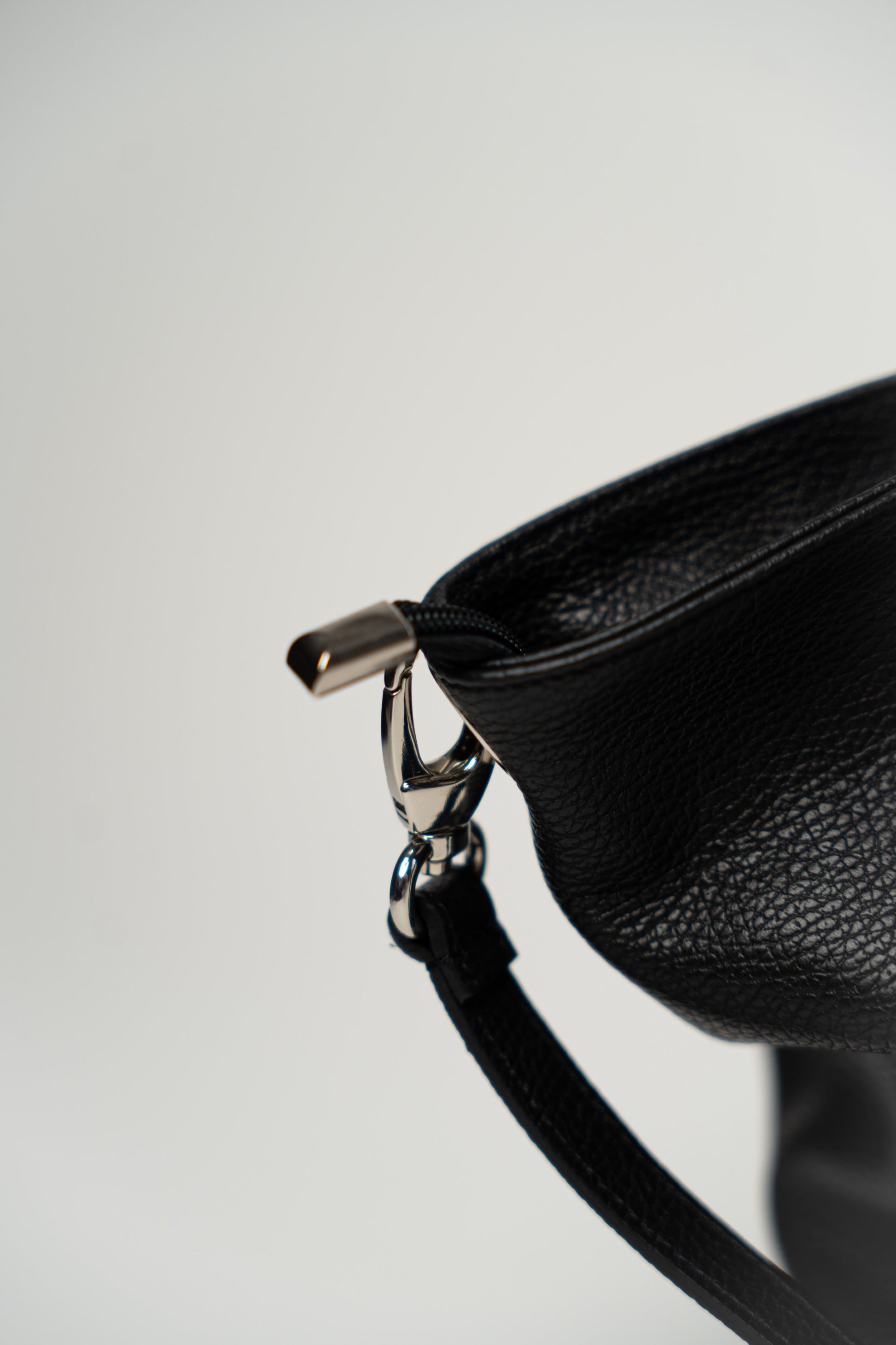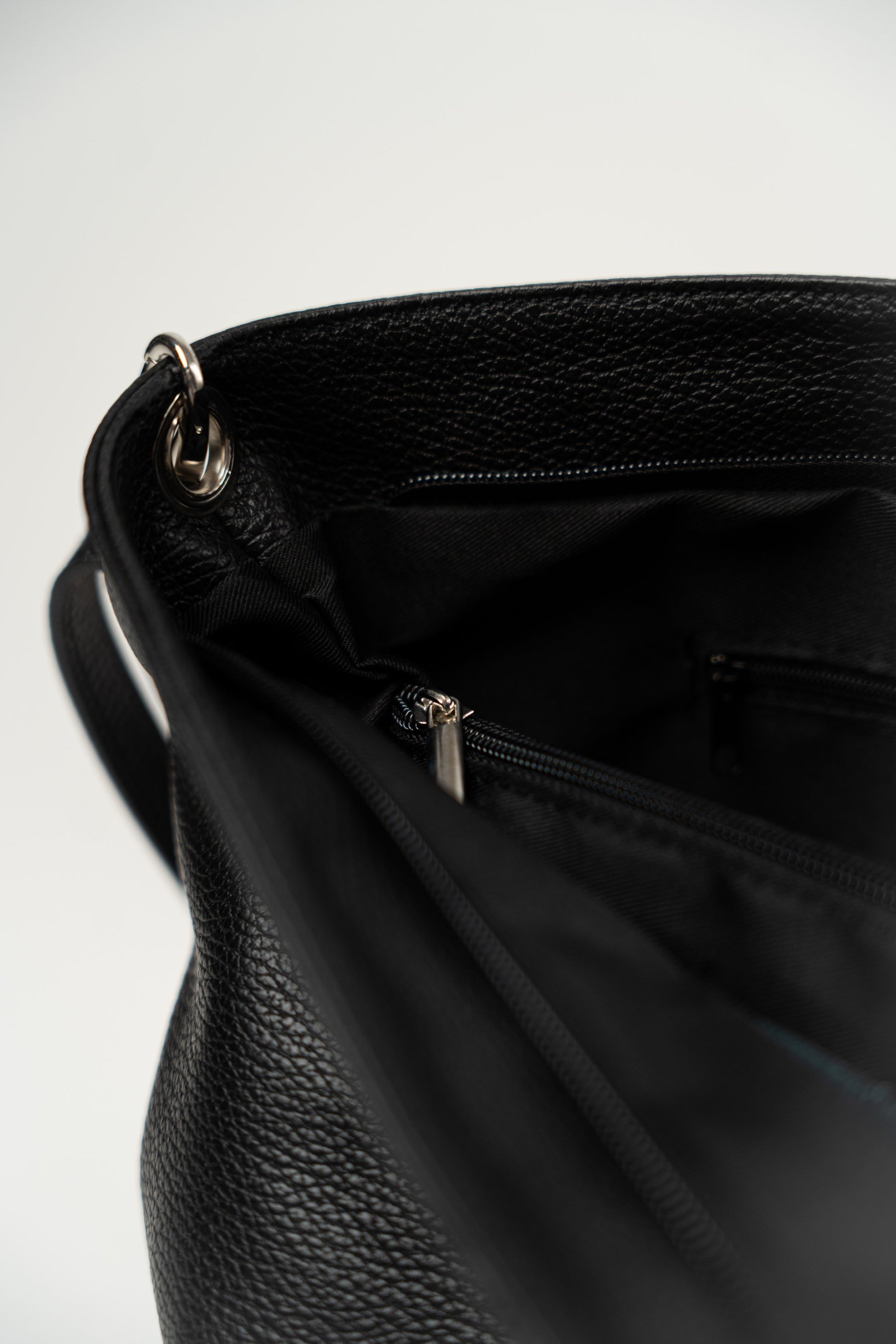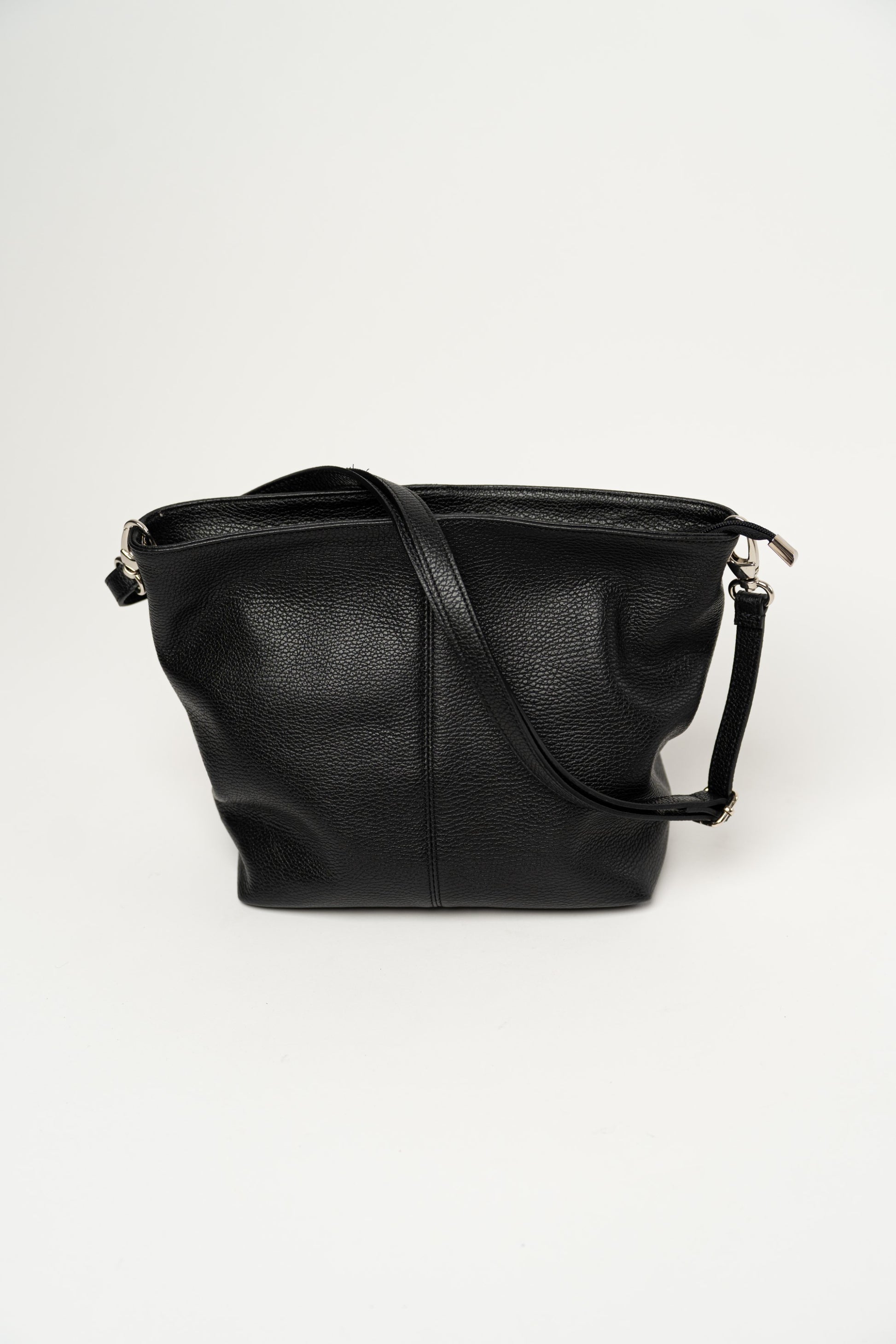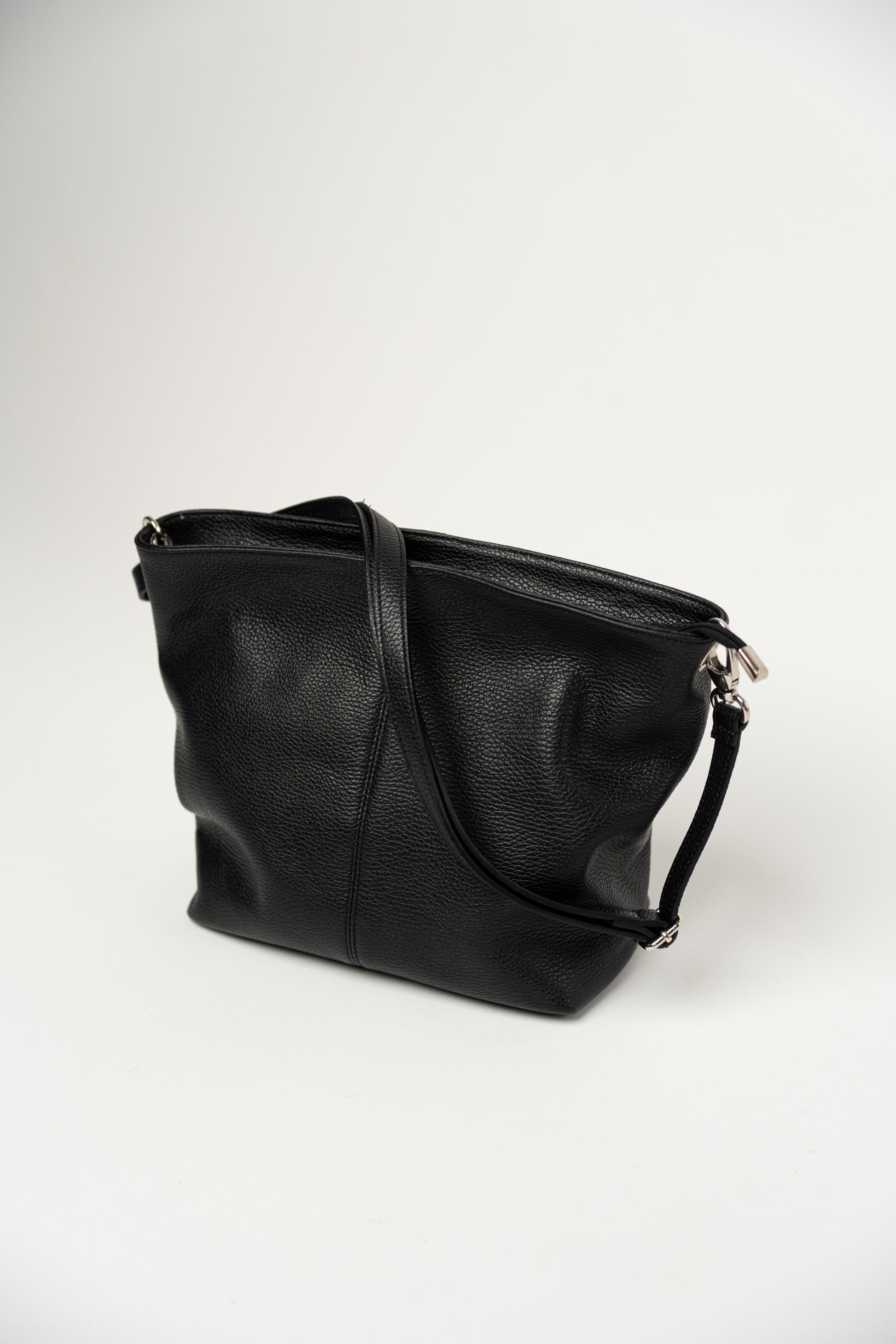 Schlichte schwarze Tasche mit Reißverschluss. Aufwendige Ziernähte. Gefüttert und mit Innentasche. Seitliche Fächer, eines mit Reißverschlusstasche und das andere mit einer kleinen Ledertasche. Hauptfach mit Reißverschluss. Inklusive verstellbarem und abnehmbarem Schultergurt.