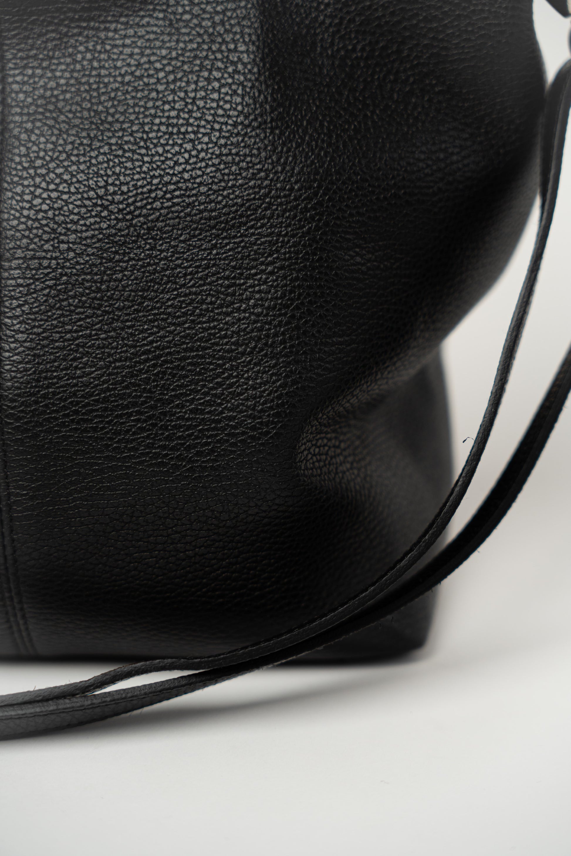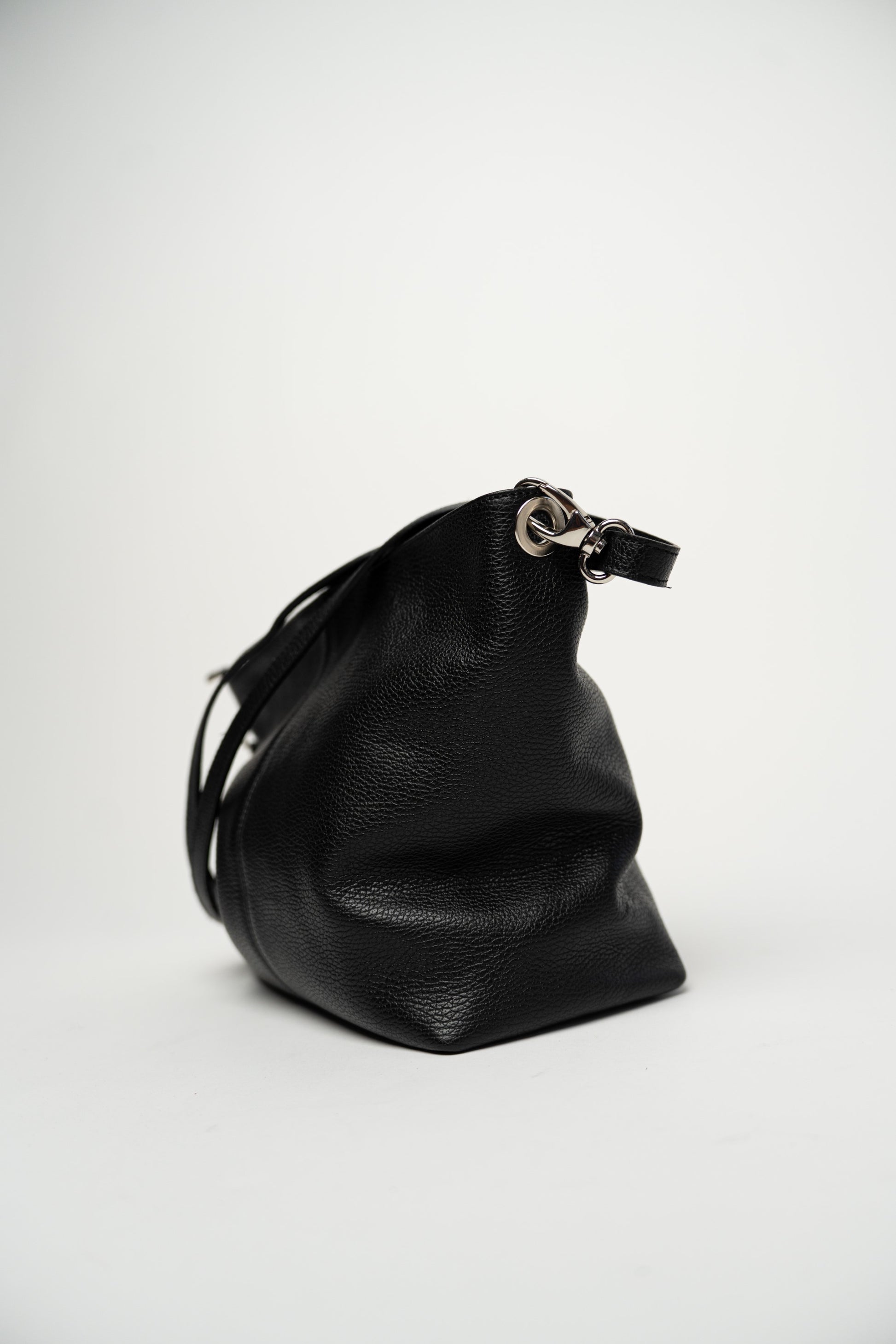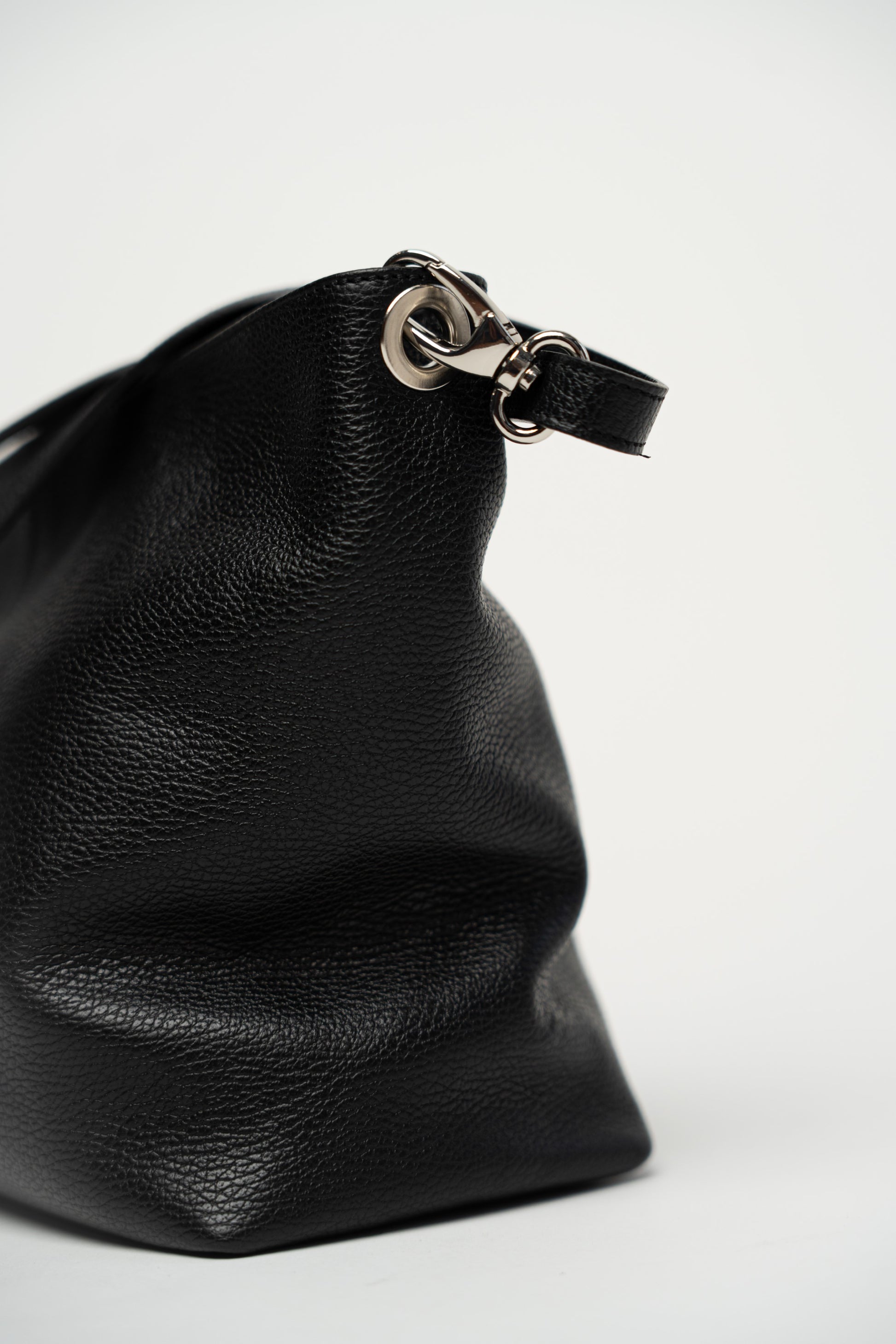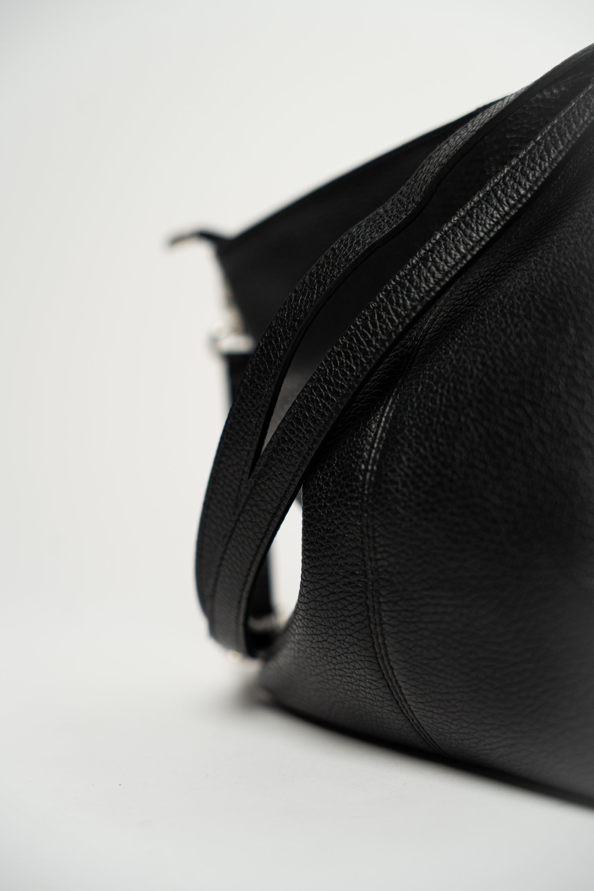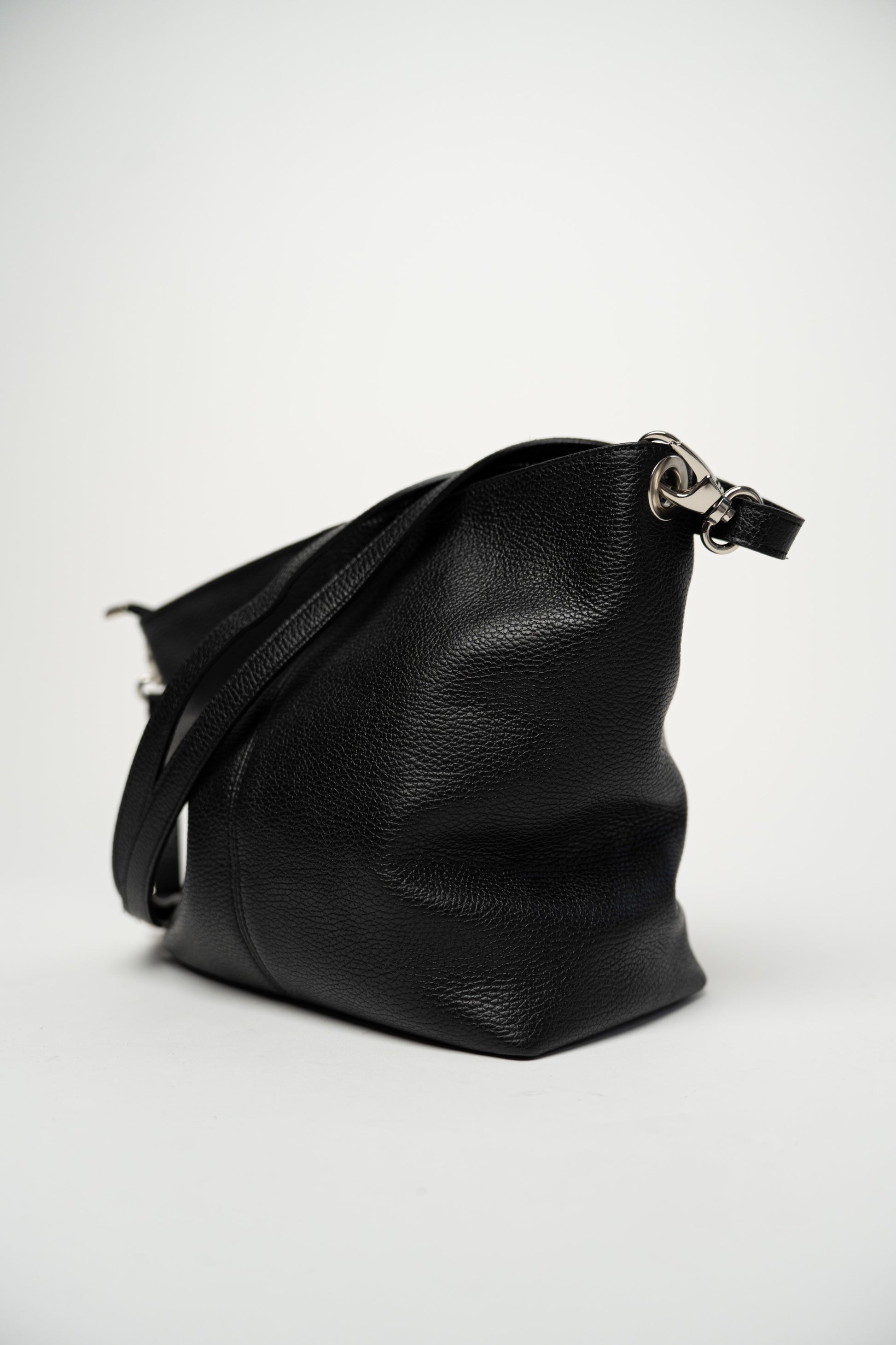 Schlichte schwarze Tasche mit Reißverschluss. Aufwendige Ziernähte. Gefüttert und mit Innentasche. Seitliche Fächer, eines mit Reißverschlusstasche und das andere mit einer kleinen Ledertasche. Hauptfach mit Reißverschluss. Inklusive verstellbarem und abnehmbarem Schultergurt.