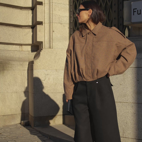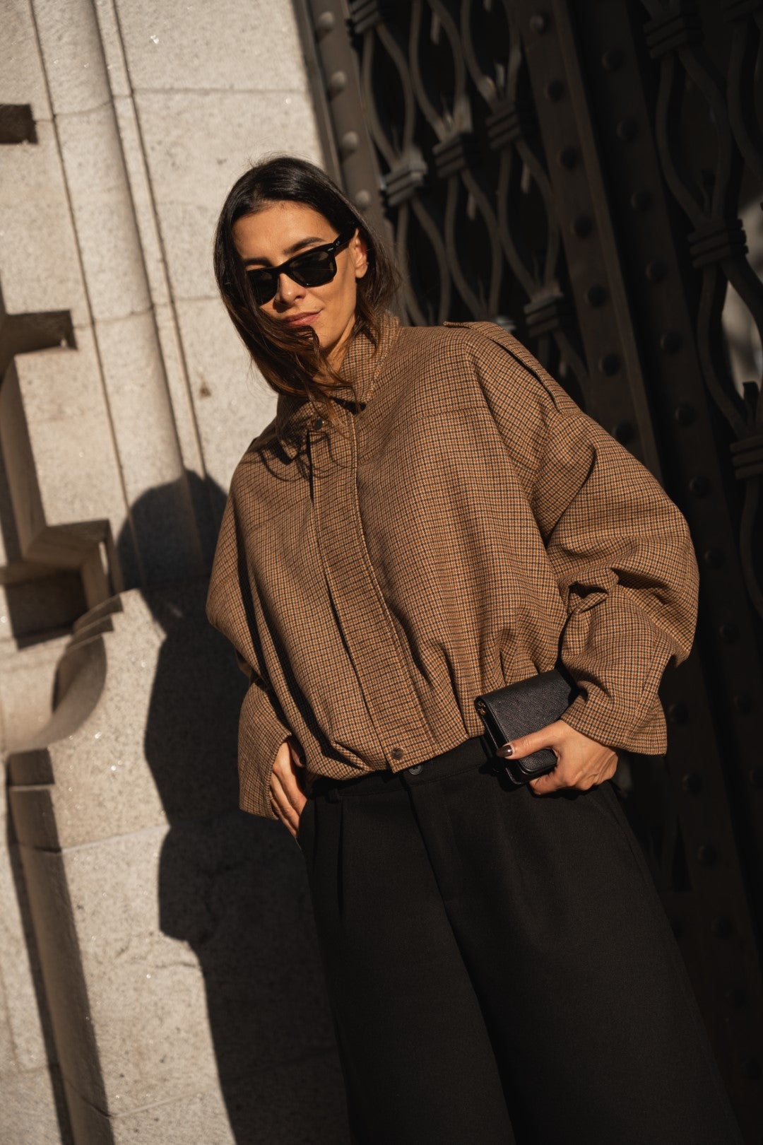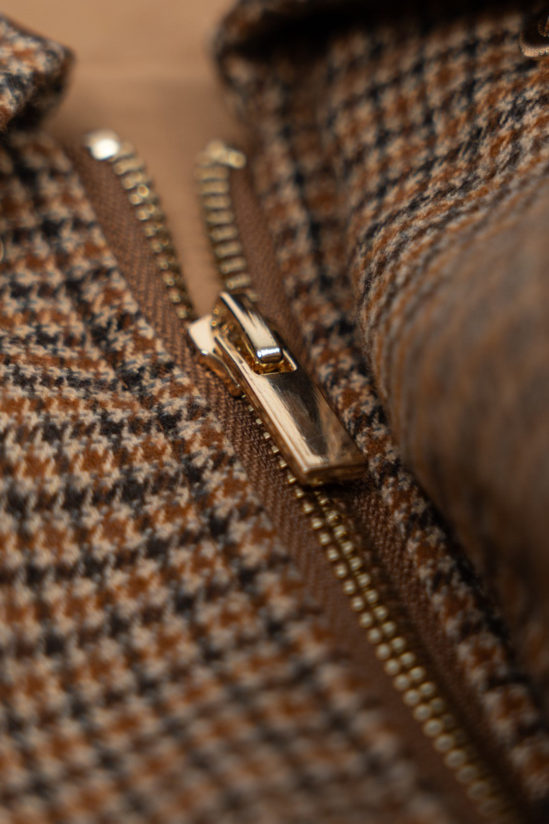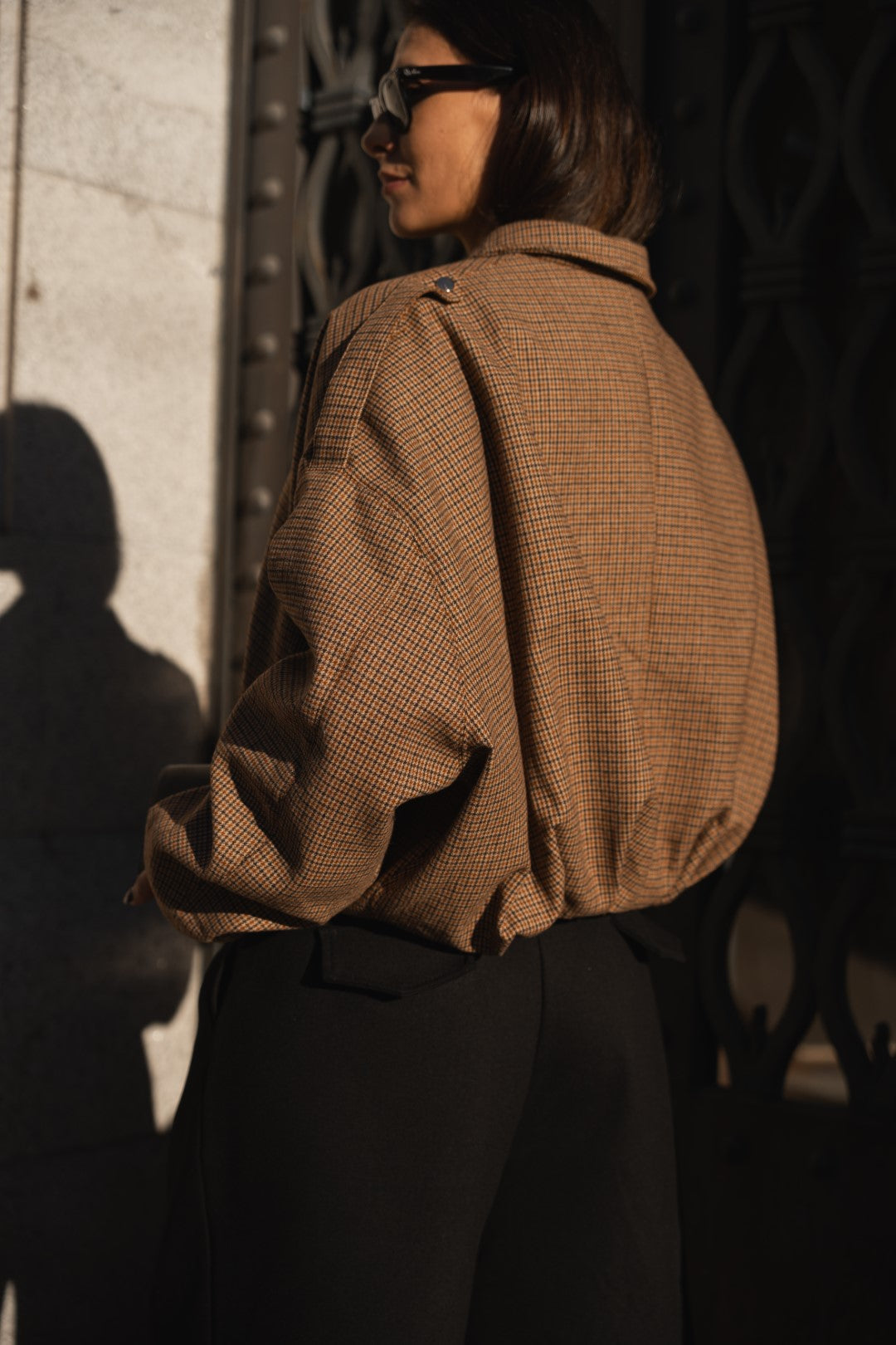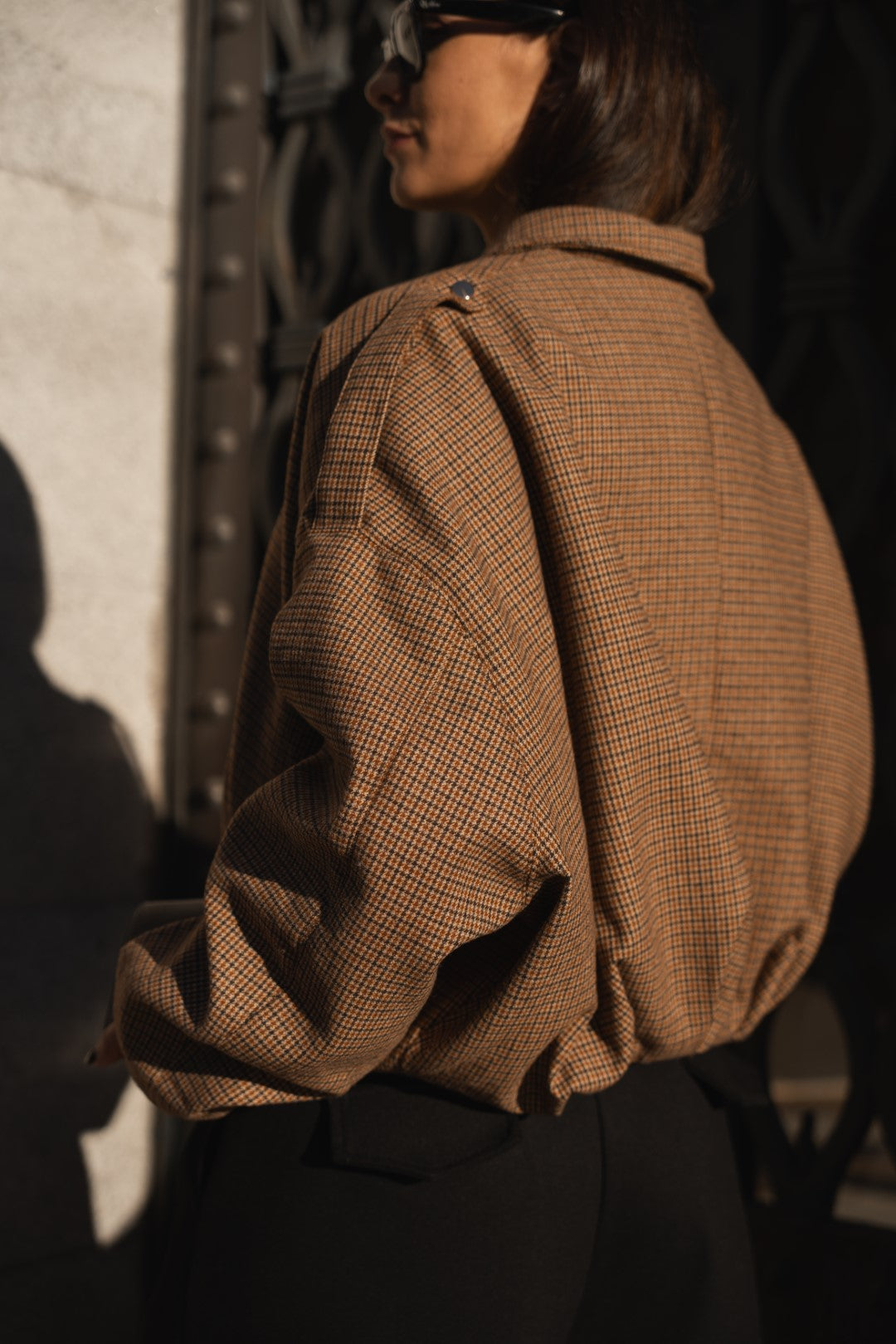 Short, oversized bomber jacket with light brown quilted lining, wide sleeves, and a gold front zip fastening. Finished in a woolen fabric.