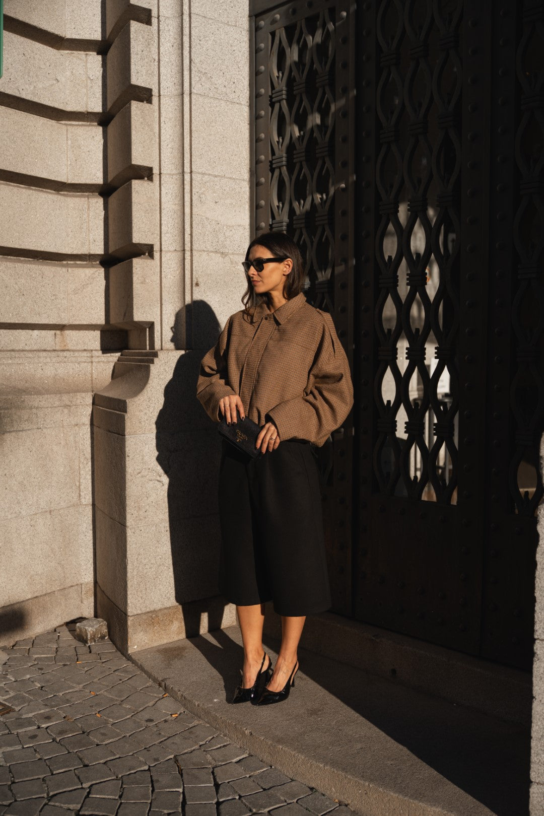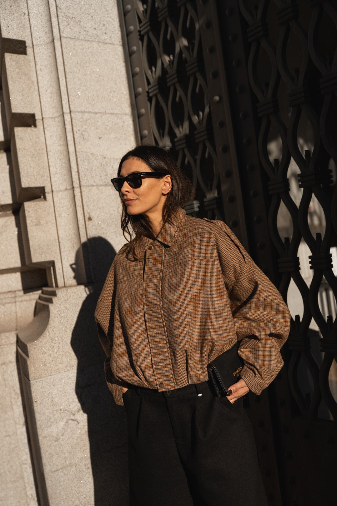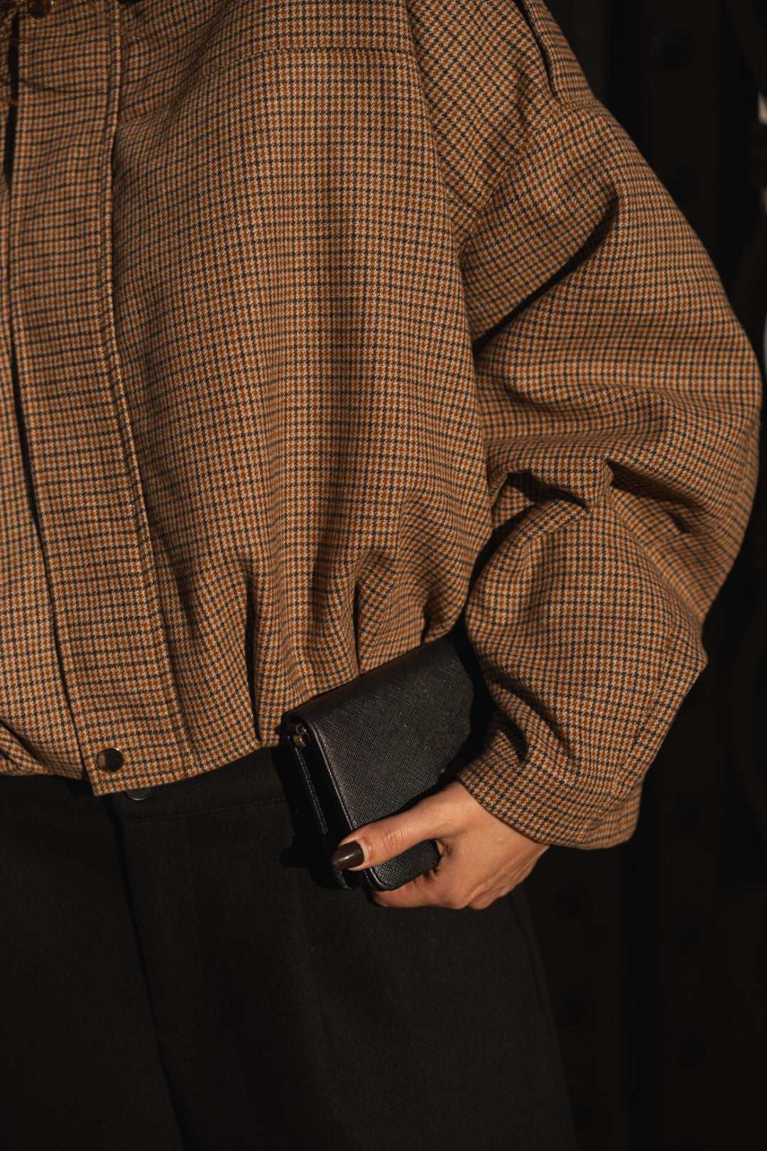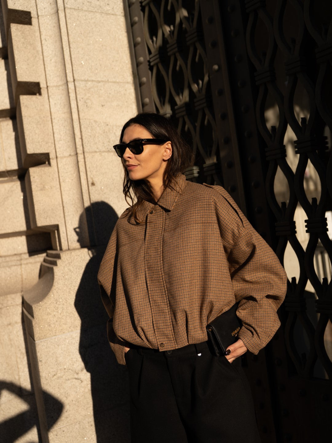 Short, oversized bomber jacket with light brown quilted lining, wide sleeves, and a gold front zip fastening. Finished in a woolen fabric.