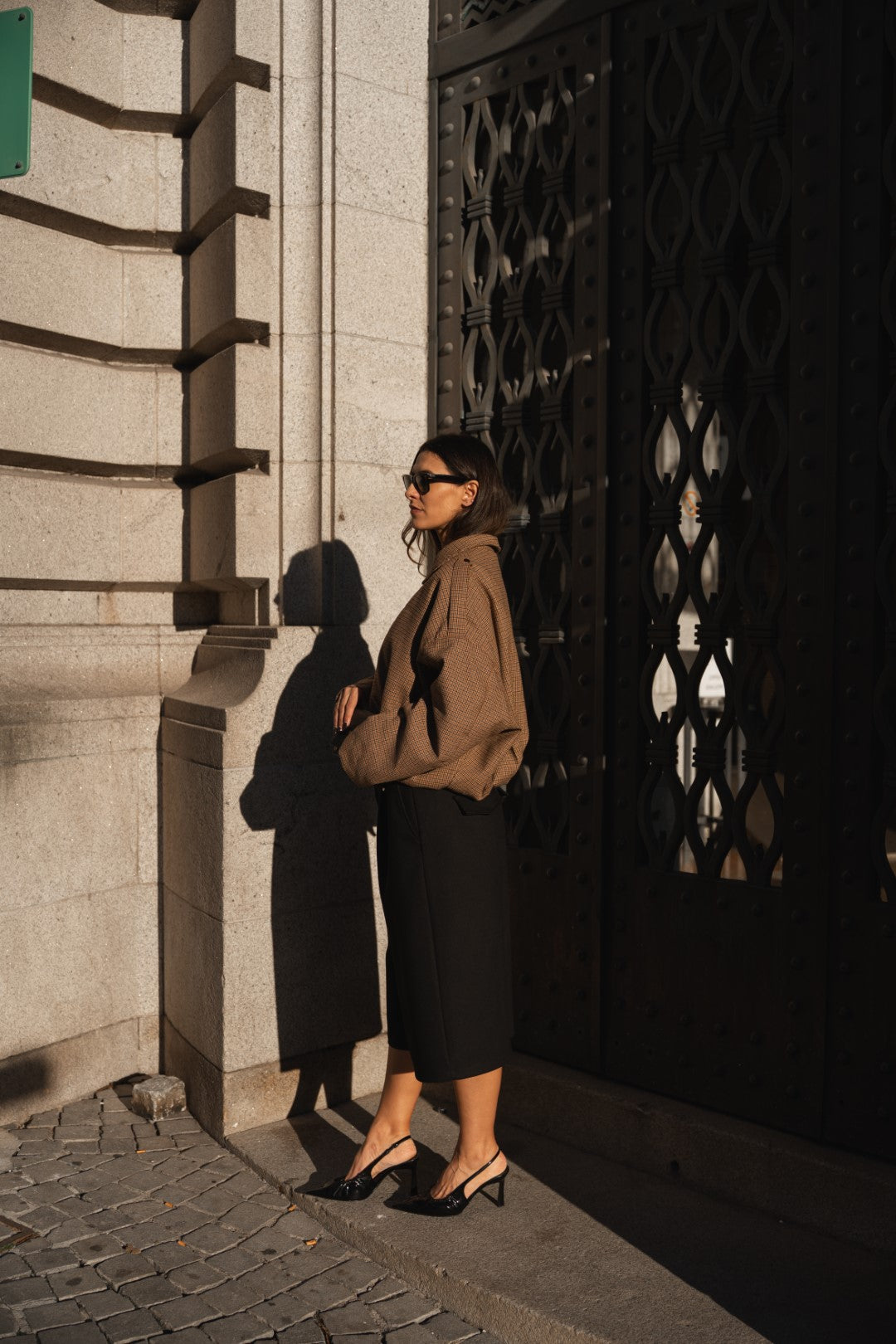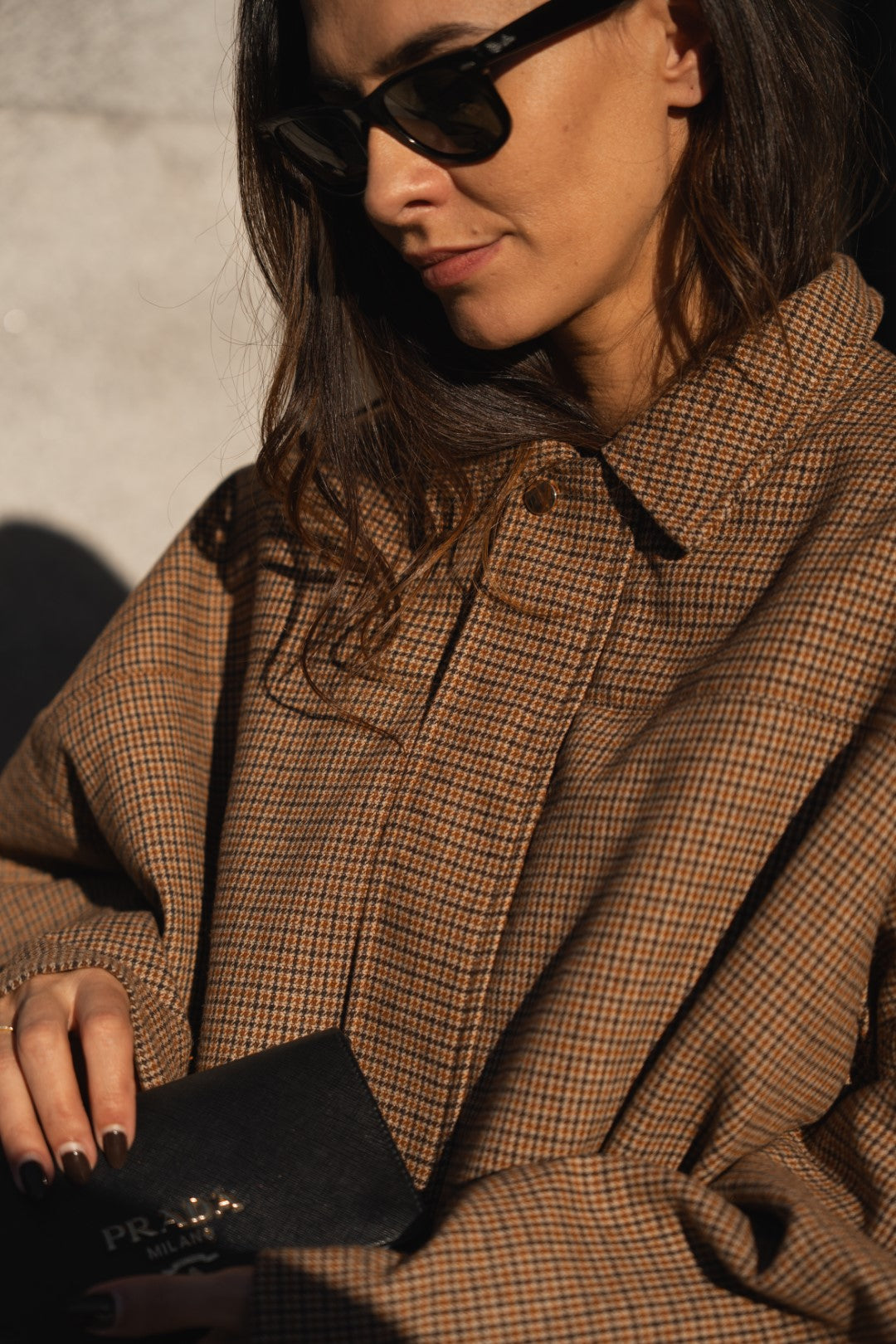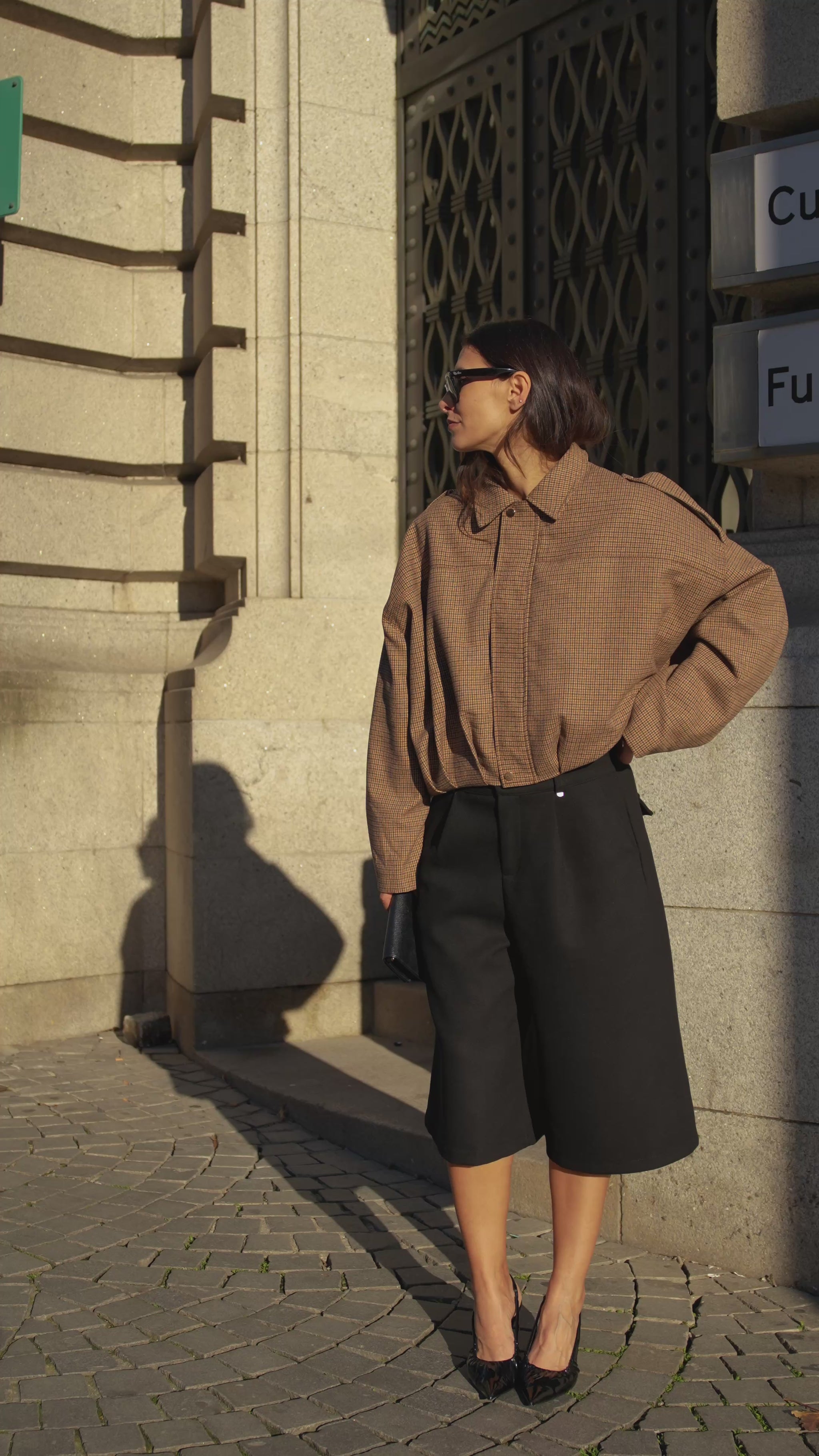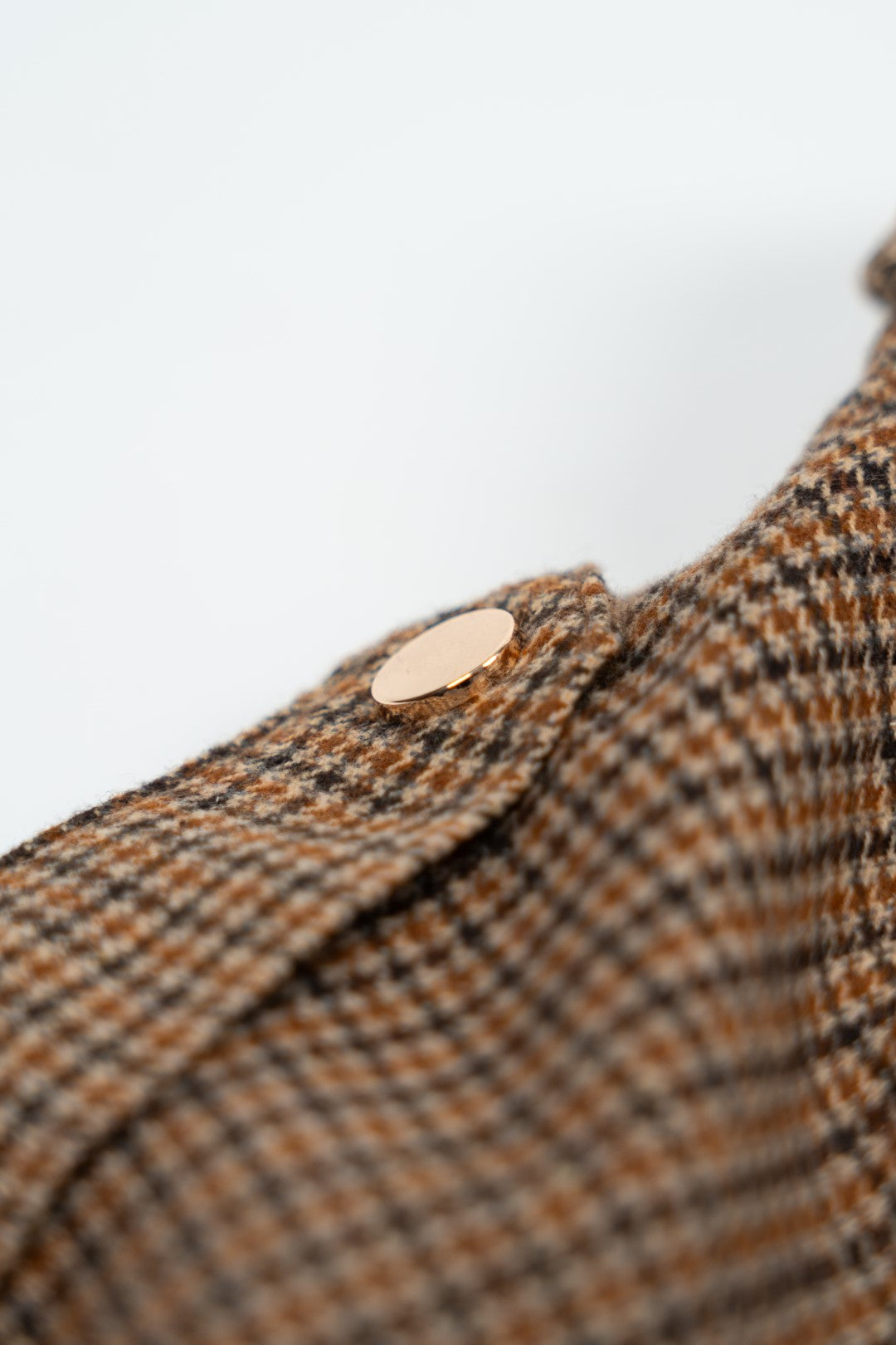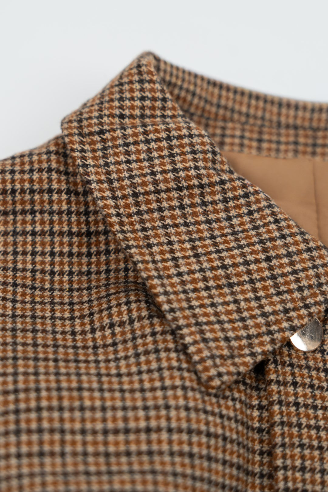 Short, oversized bomber jacket with light brown quilted lining, wide sleeves, and a gold front zip fastening. Finished in a woolen fabric.