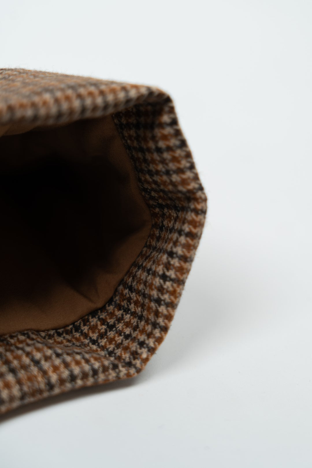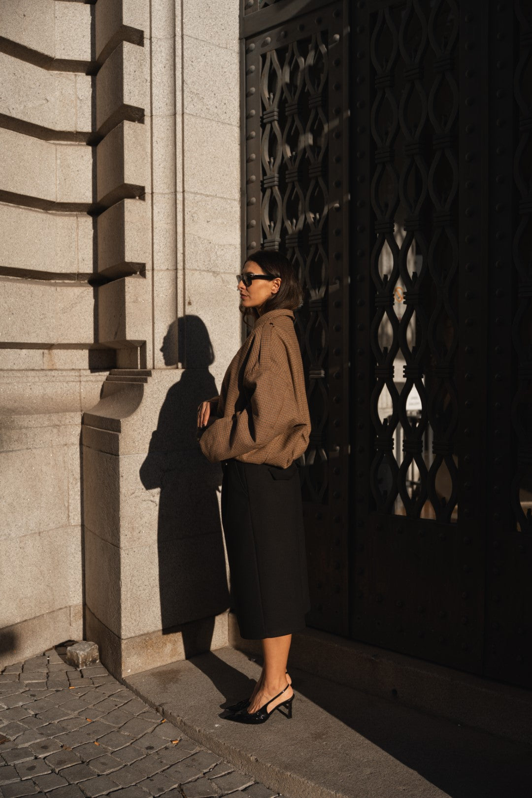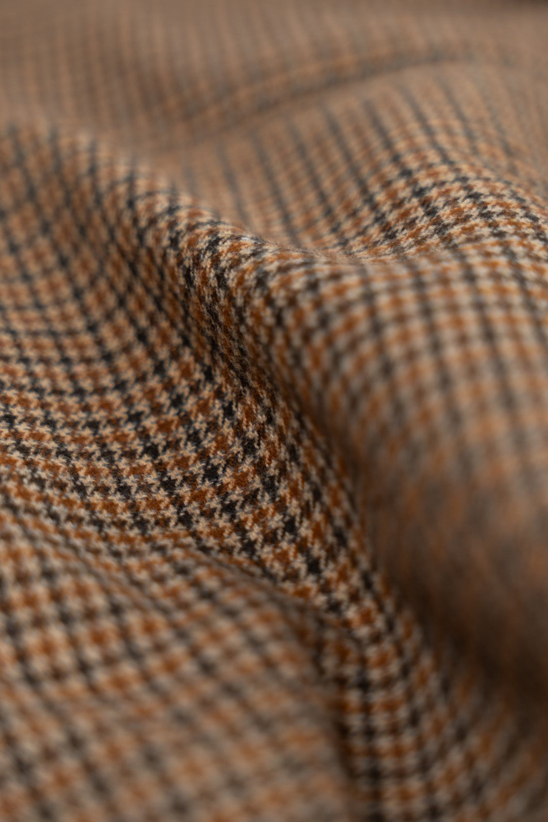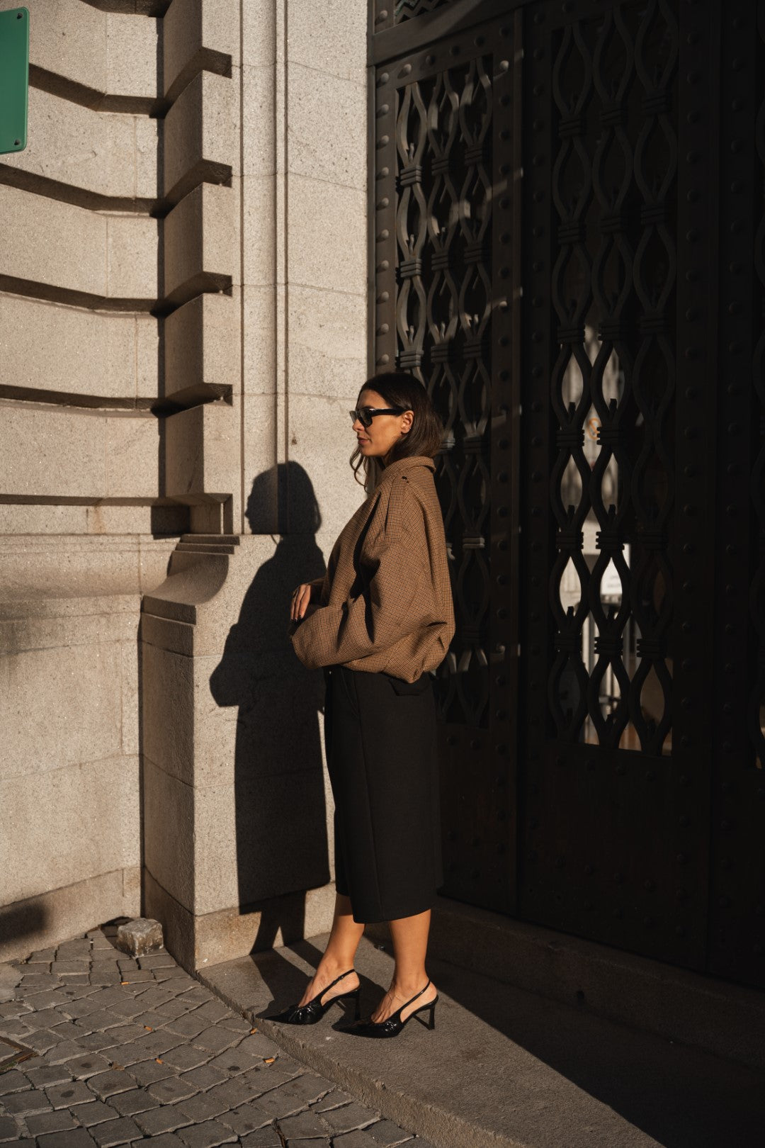 Short, oversized bomber jacket with light brown quilted lining, wide sleeves, and a gold front zip fastening. Finished in a woolen fabric.