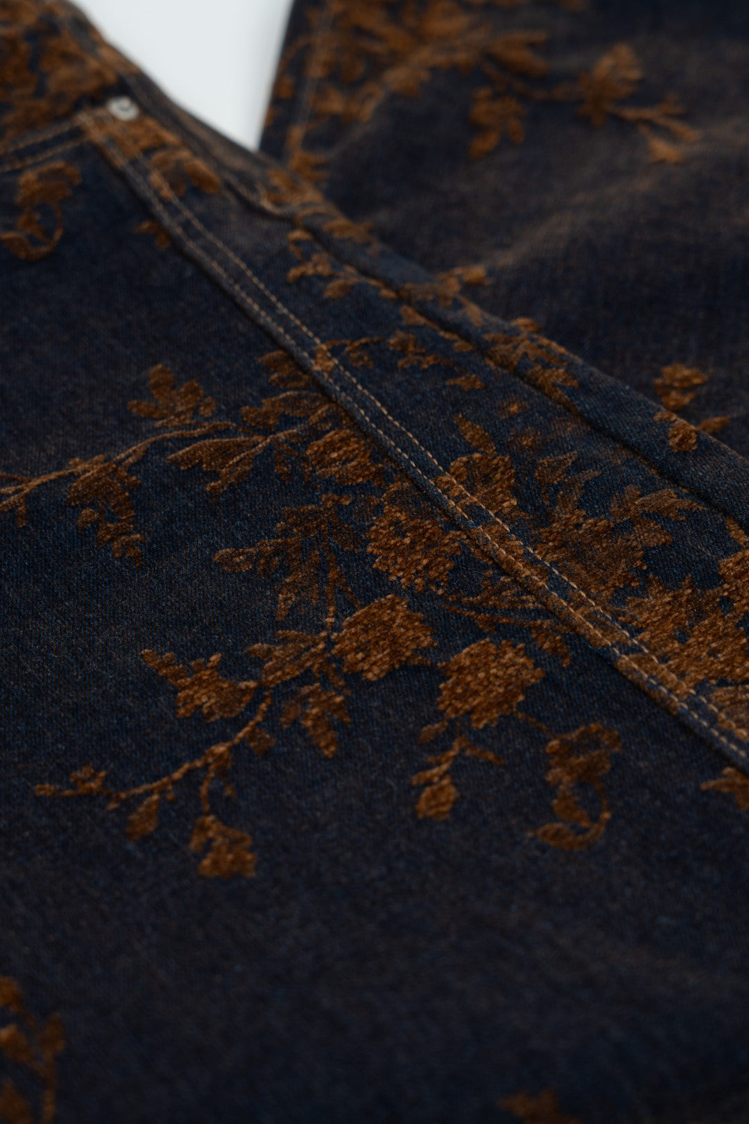 Balloon-style trousers. Floral pattern detail in velvety fabric with gold tones. Features five traditional pockets, zip and button closure at the front. Straight cut detail from the pockets to the hem.
