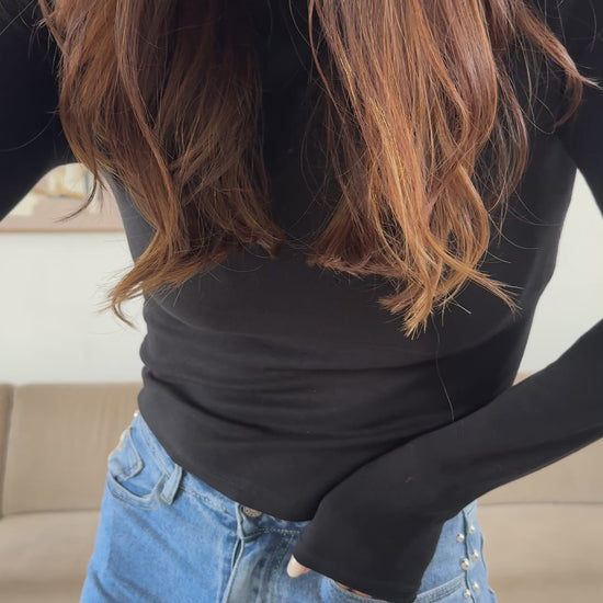 High-waisted pants with silver studs on the sides. Dark black, ideal for a casual, modern look. Comfortable, versatile, and stretchy.