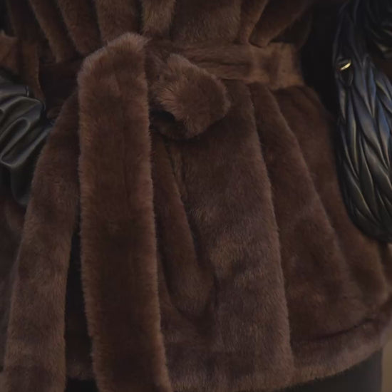 Faux fur coat, lined, with hood and matching fur belt.