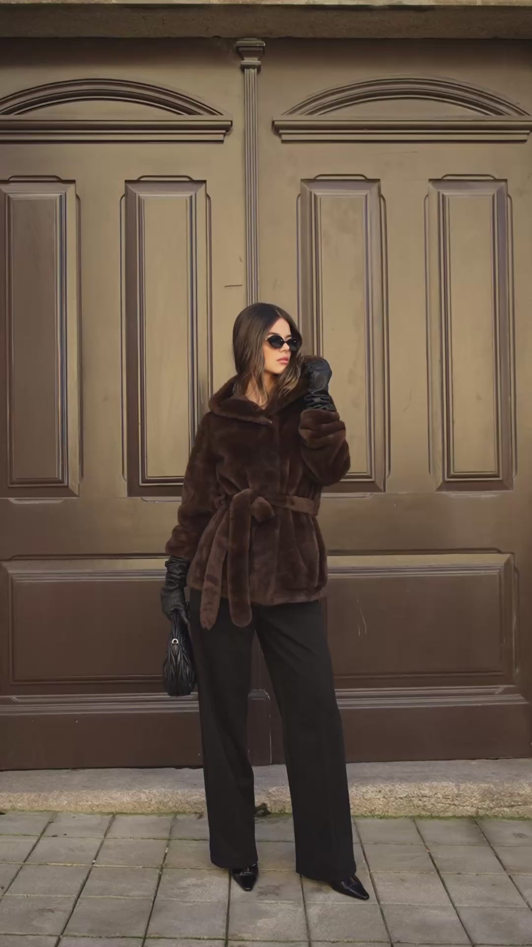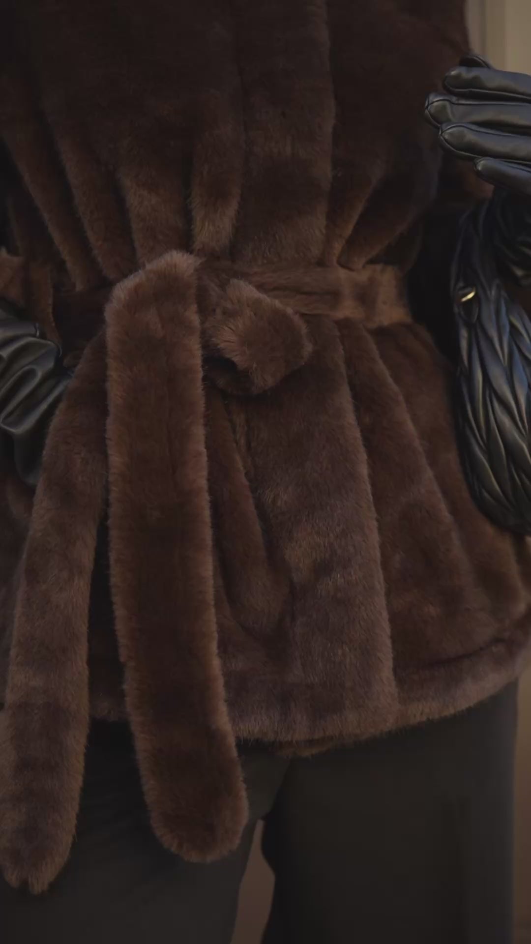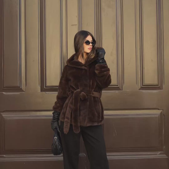 Brown fur coat with hood.