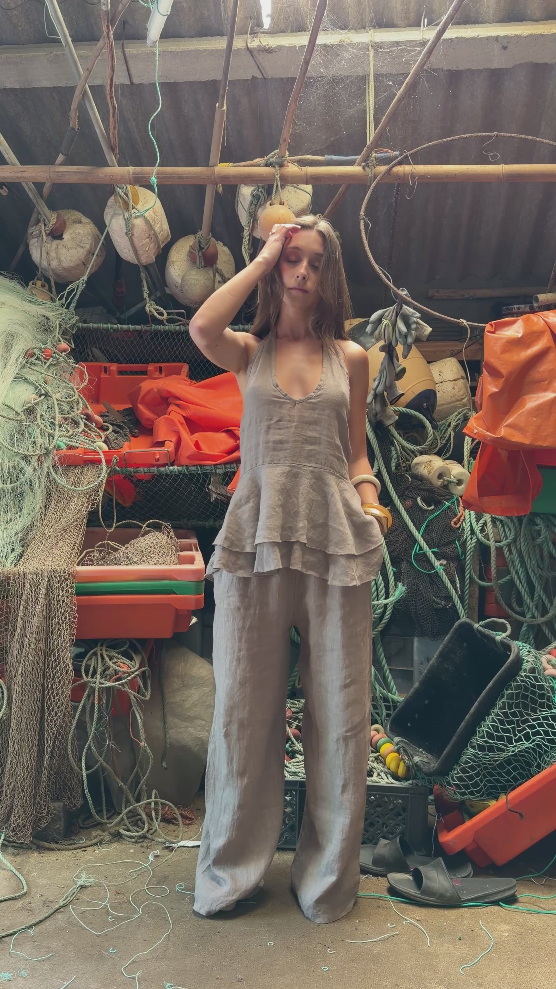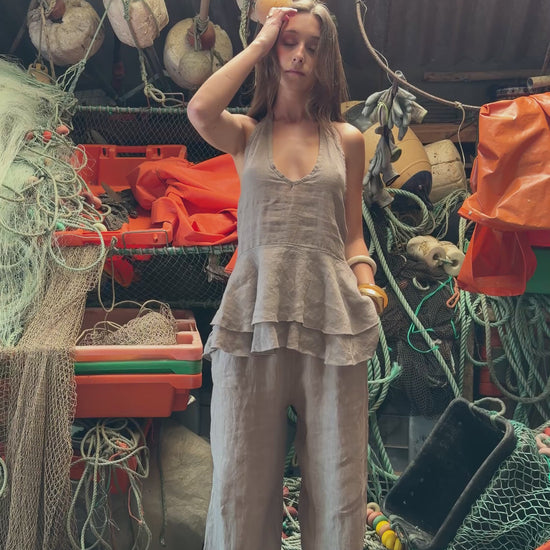 Taupe linen top and pants set. The top fastens at the open back, with a knot at the back and elastic at the back. Made from lightweight, flowing linen fabric. Pants with elastic waistband and pockets. Fits comfortably from... S to the XL.