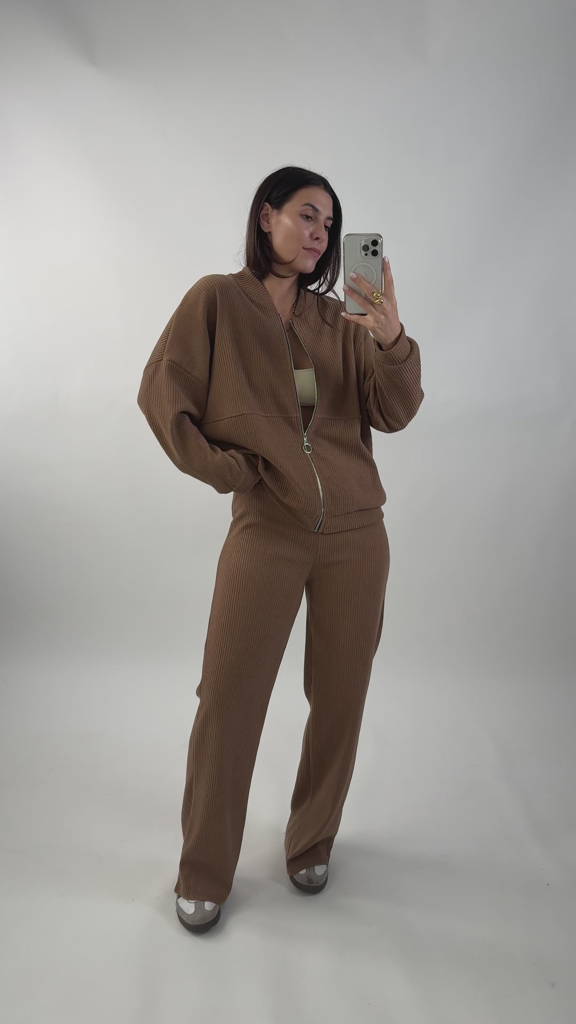 Set consisting of bomber jacket and straight-cut corduroy trousers. The trousers have an elastic waistband. The bomber jacket fastens with a zip and has an elastic waistband. One size fits all. S to the L.