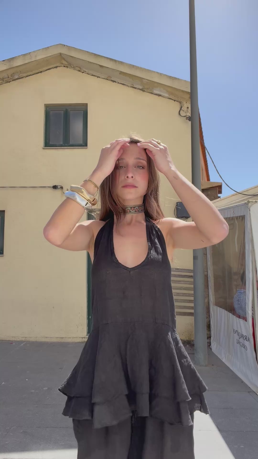 Black linen top and pants set. The top fastens at the back, with an open knot at the neck and elastic at the back. Made from lightweight, flowing linen fabric. Pants with elastic waistband and pockets. Fits comfortably from... S to the XL.