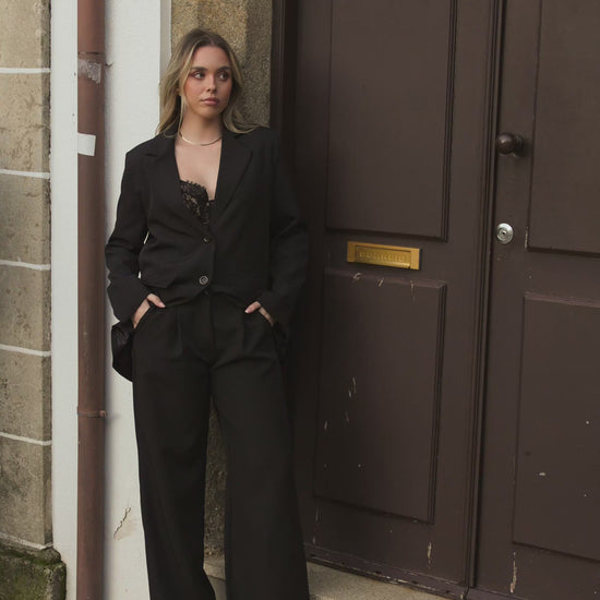 Suit consisting of trousers and blazer. The trousers are straight cut, have an elasticated waistband with belt loops, fasten with a zip and button, and have pockets. The blazer is oversized, fastens with two buttons, and is fully lined.