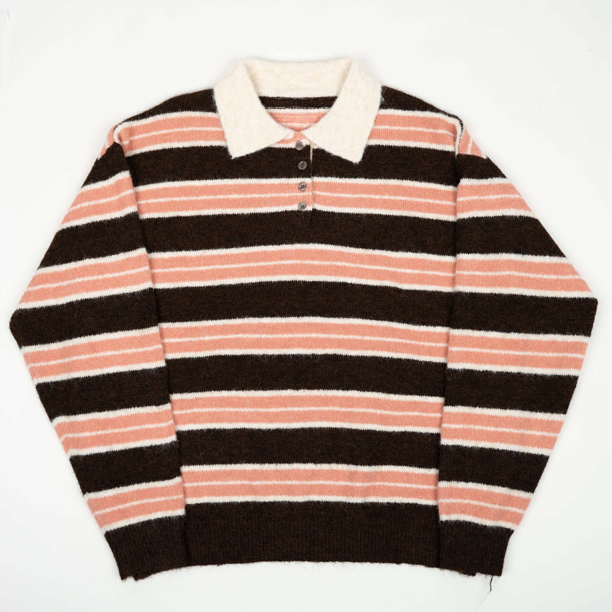 Soft and cozy knit polo shirt with a striped pattern in shades of brown, pink, and ecru. Long-sleeved design with a classic contrasting collar and button-front closure.