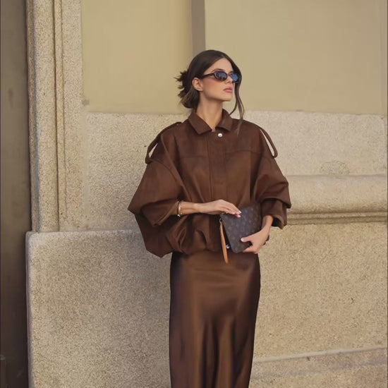Midi skirt in satin effect with lace detail at the hem. Features an elastic waistband; fabric has some stretch.