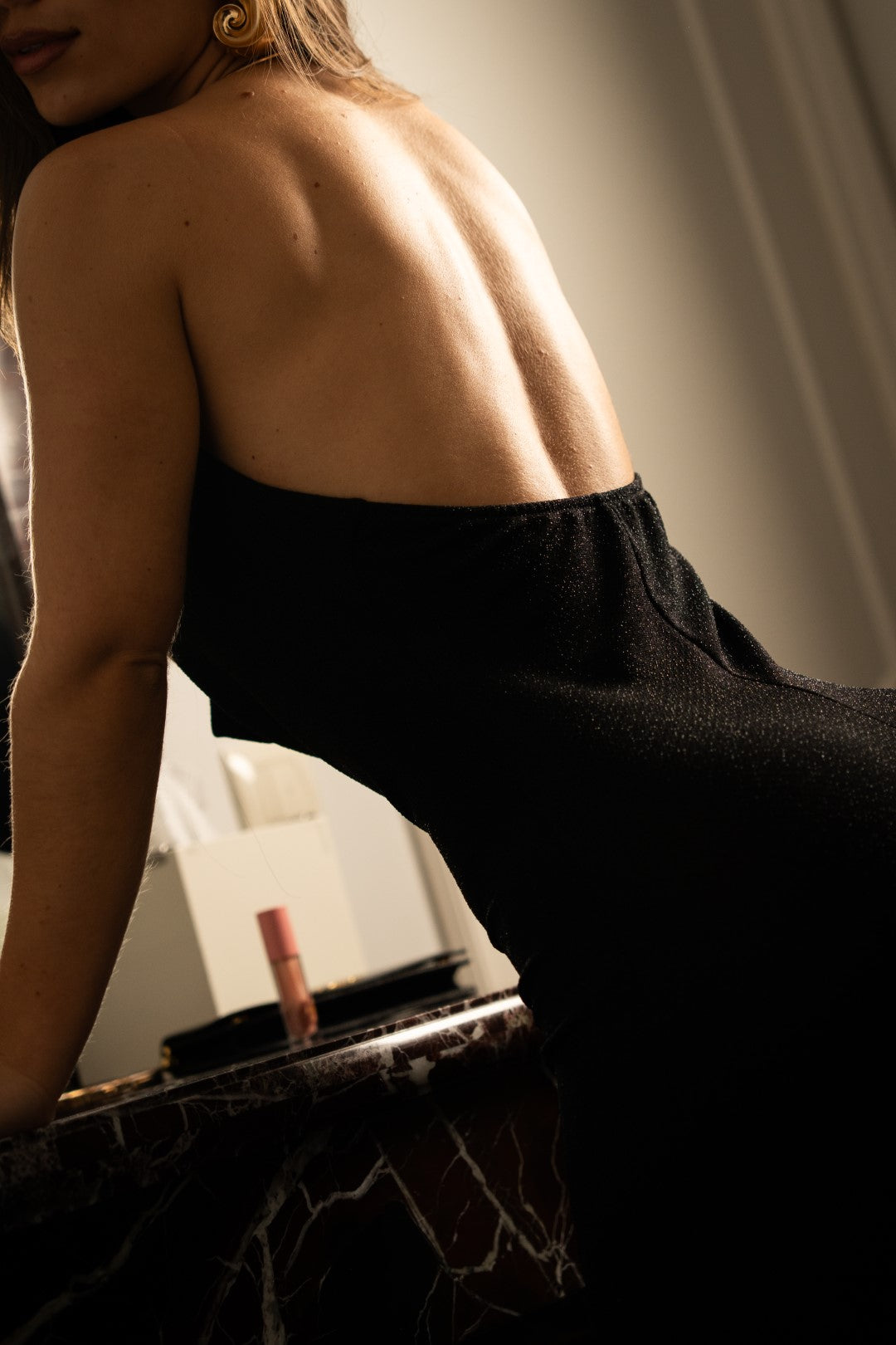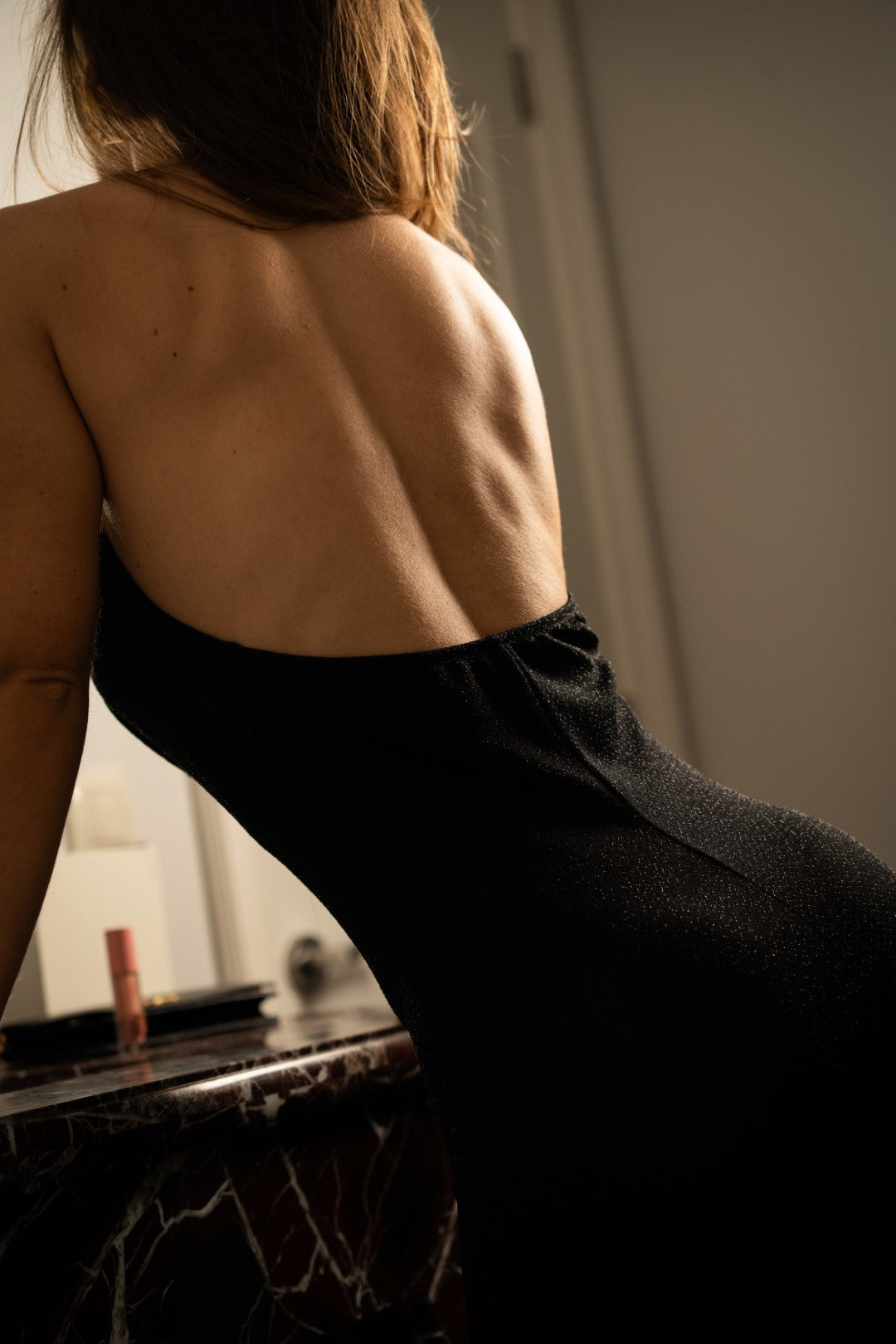 Long dress with a draped neckline, gold choker detail, and open back. Made from black fabric with subtle shimmer and stretch. Features double fabric at the bust. Fits from... S to the L.