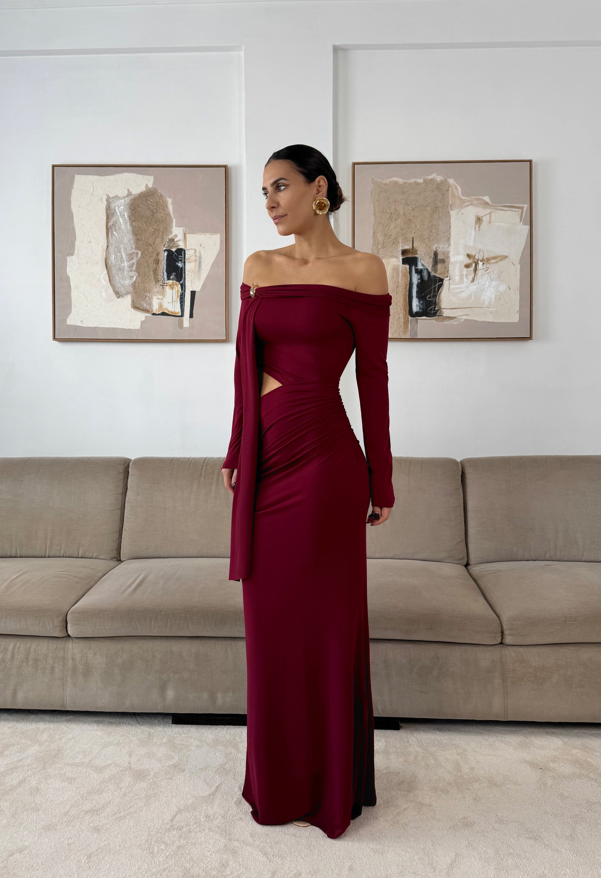 Elegant dress in flowing fabric, with front draping and gold detail on the shoulder. Asymmetrical design with a cutout on the right side.