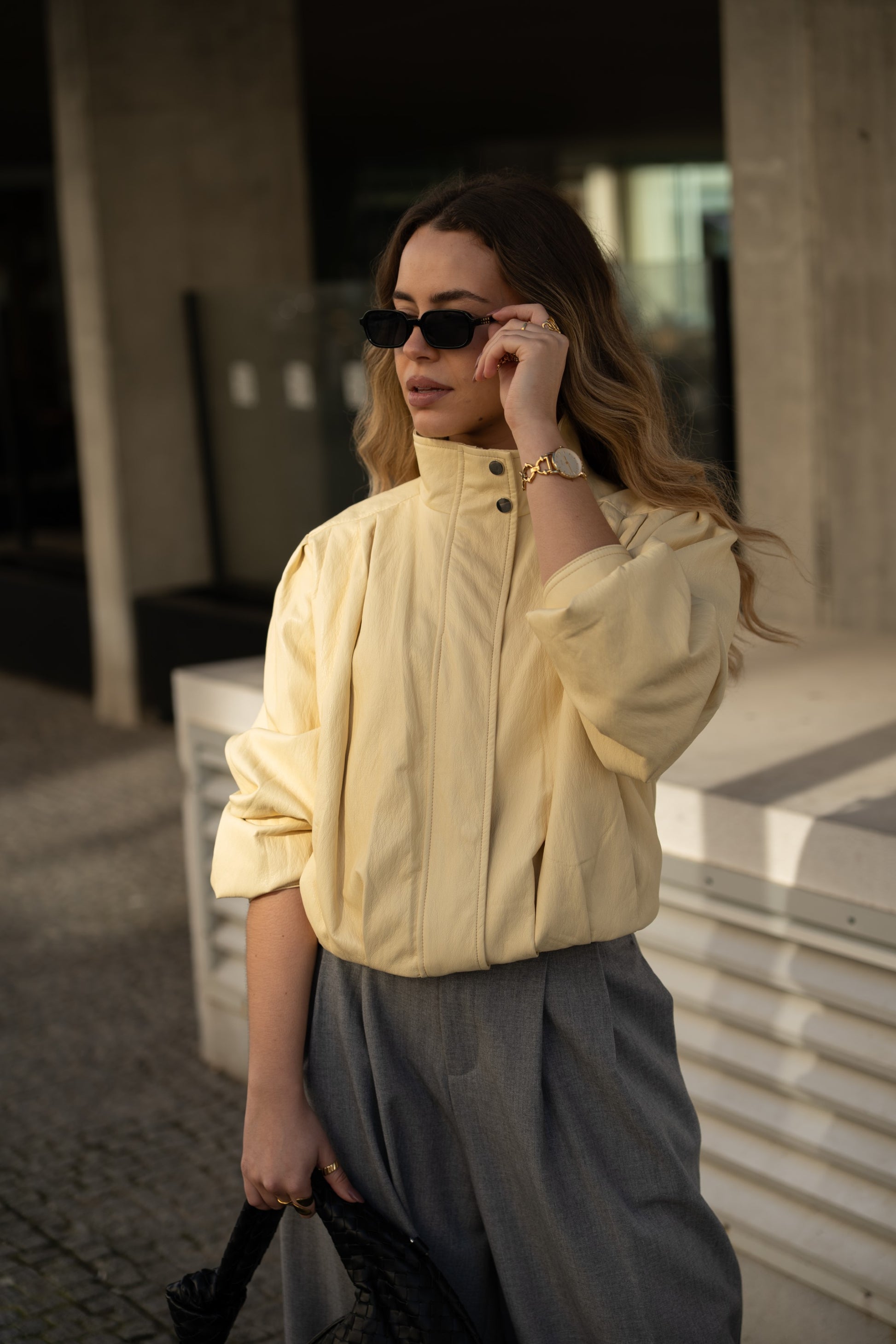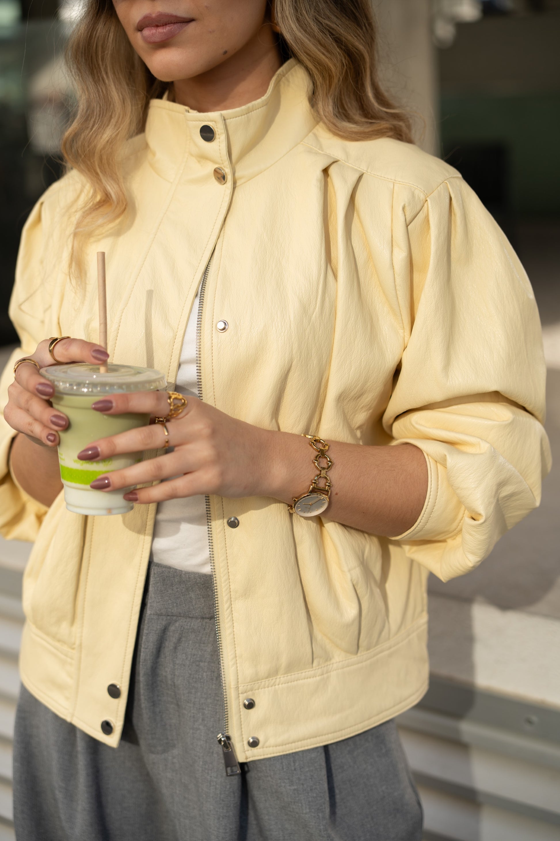 Chaqueta de piel sintética color mantequilla amarilla