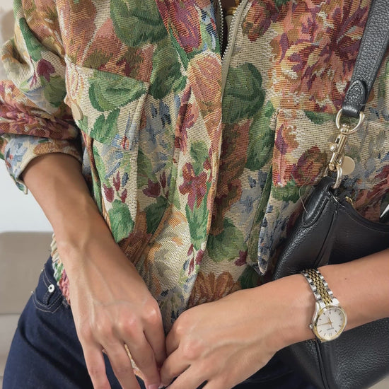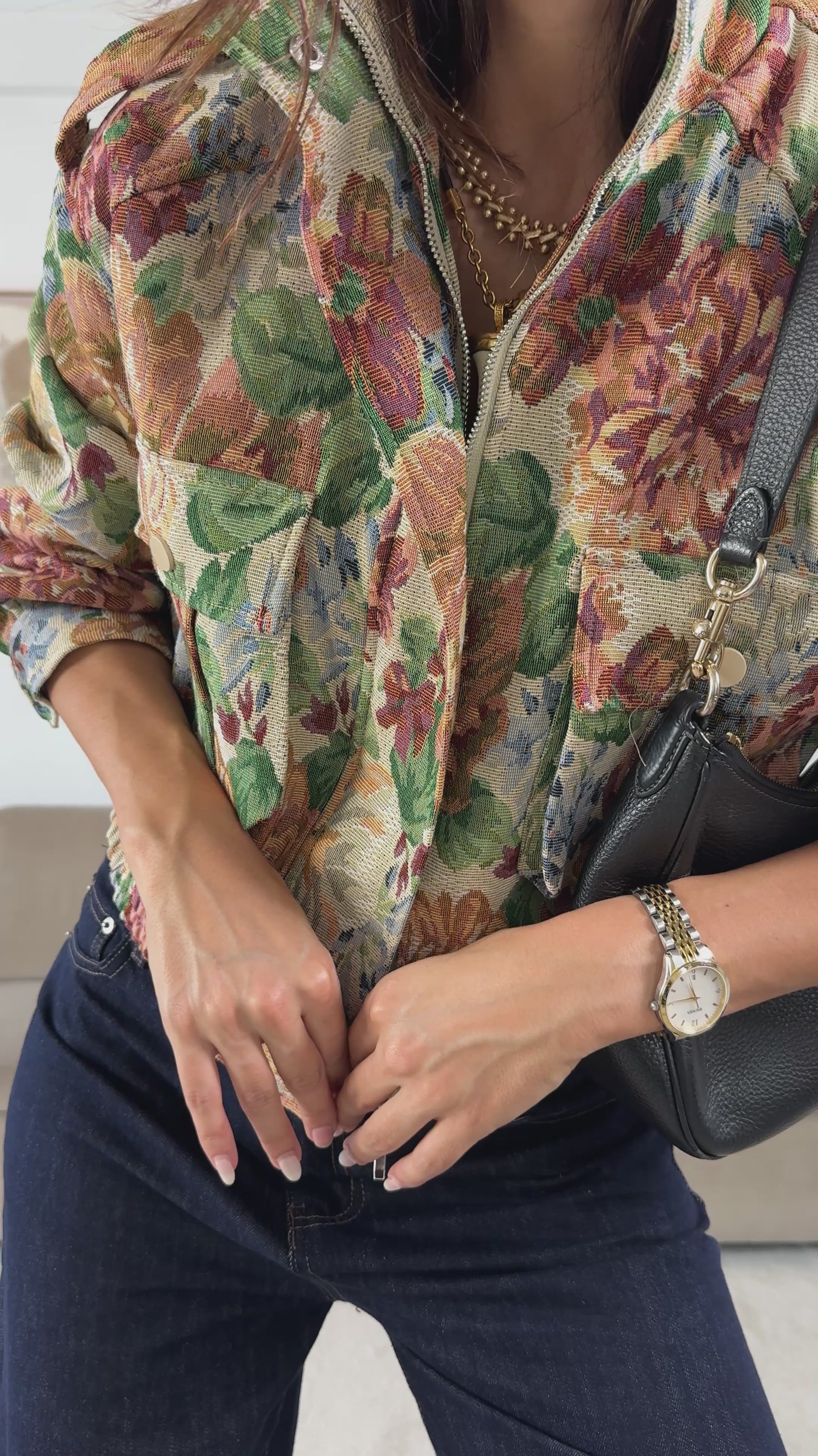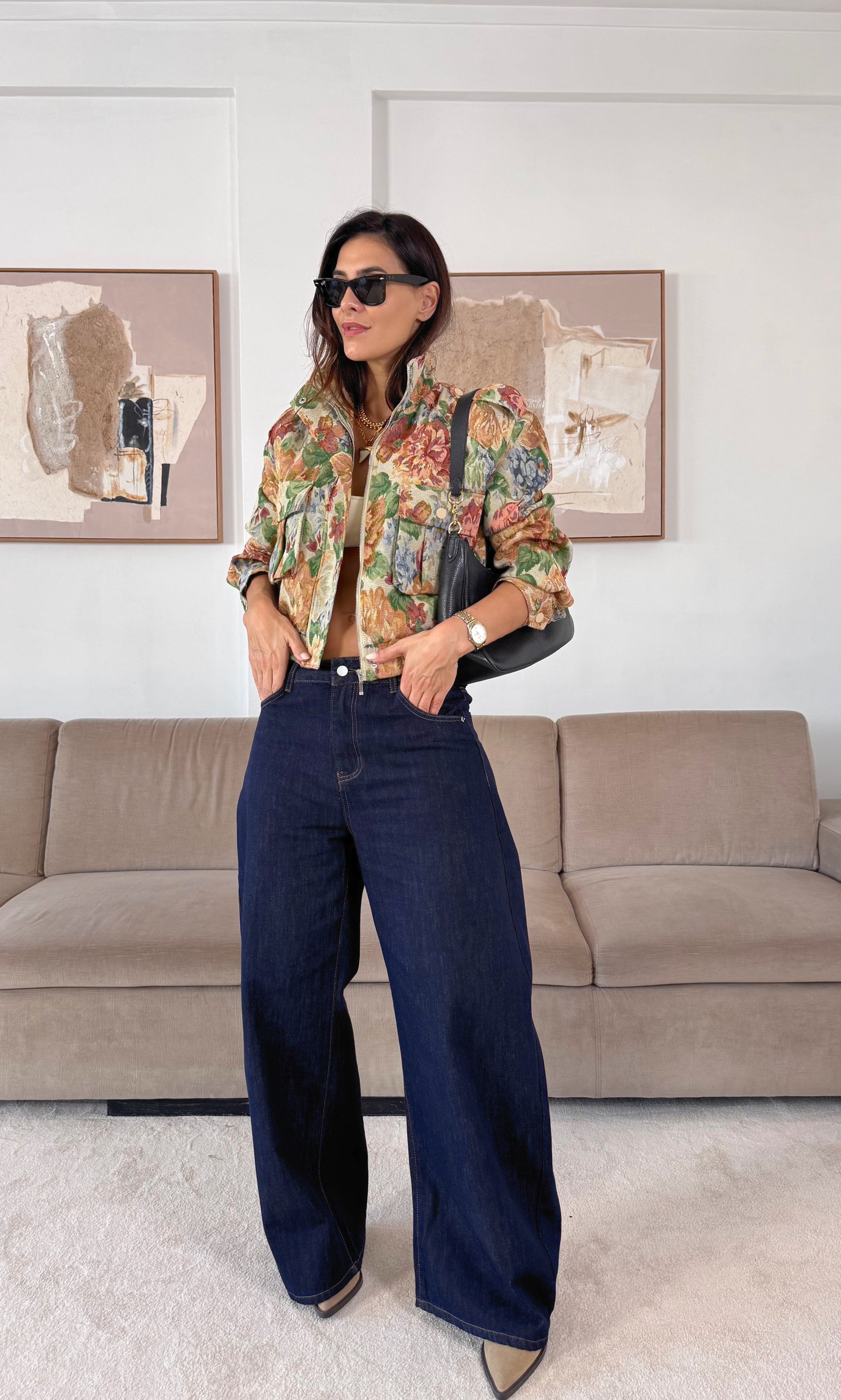 Chaqueta bomber estampada en tejido tipo lino. Tiene cinturilla elástica, está forrado, tiene medio cuello y se abrocha con botones a presión. Tiene bolsillos y botón a presión en los puños.
