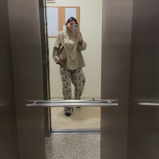 Pantalones de corte globo con estampado de leopardo y detalles burdeos. Presentan bolsillos clásicos y cintura alta. Un modelo muy largo.