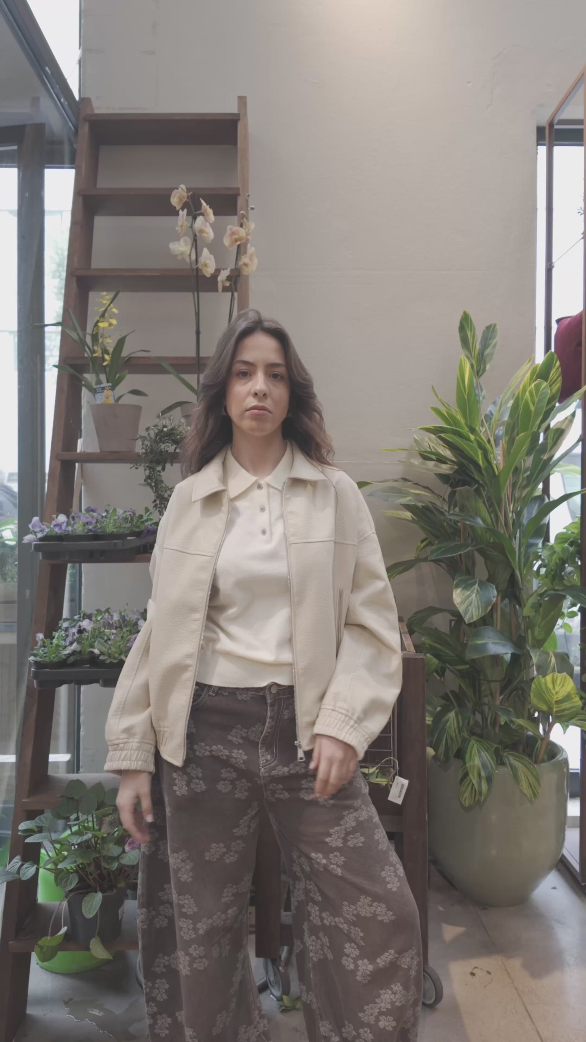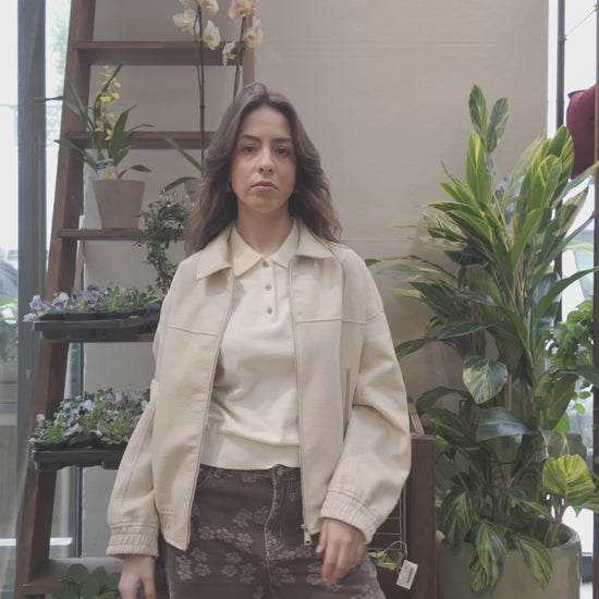 Veste beige en similicuir à la coupe oversize. Fermeture zippée. Poches zippées. Taille et poignets élastiqués. Doublure. Taille unique. S au L.