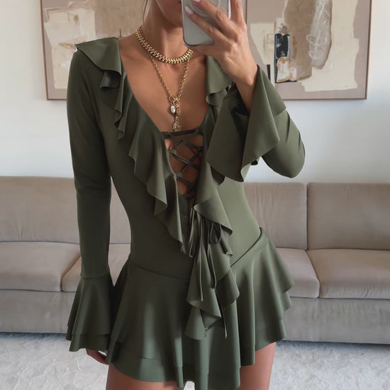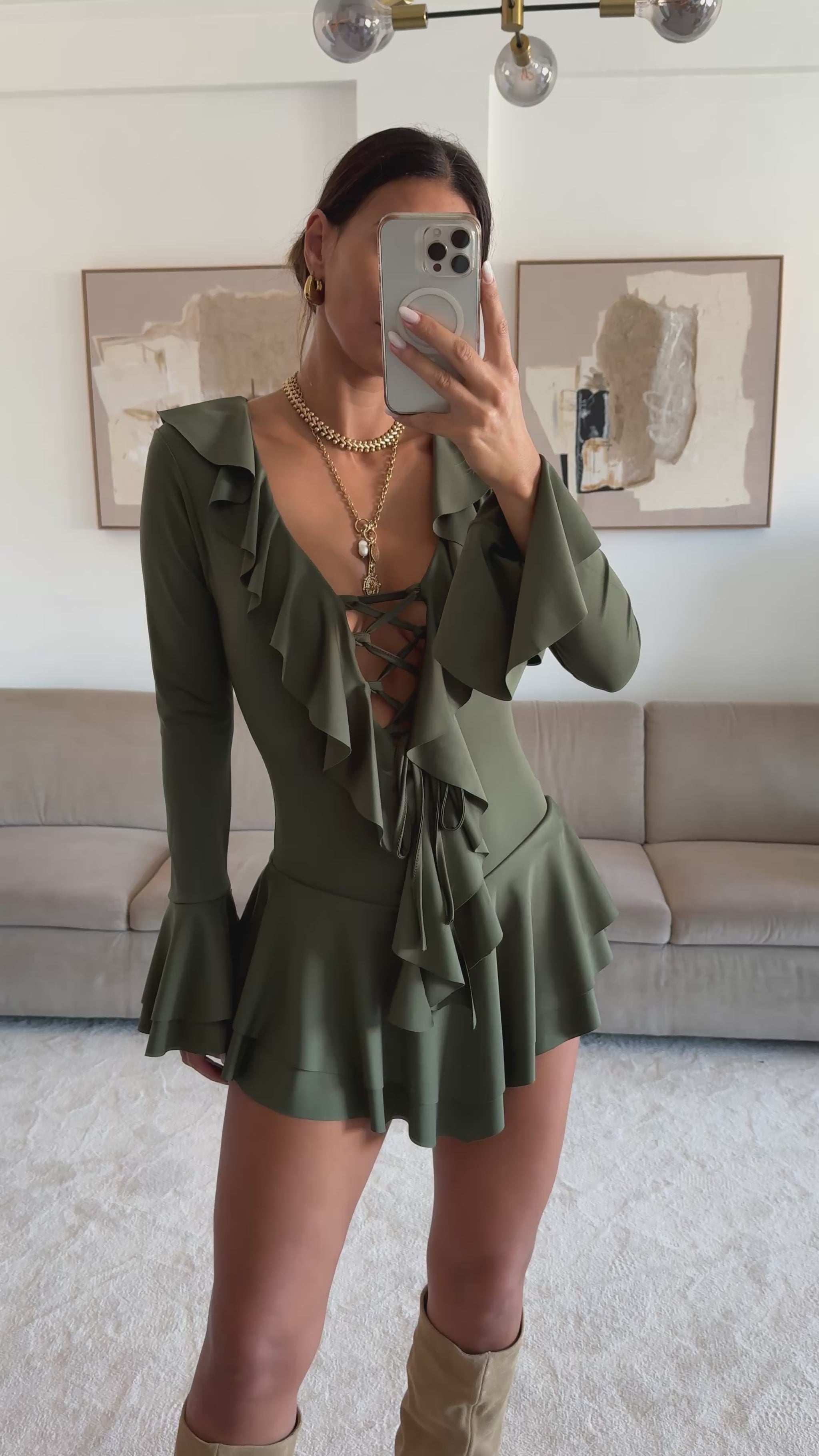 Combinaison façon robe avec détails extensibles et volants. Encolure entièrement ajustable. Peut être portée avec un soutien-gorge.