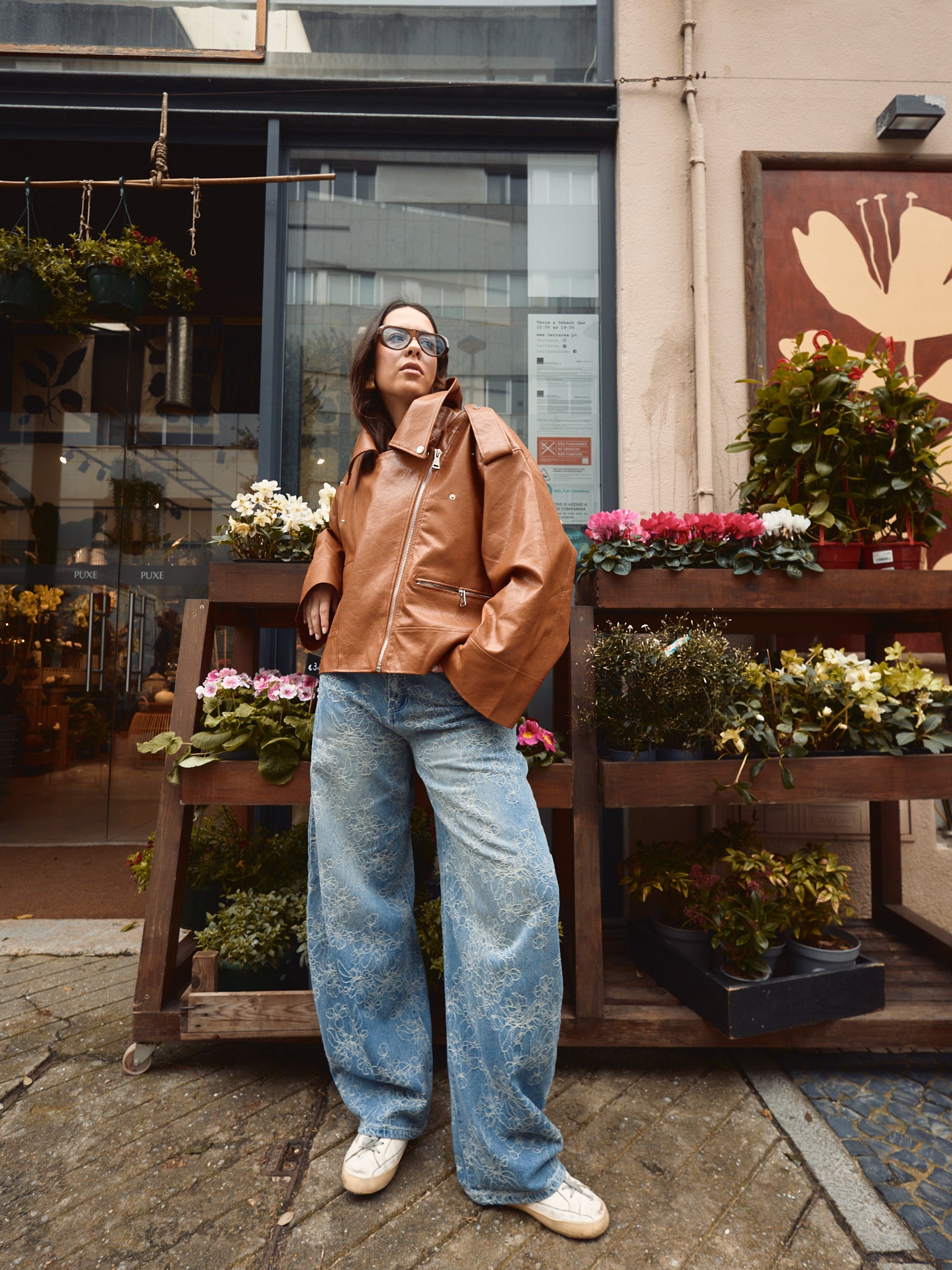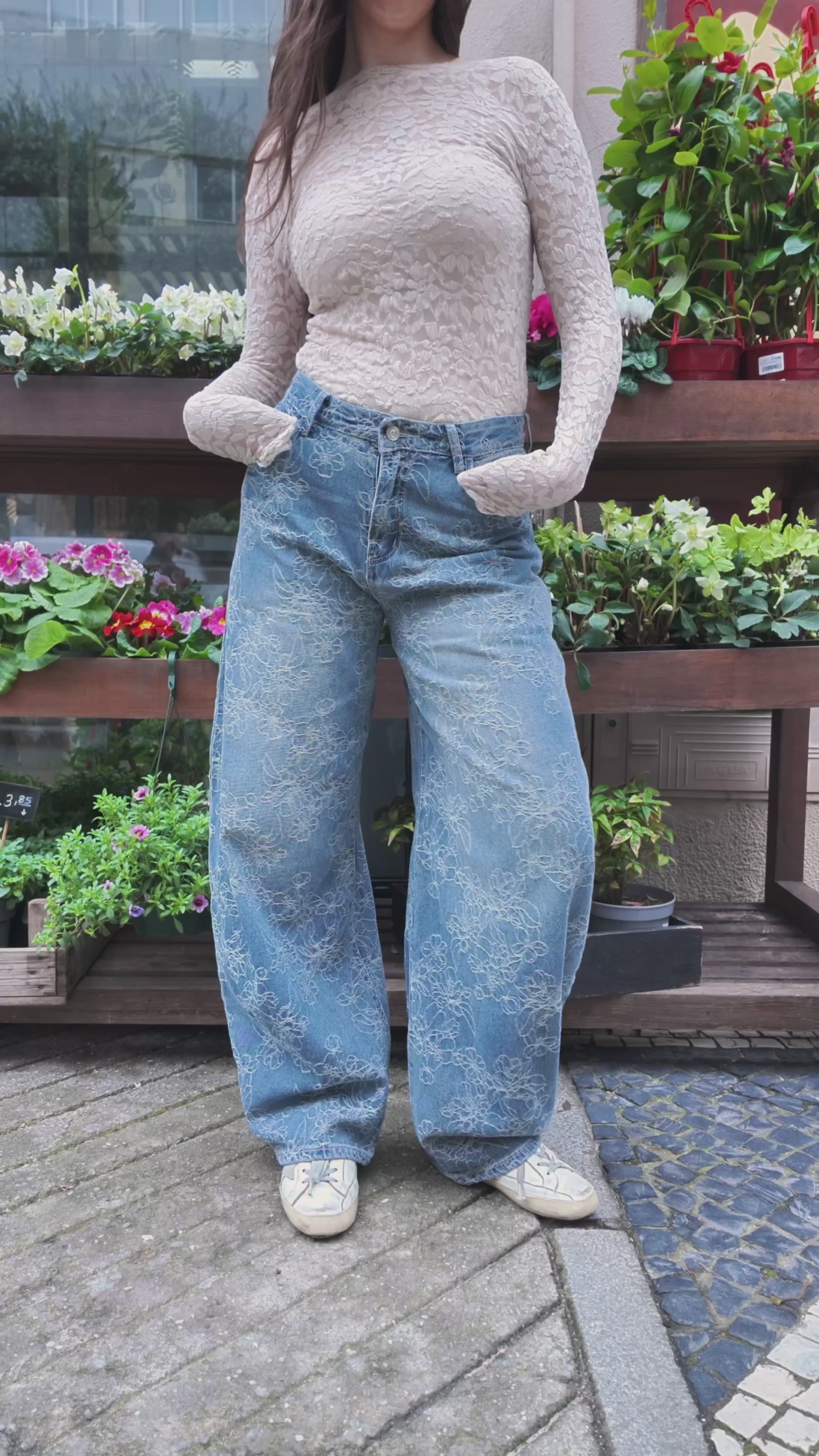Pantaloni a palloncino. Dettaglio con motivo floreale cucito nei toni del beige. Presentano cinque tasche tradizionali e chiusura frontale con cerniera e bottone.