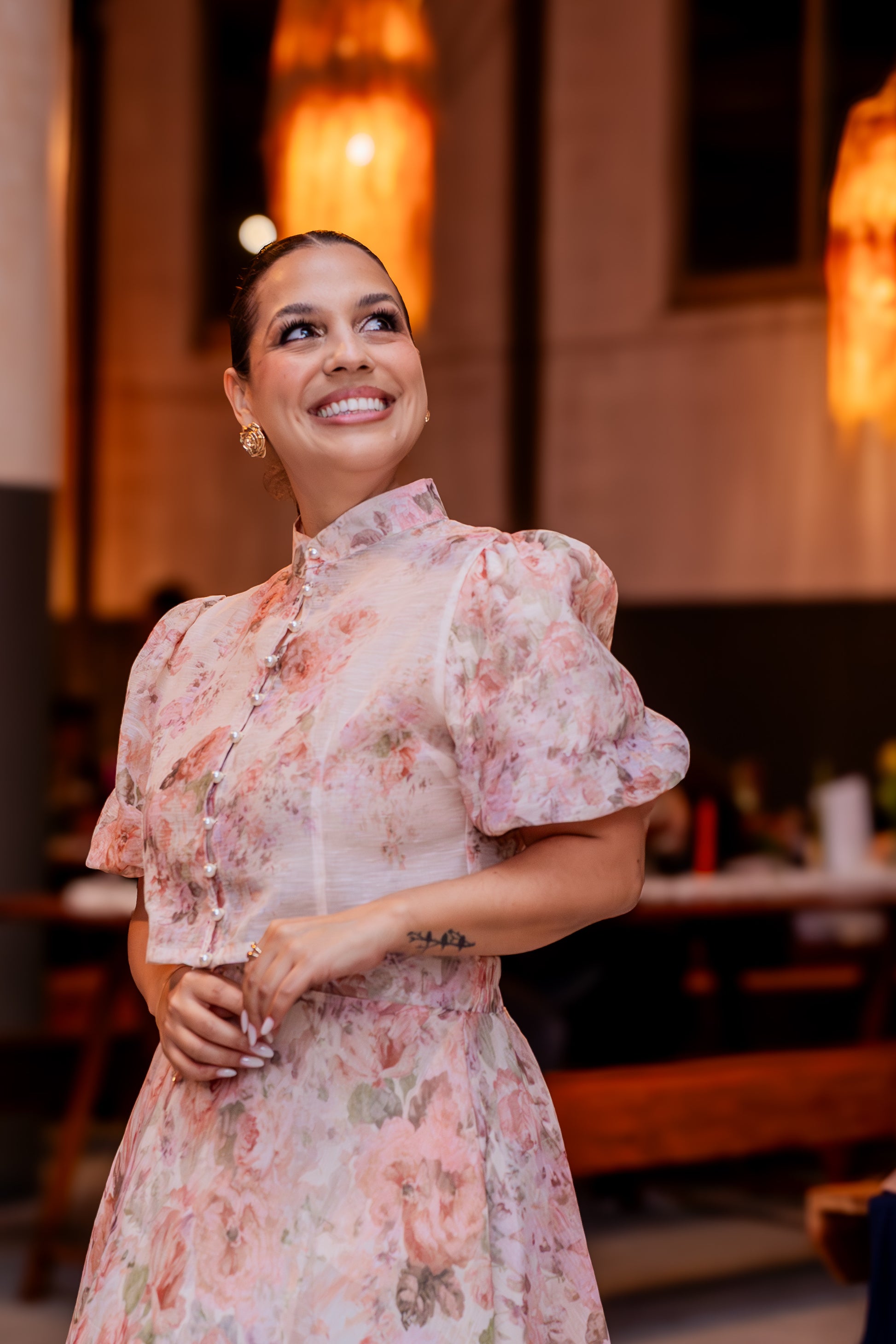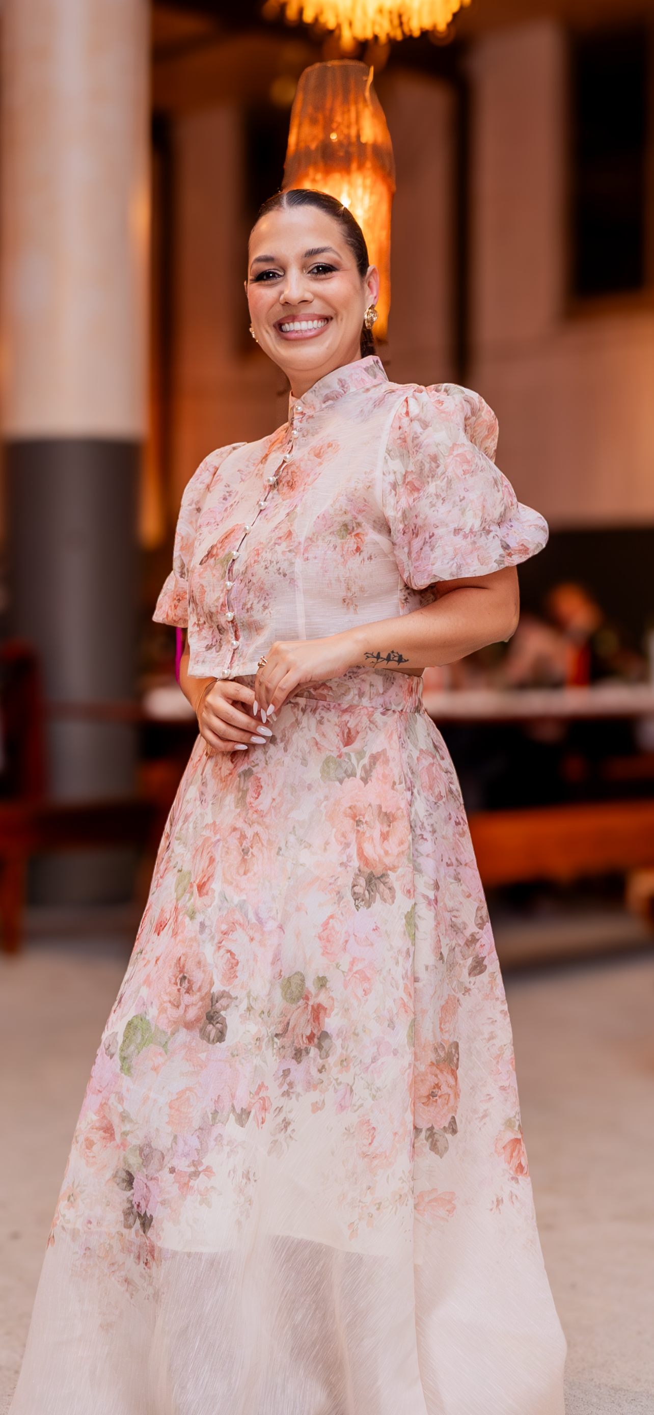 Completo composto da camicetta a maniche corte, top e gonna midi. Il tessuto è robusto e foderato. La gonna è svasata. Si chiude lateralmente con una chiusura invisibile, ha elastico in vita e fodera posteriore. La camicetta ha un colletto "Frade", polsini elastici con volant, trasparenza e si chiude con bottoni in madreperla. Il top ha spalline regolabili ed elastico.