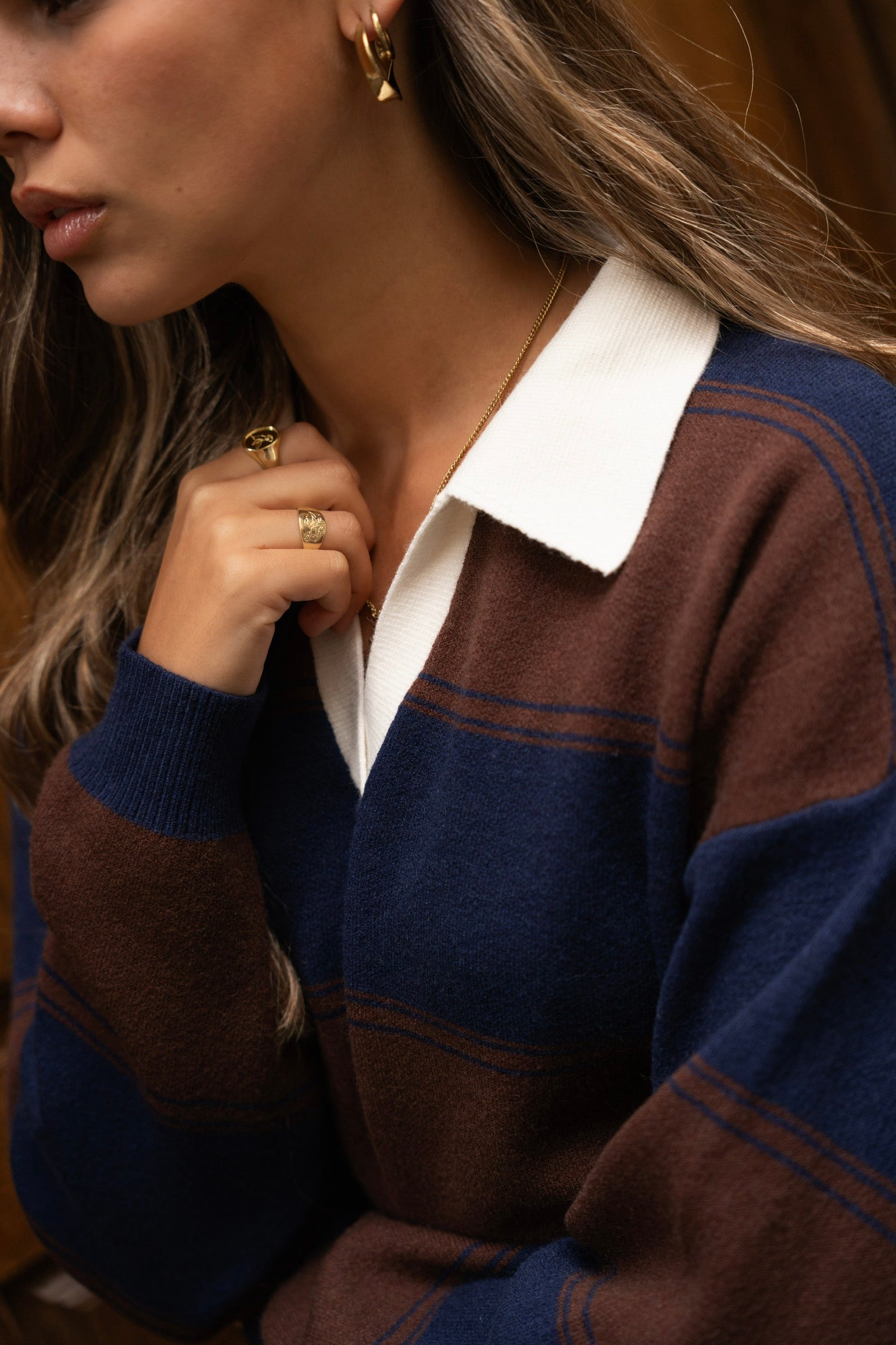 Polo a maniche lunghe Presenta ampie strisce blu e cioccolato e scollo a V. È elasticizzato.