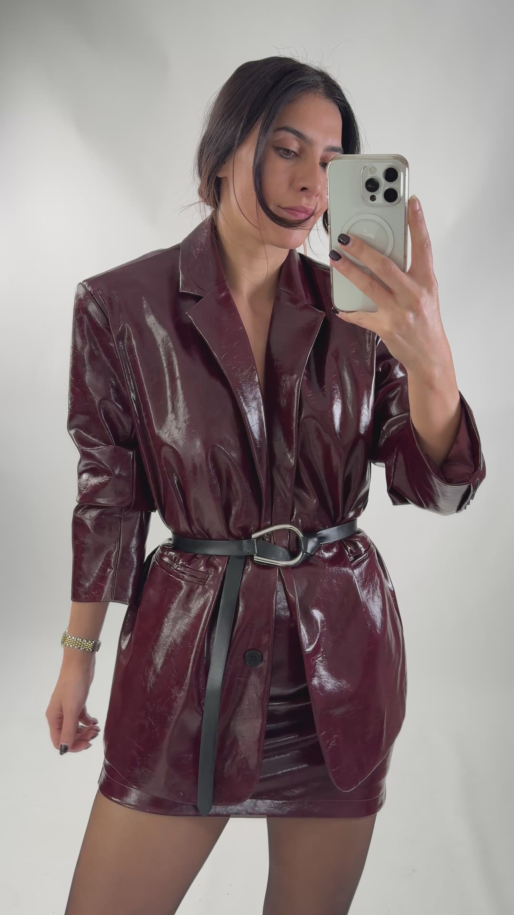 Oversized blazer in lakstof krokodillenhuideffect. Het is gevoerd en heeft schoudervullingen, zakken aan de voorkant en knoopsluiting.