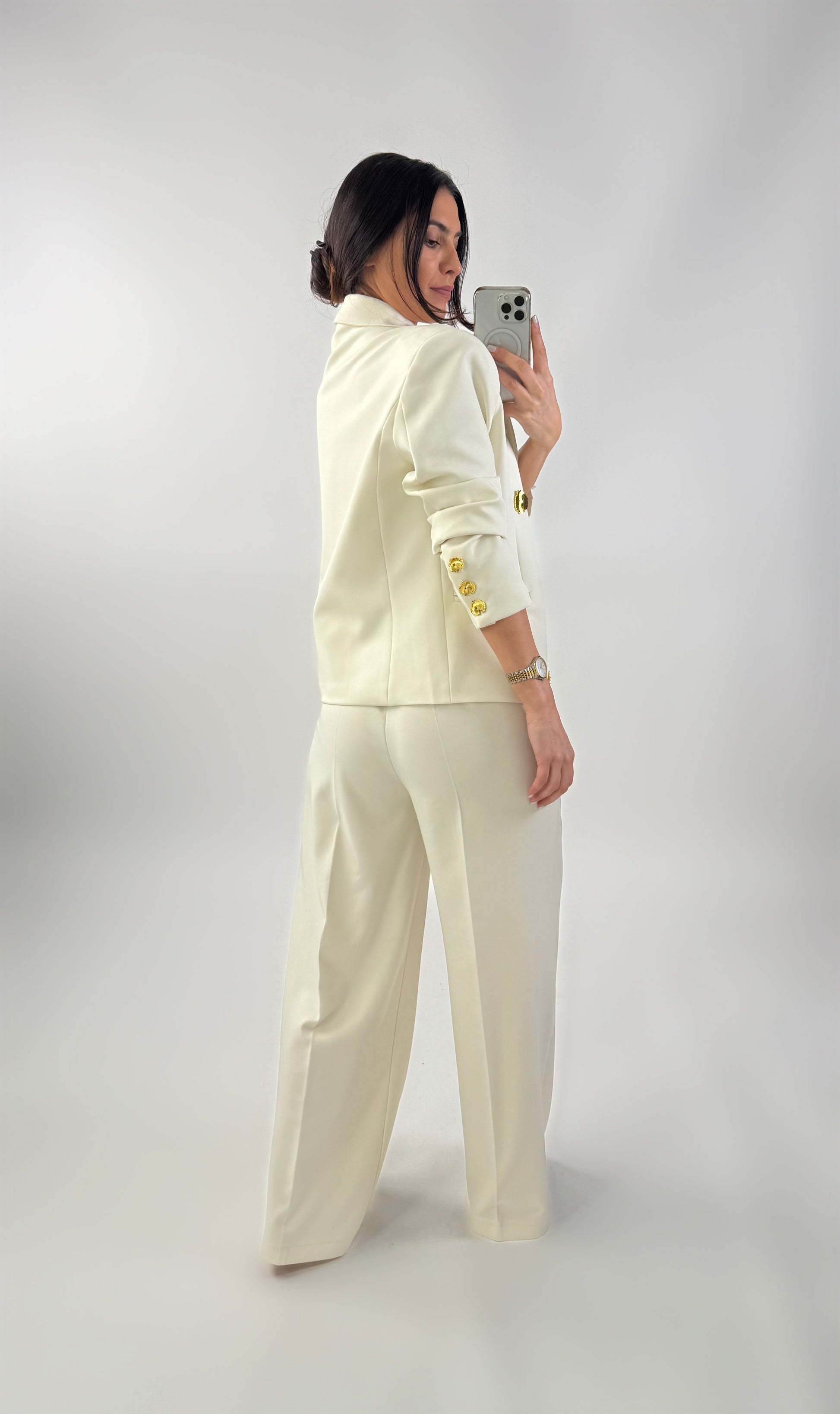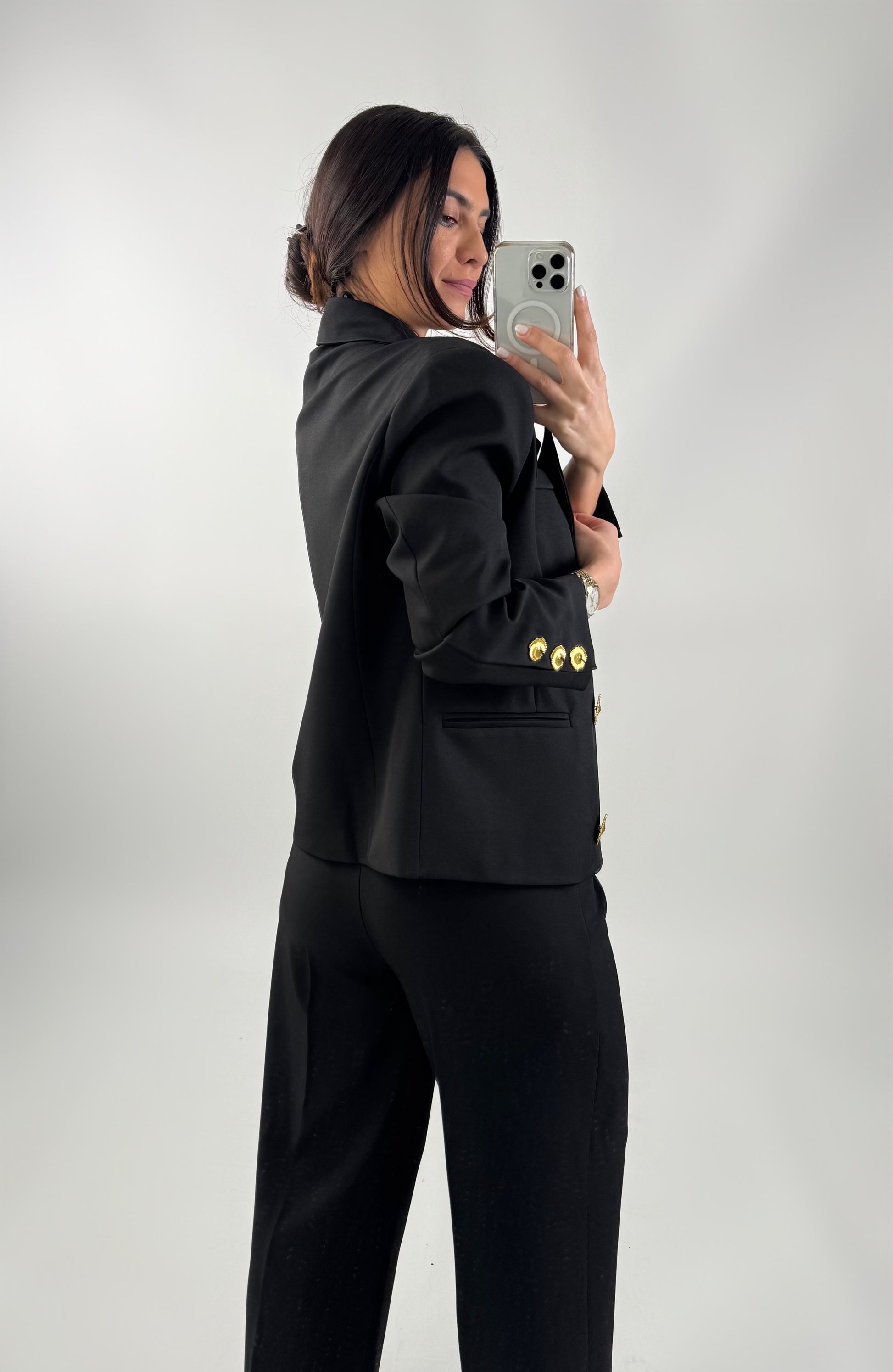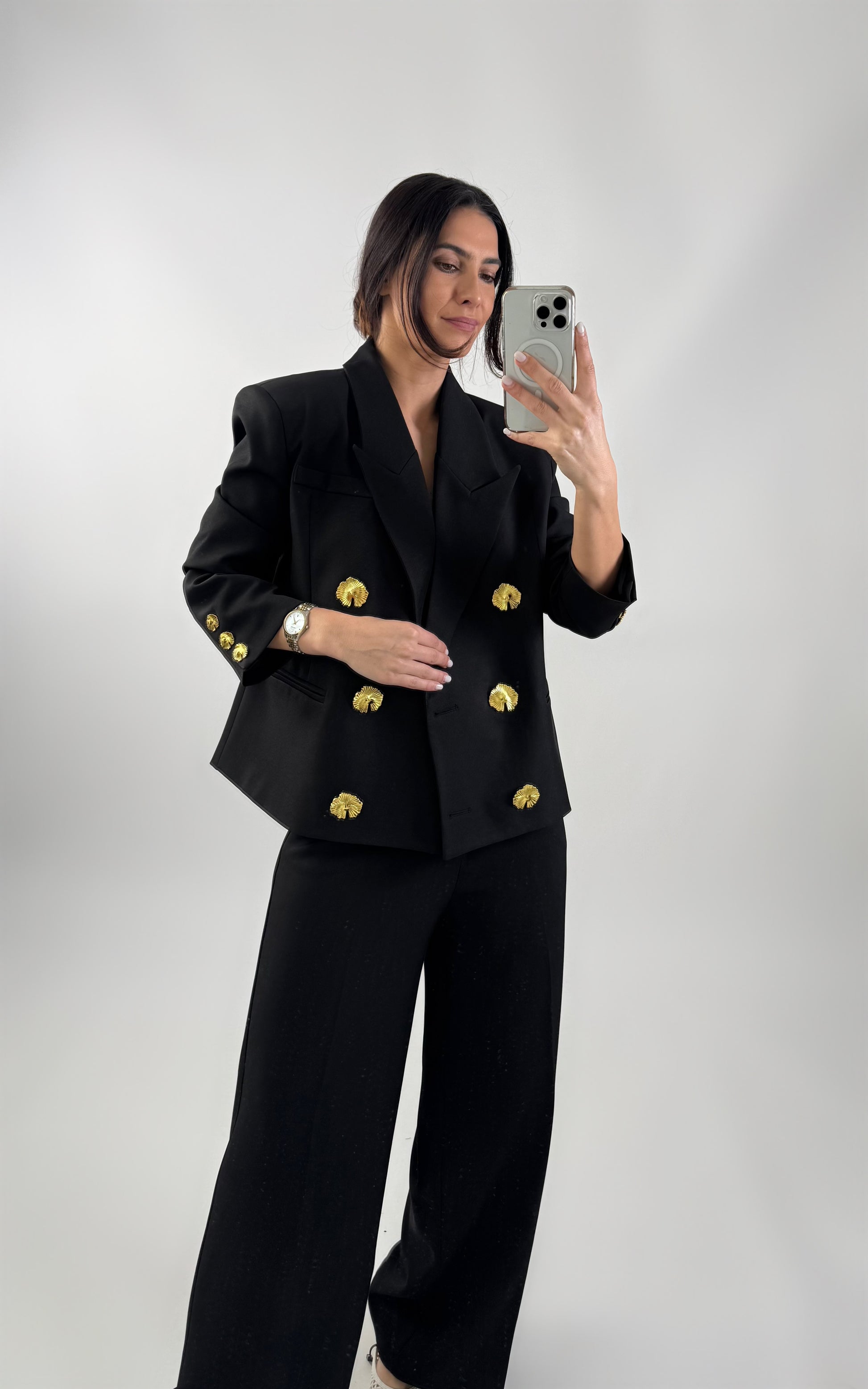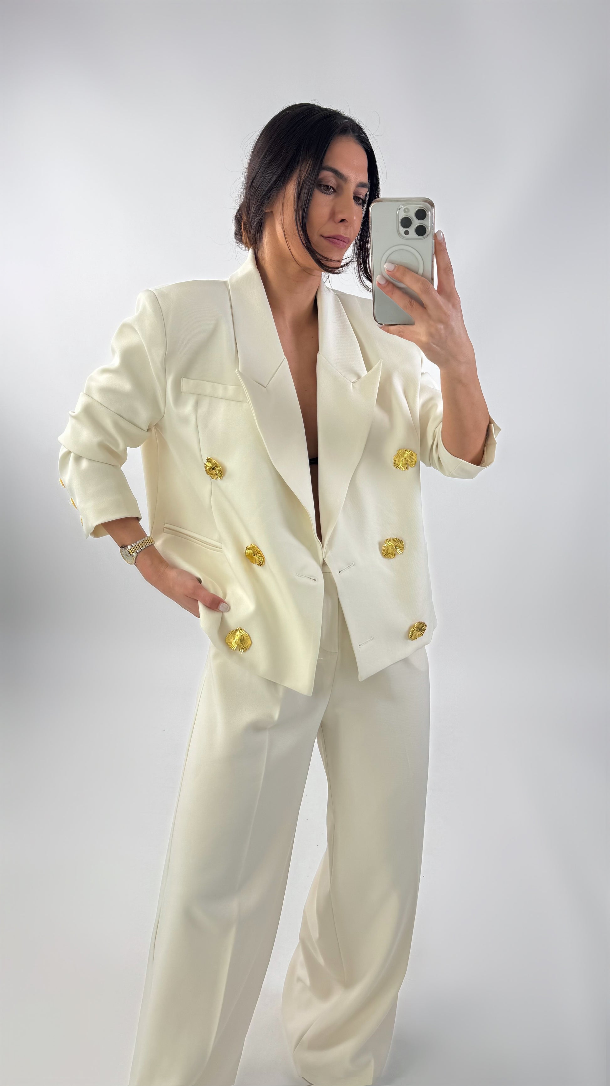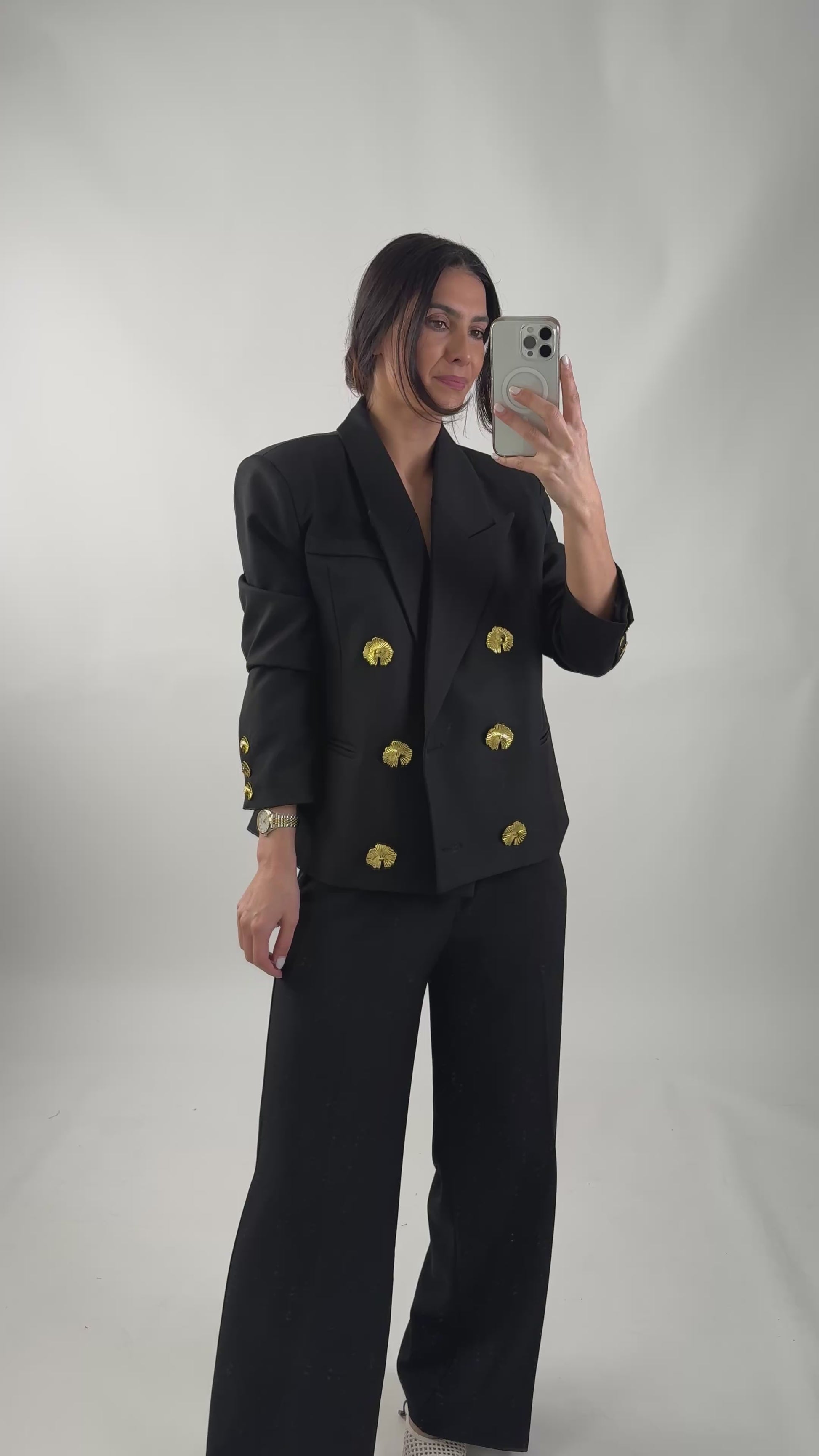 Rechte blazer met een oversized effect. Gevoerd, met schoudervullingen en zakken. Sluit met reliëf, goudkleurige knopen. One size fits all. S naar de L.