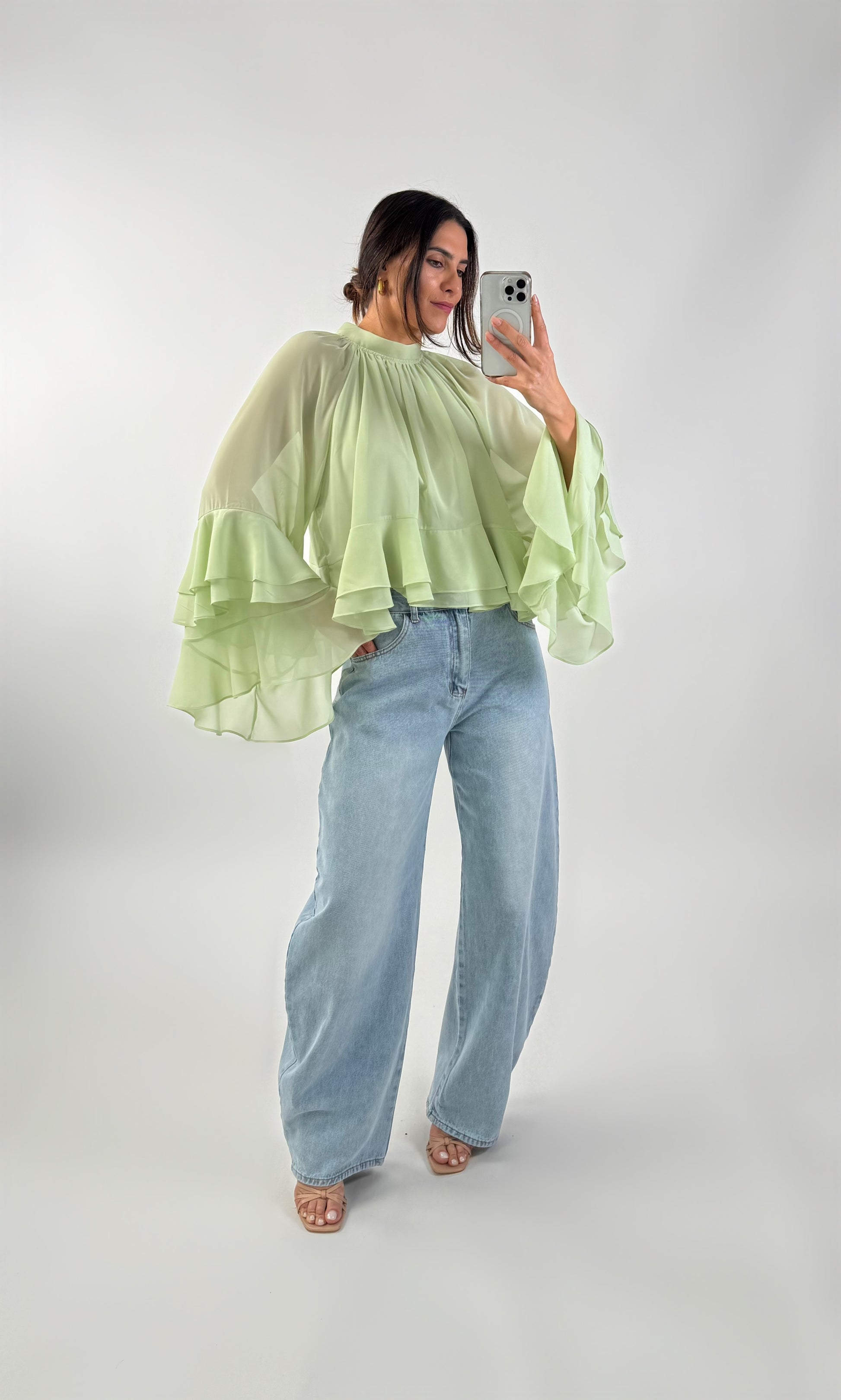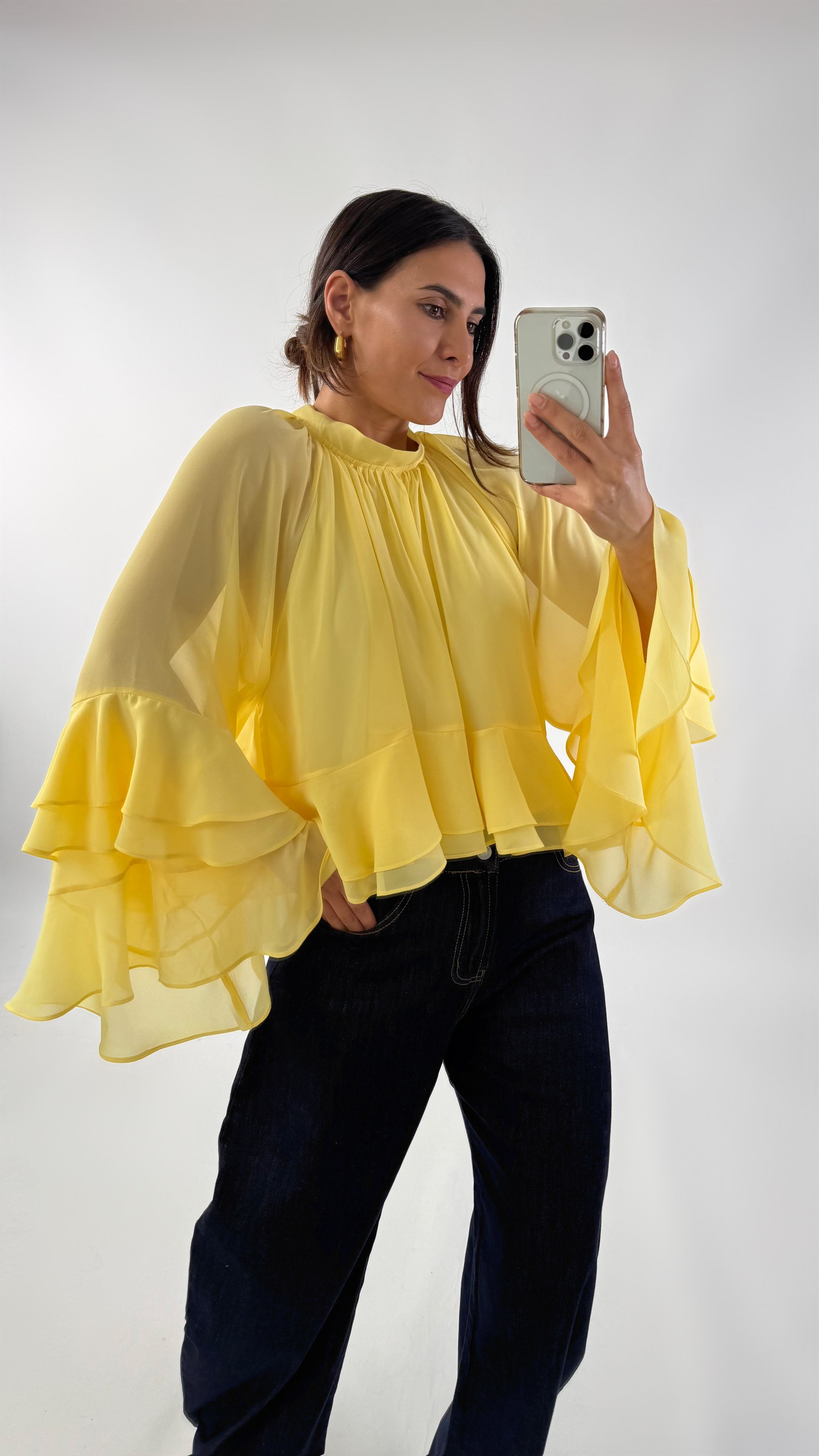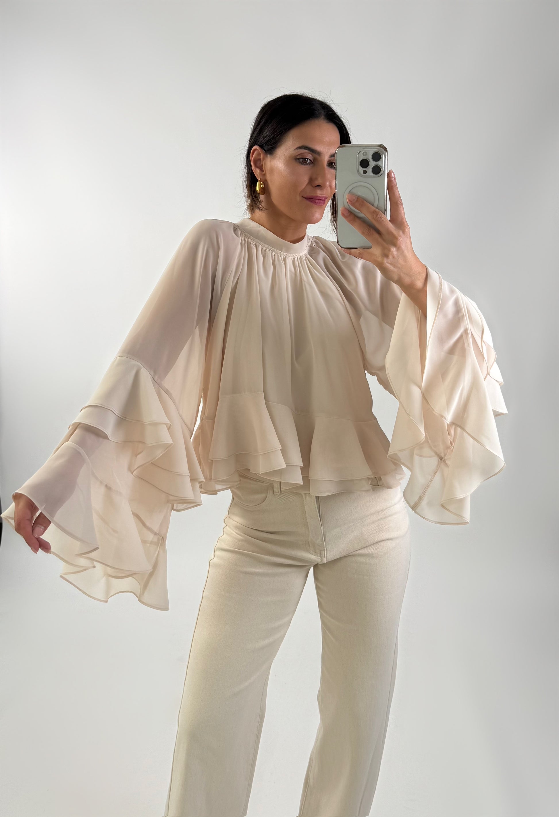 Blouse met geplooide kraag en lange mouwen. Geplooide rand. Gevoerd.
