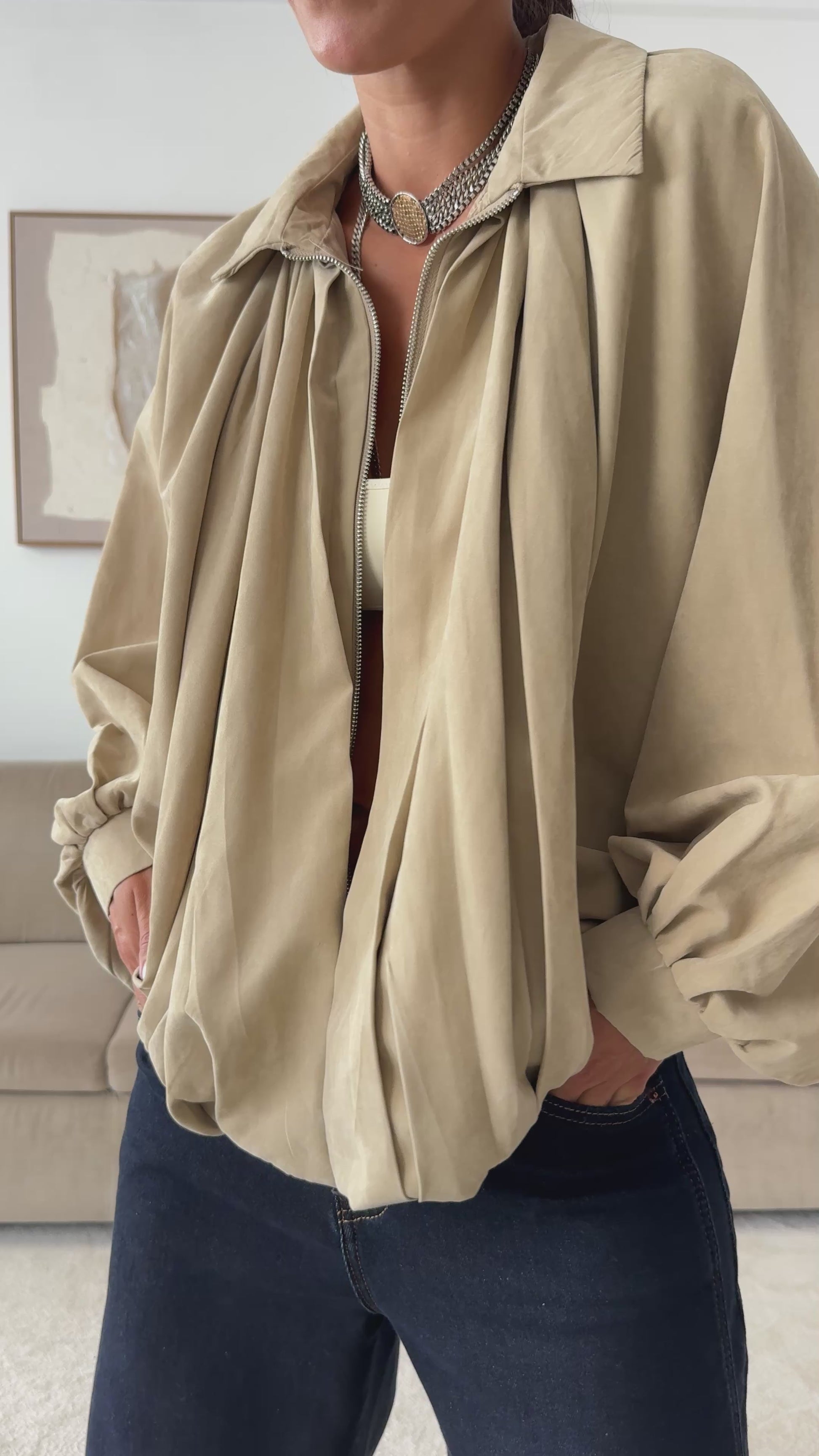 Blusão abalonado em tecido pele pêssego com design moderno, gola clássica e bolsos laterais. Fecho em zíper frontal e mangas estilo morcego com punhos.