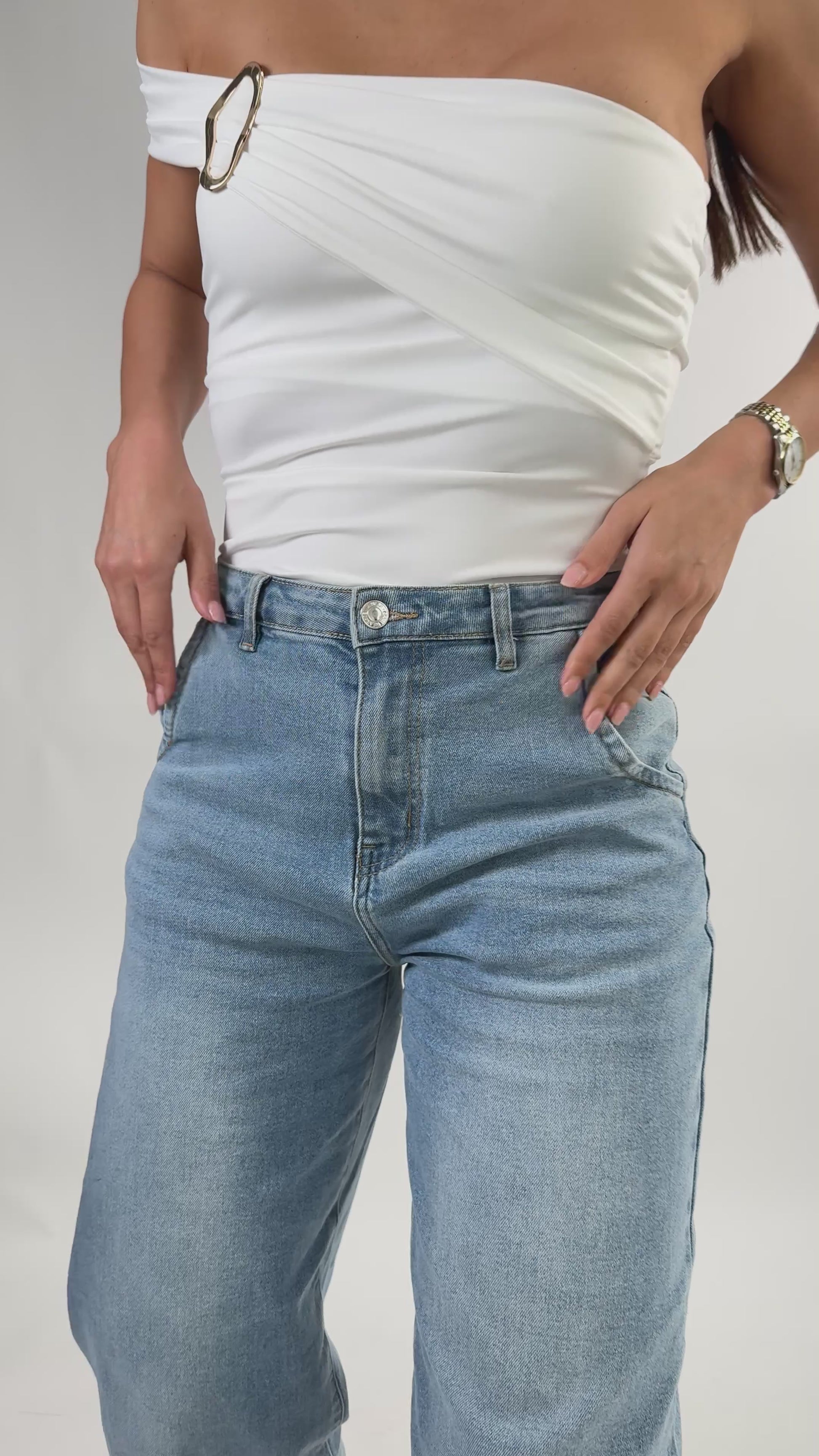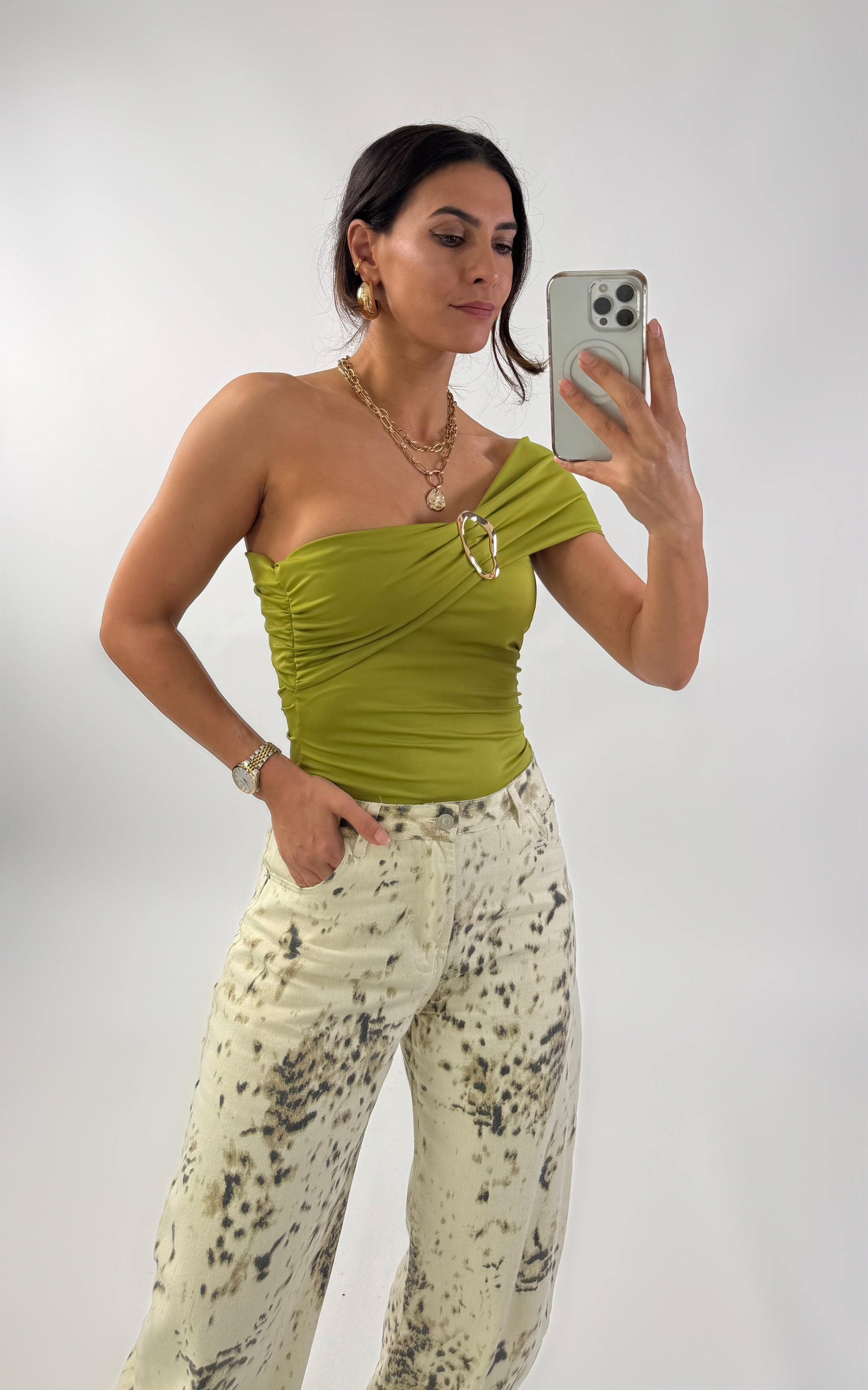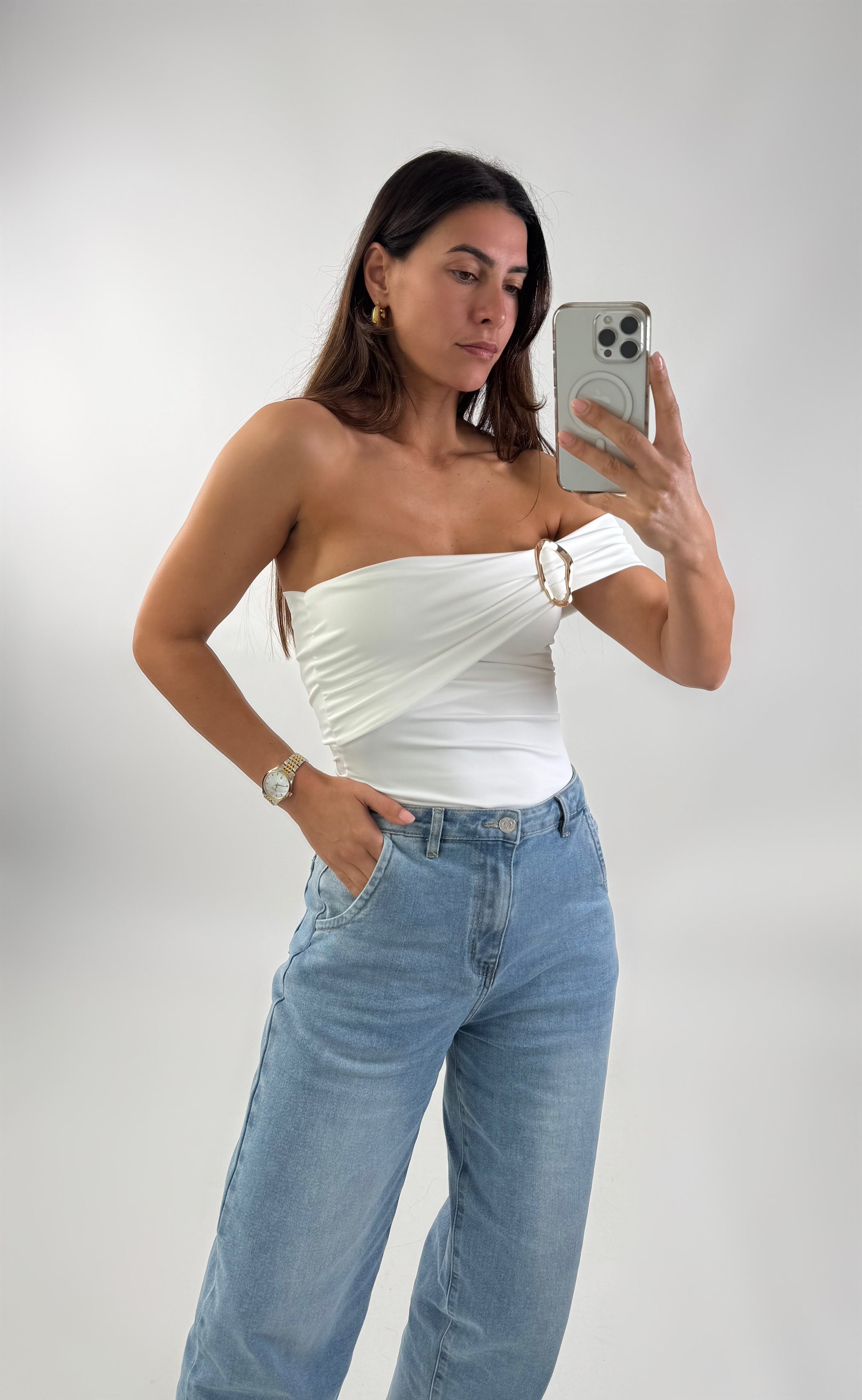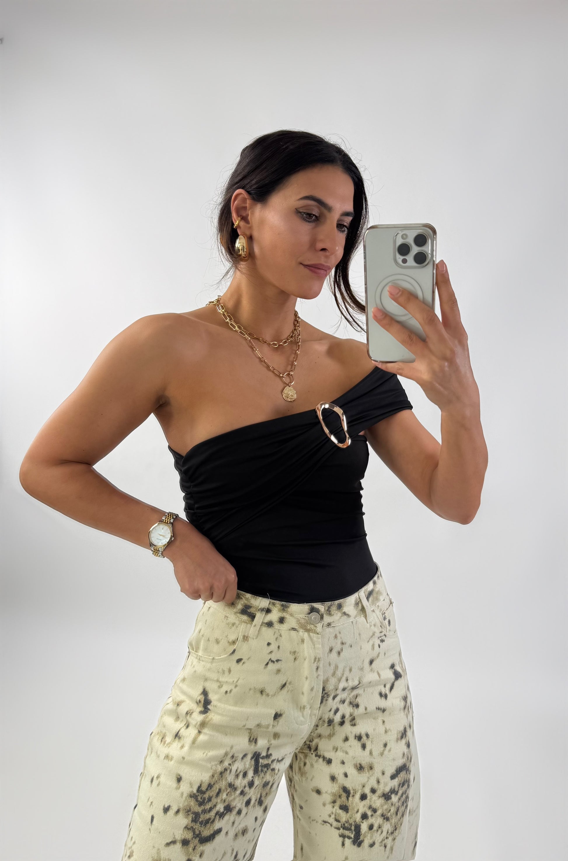 Rekbaar lycra bodysuit. Brede, afneembare bandjes met een gouden hanger, dubbellaagse stof op de borst, elastische rug en haak-en-oogsluiting.