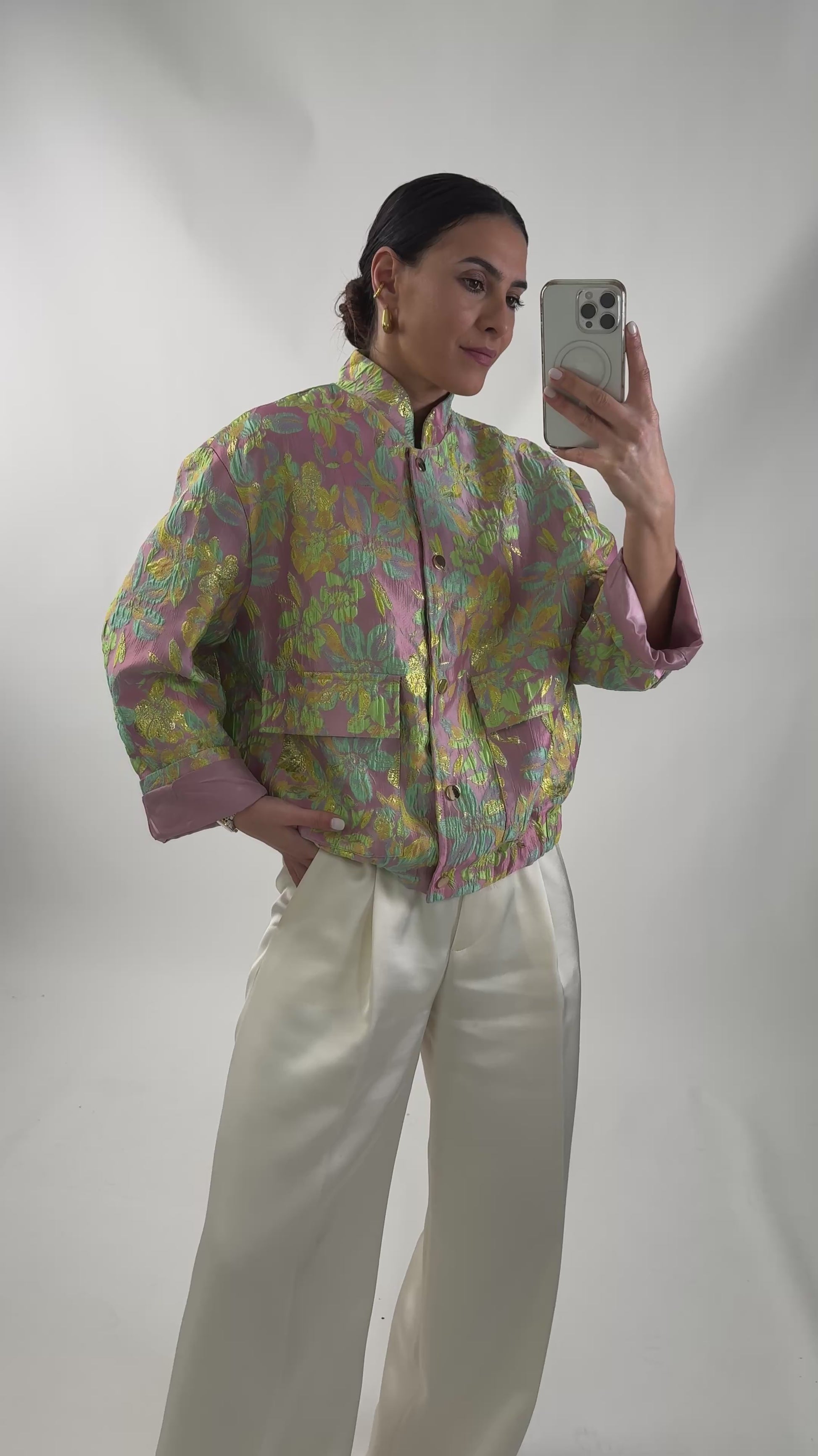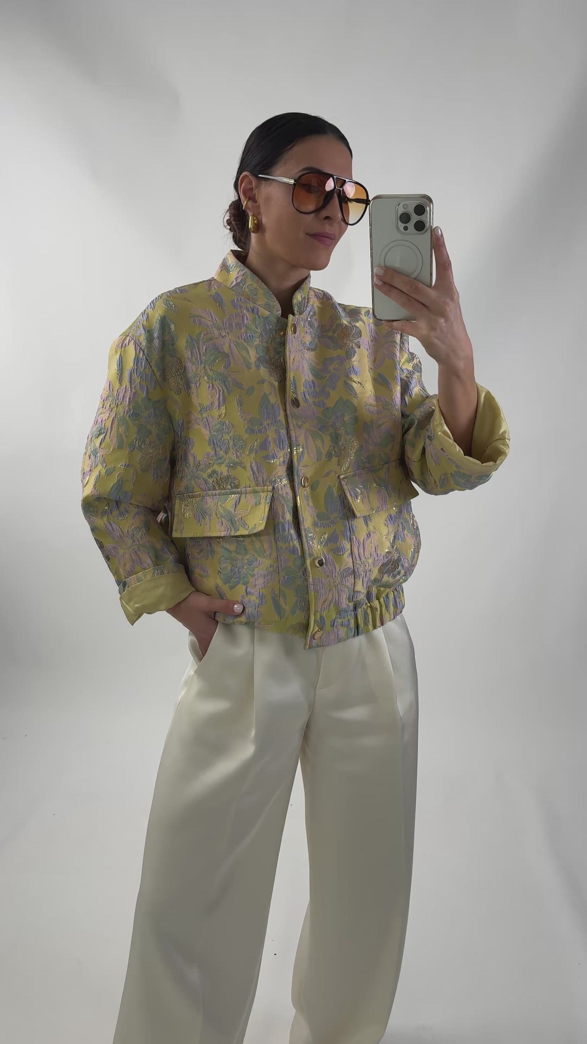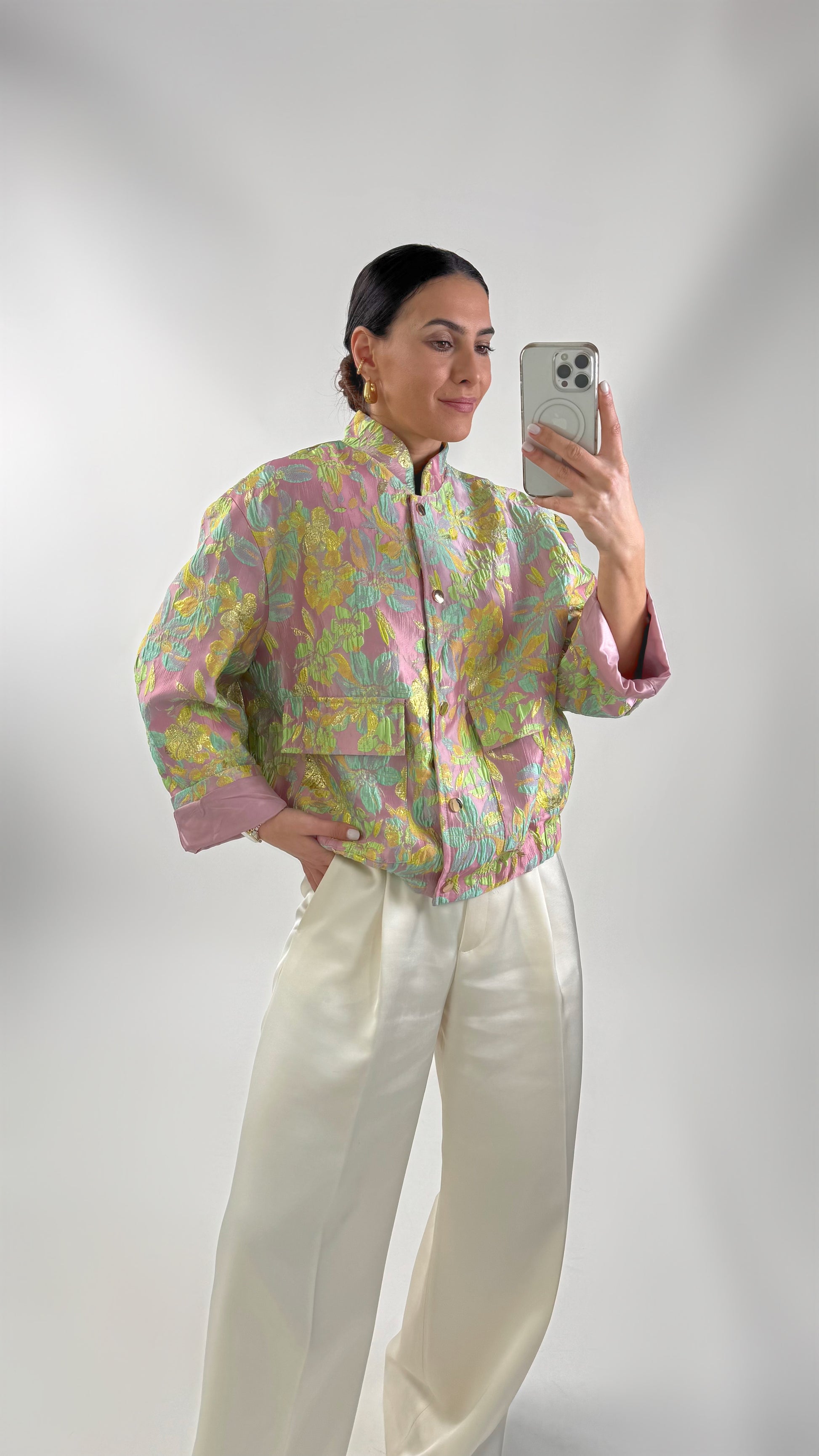 Bedrukt bomberjack van structuurstof. Het heeft een elastische tailleband, een gekleurde voering, een halve kraag, een drukknoopsluiting en zakken aan de voorkant.