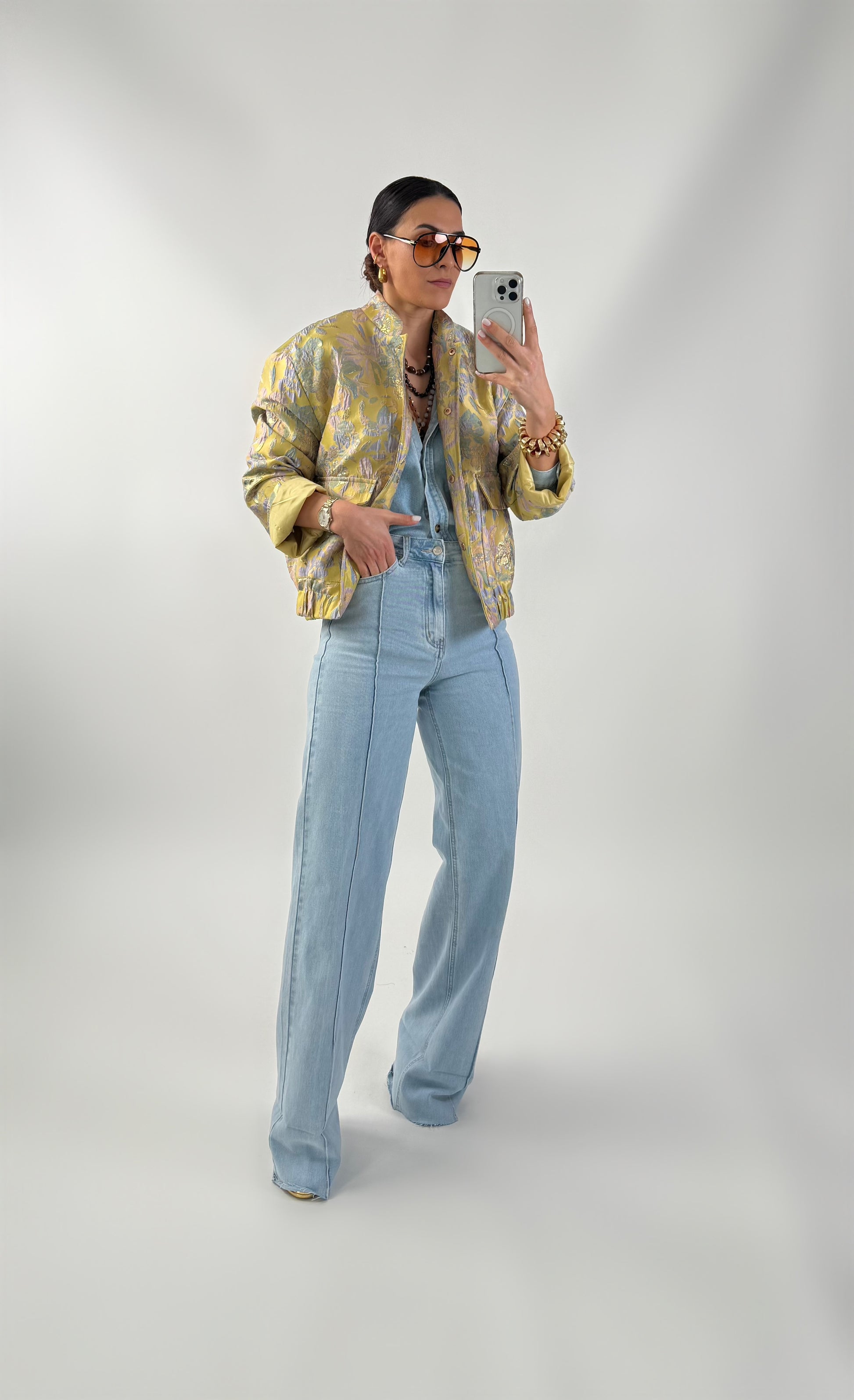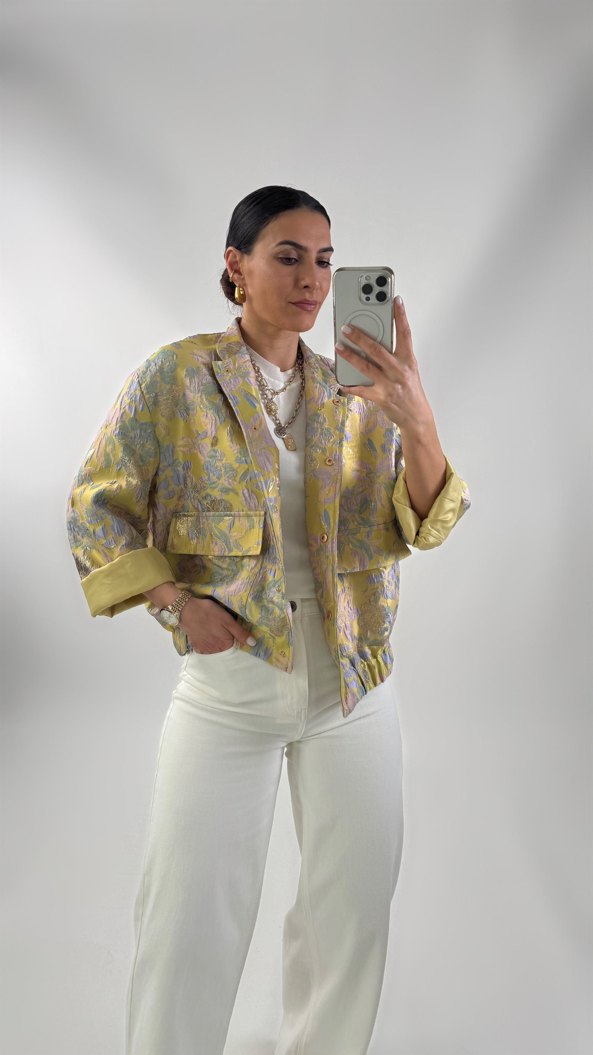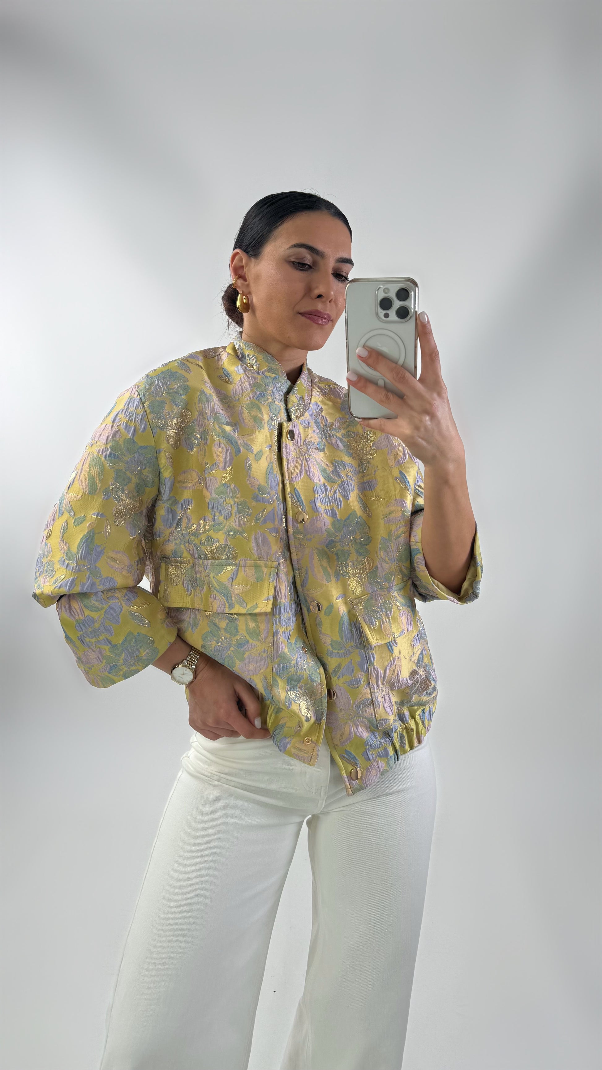 Bedrukt bomberjack van structuurstof. Het heeft een elastische tailleband, een gekleurde voering, een halve kraag, een drukknoopsluiting en zakken aan de voorkant.
